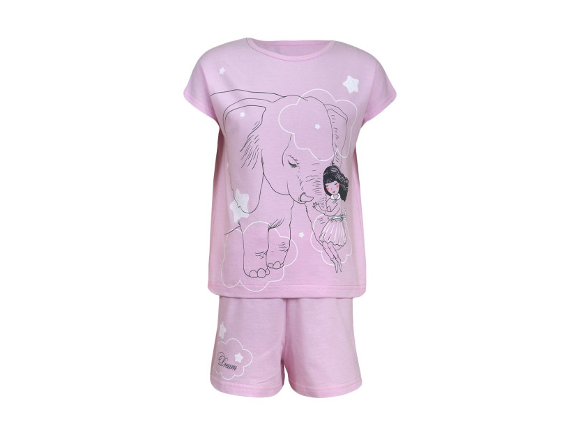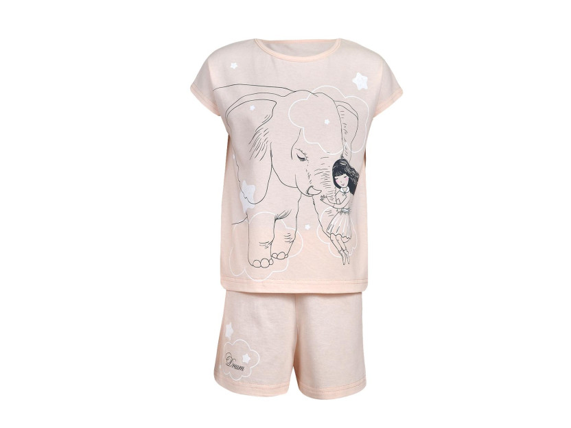 Пижама. Кулирное полотно:100% х/б. Фуфайка-с цельнокроеным,коротким рукавом.Перед с печатью.Горловина окантована,низ подшит. Шорты-короткие,на резинке.