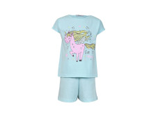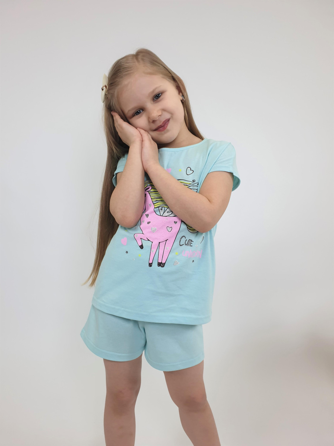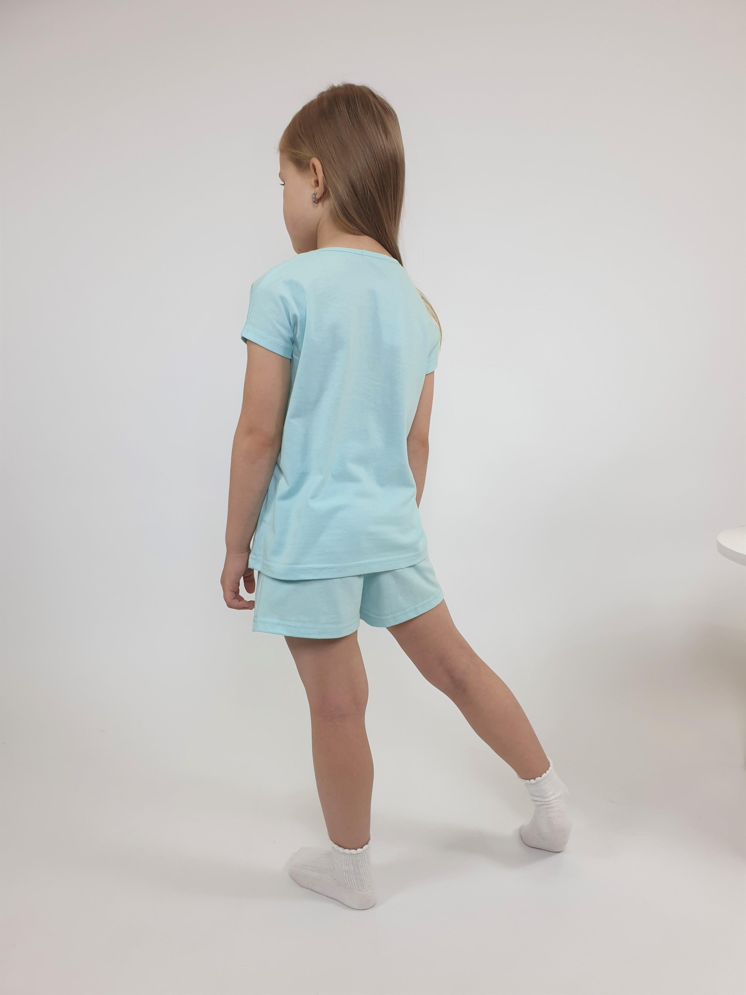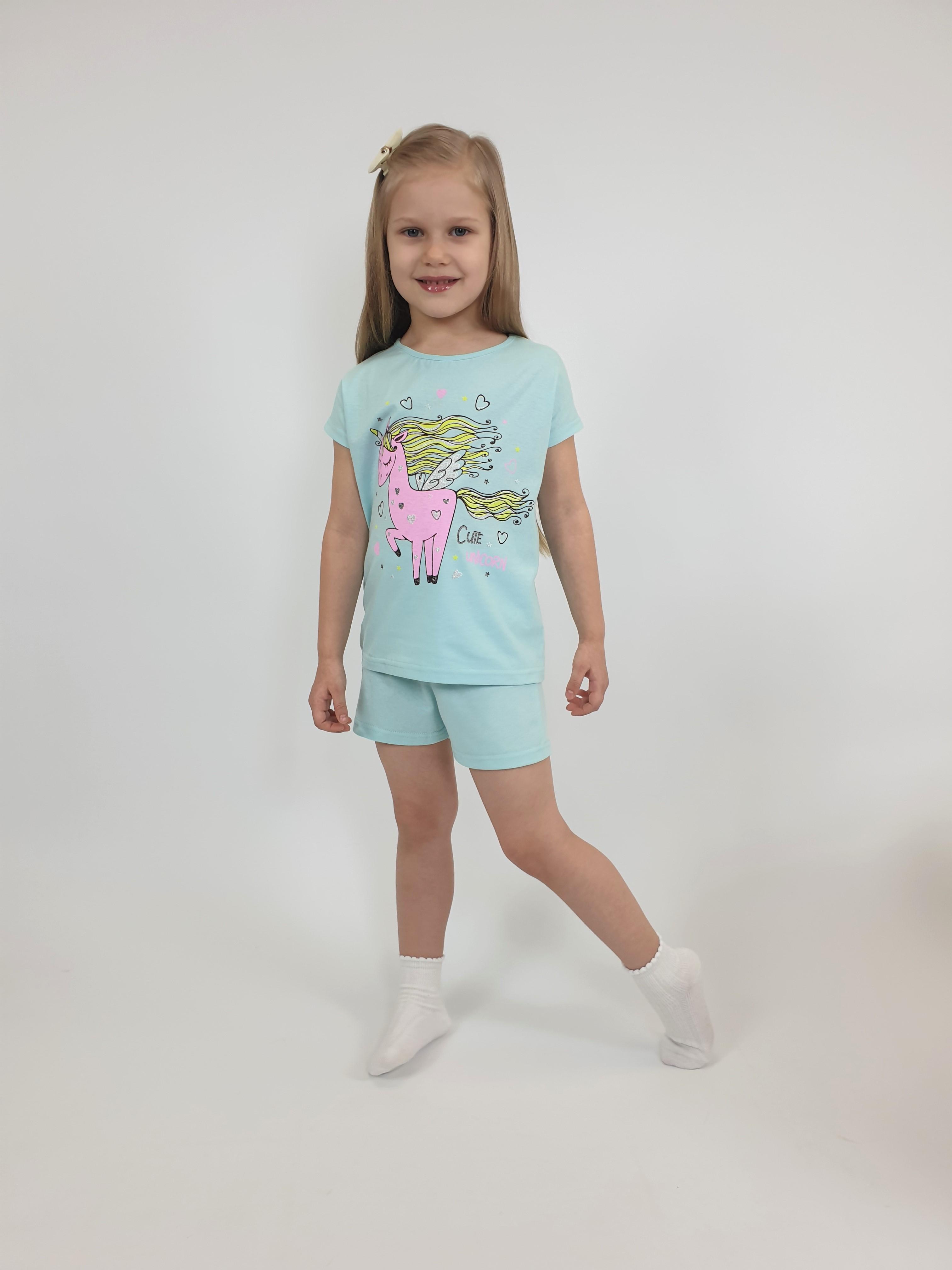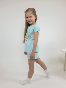 Кулирное полотно:100% х/б. Фуфайка-с цельнокроенным,коротким рукавом.Перед с печатью.Горловина окантована,низ подшит. Шорты-короткие,на резинке.