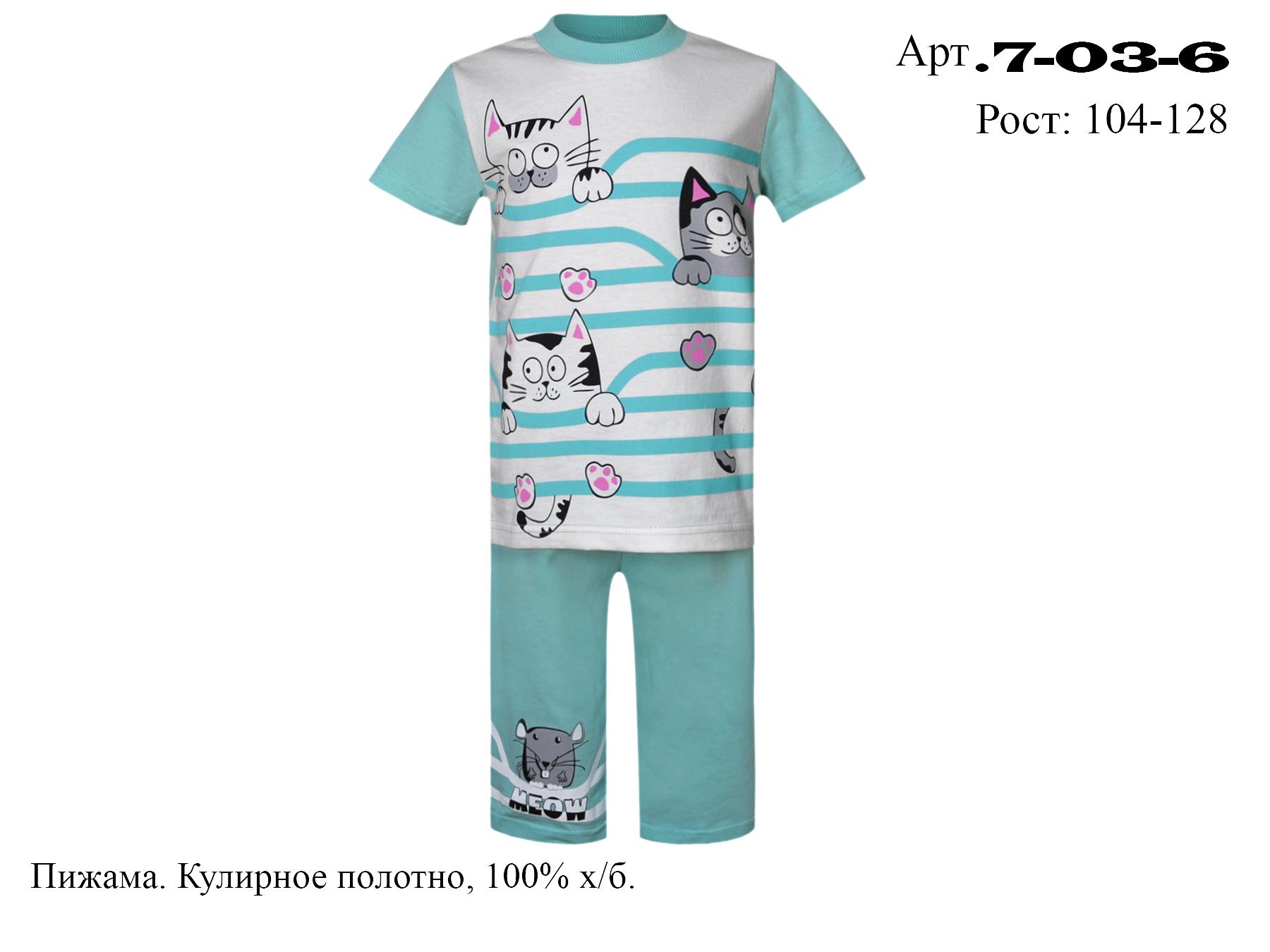 Пижама. Кулирное полотно, 100% х/б. Фуфайка – печать по переду. Рукав втачной, короткий. Горловина обработана ластиком. Брюки прямые, укороченные. Верхний срез подшит с резинкой. На правой половинке переда печать. Низ изделия подшит.