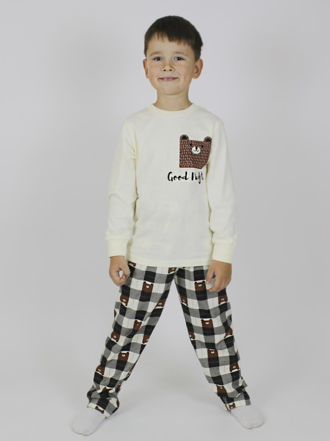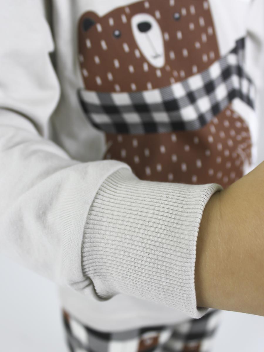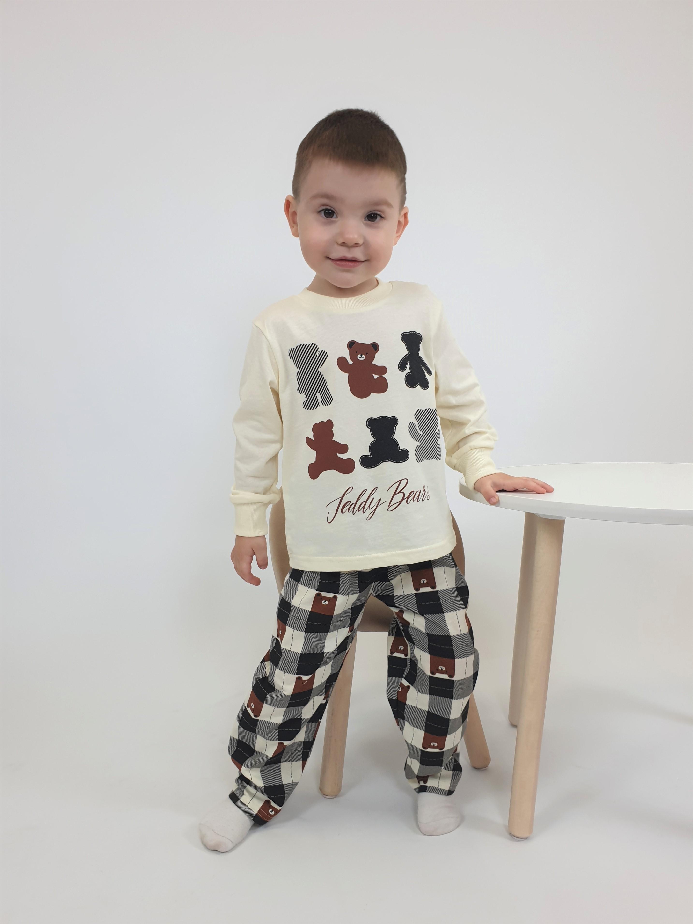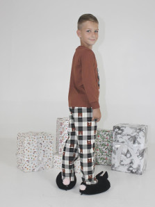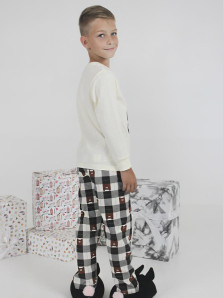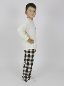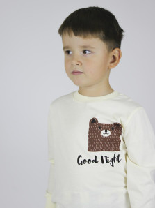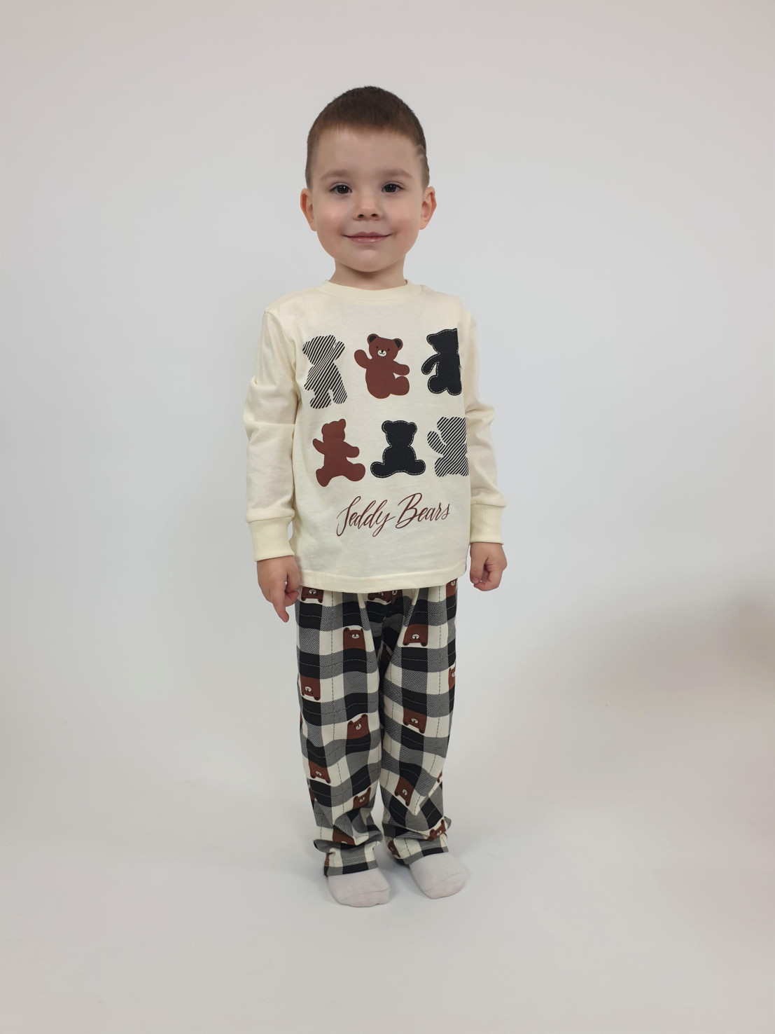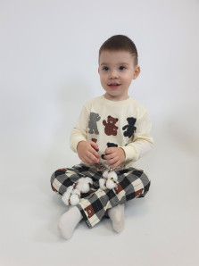 Кулирное полотно:(гладь+набивка):100% х/б. Фуфайка-прямая,рукав втачной,длинный на манжете из ластика.Печать на переде.Горловина обработана ластиком. Брюки-длинные прямые,верхний срез подшит с резинкой.