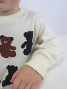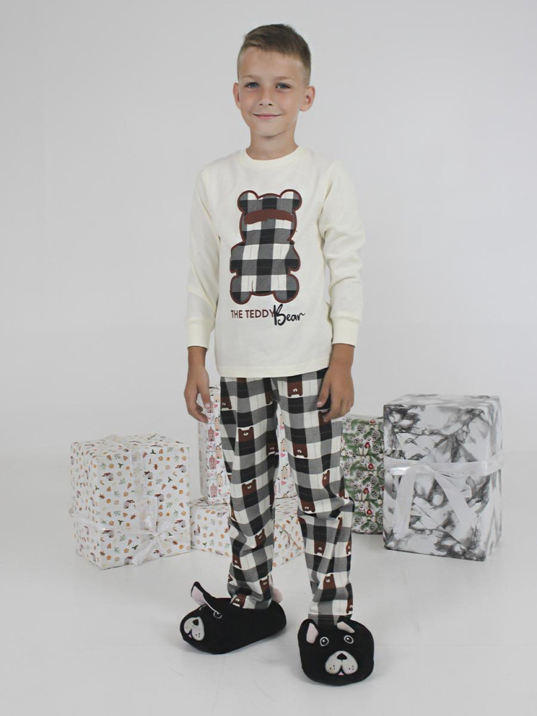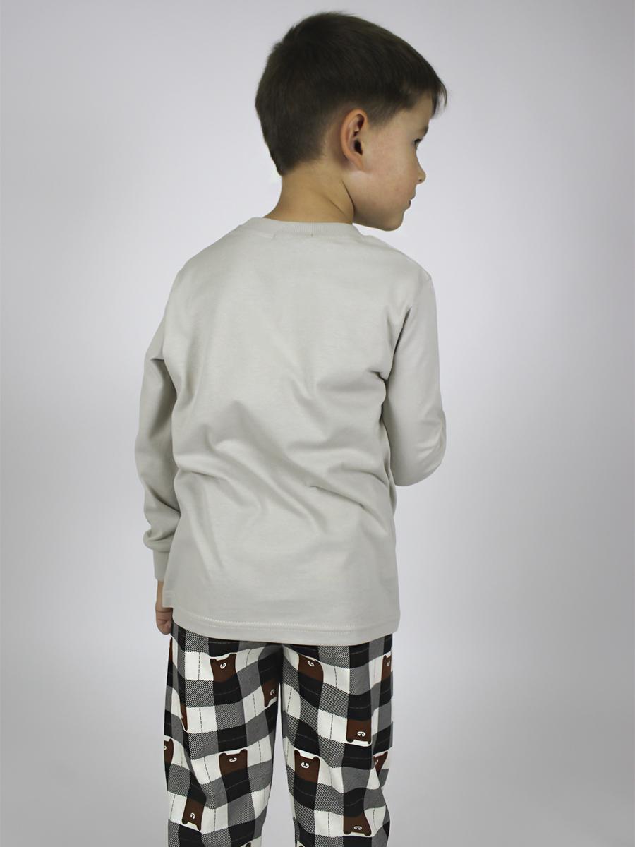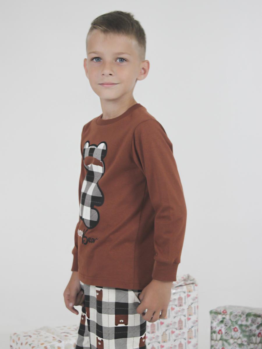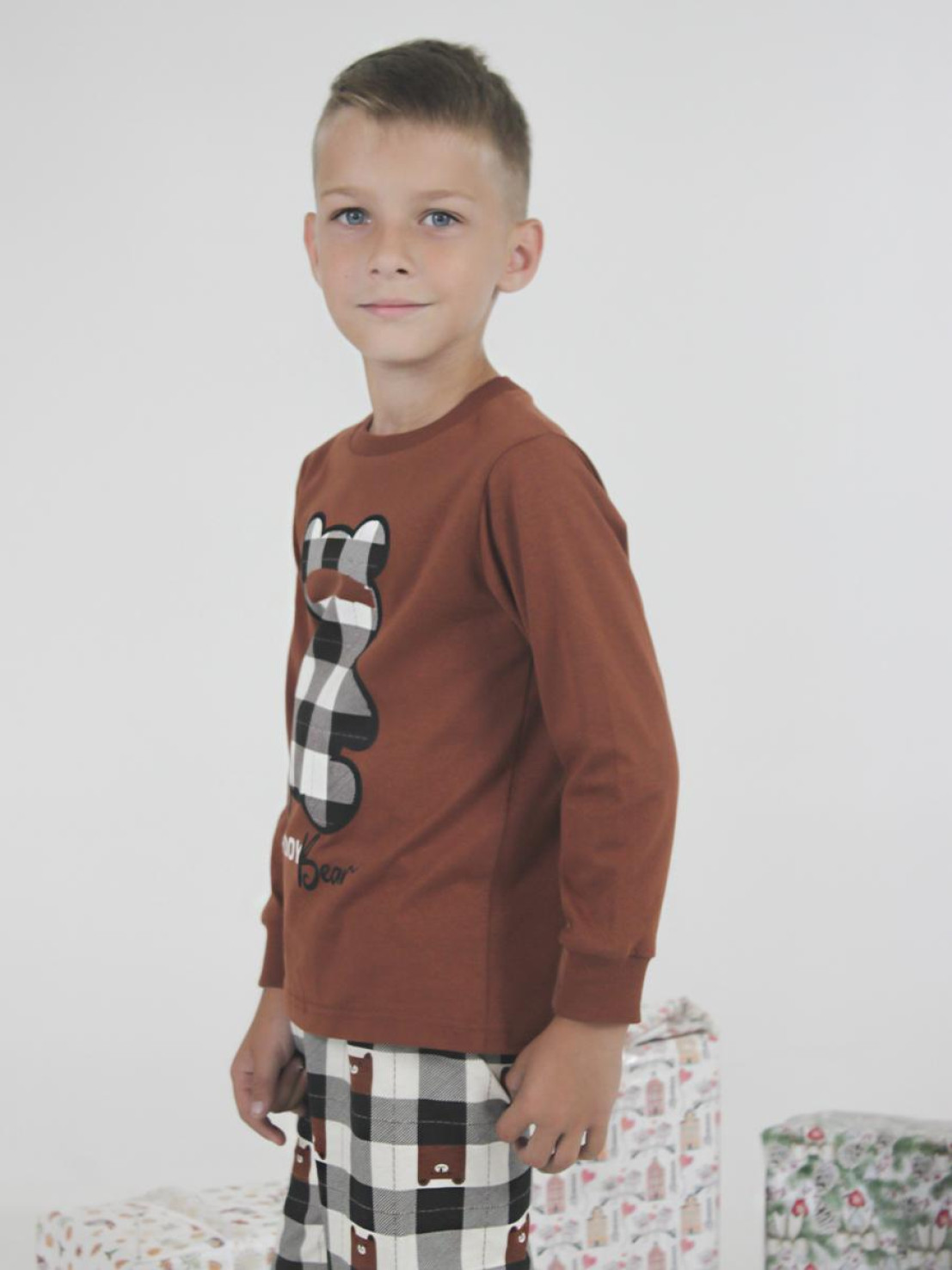Кулирное полотно:(гладь+набивка):100% х/б. Фуфайка-прямая,рукав втачной,длинный на манжете из ластика.Печать на переде.Горловина обработана ластиком. Брюки-длинные прямые,верхний срез подшит с резинкой.