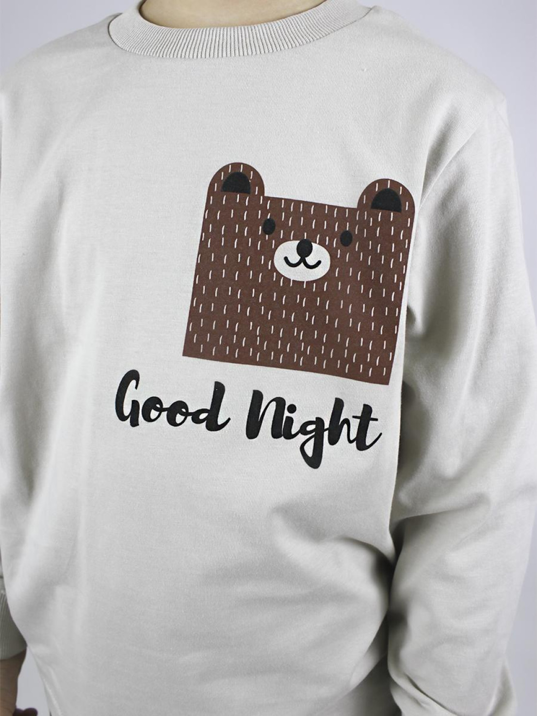 Кулирное полотно:(гладь+набивка):100% х/б. Фуфайка-прямая,рукав втачной,длинный на манжете из ластика.Печать на переде.Горловина обработана ластиком. Брюки-длинные прямые,верхний срез подшит с резинкой.