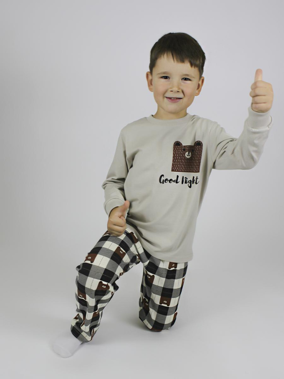 Кулирное полотно:(гладь+набивка):100% х/б. Фуфайка-прямая,рукав втачной,длинный на манжете из ластика.Печать на переде.Горловина обработана ластиком. Брюки-длинные прямые,верхний срез подшит с резинкой.