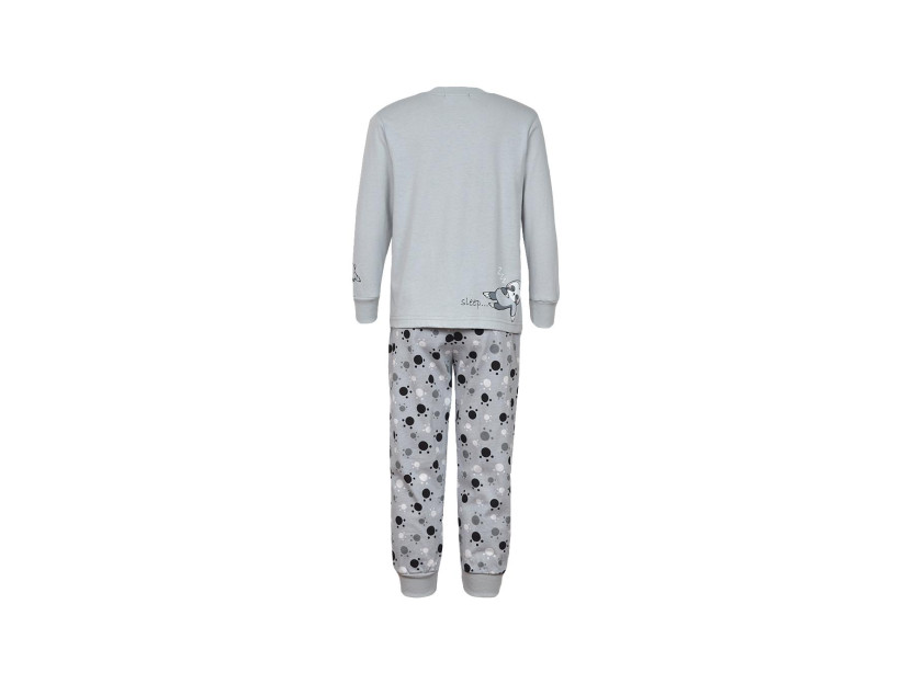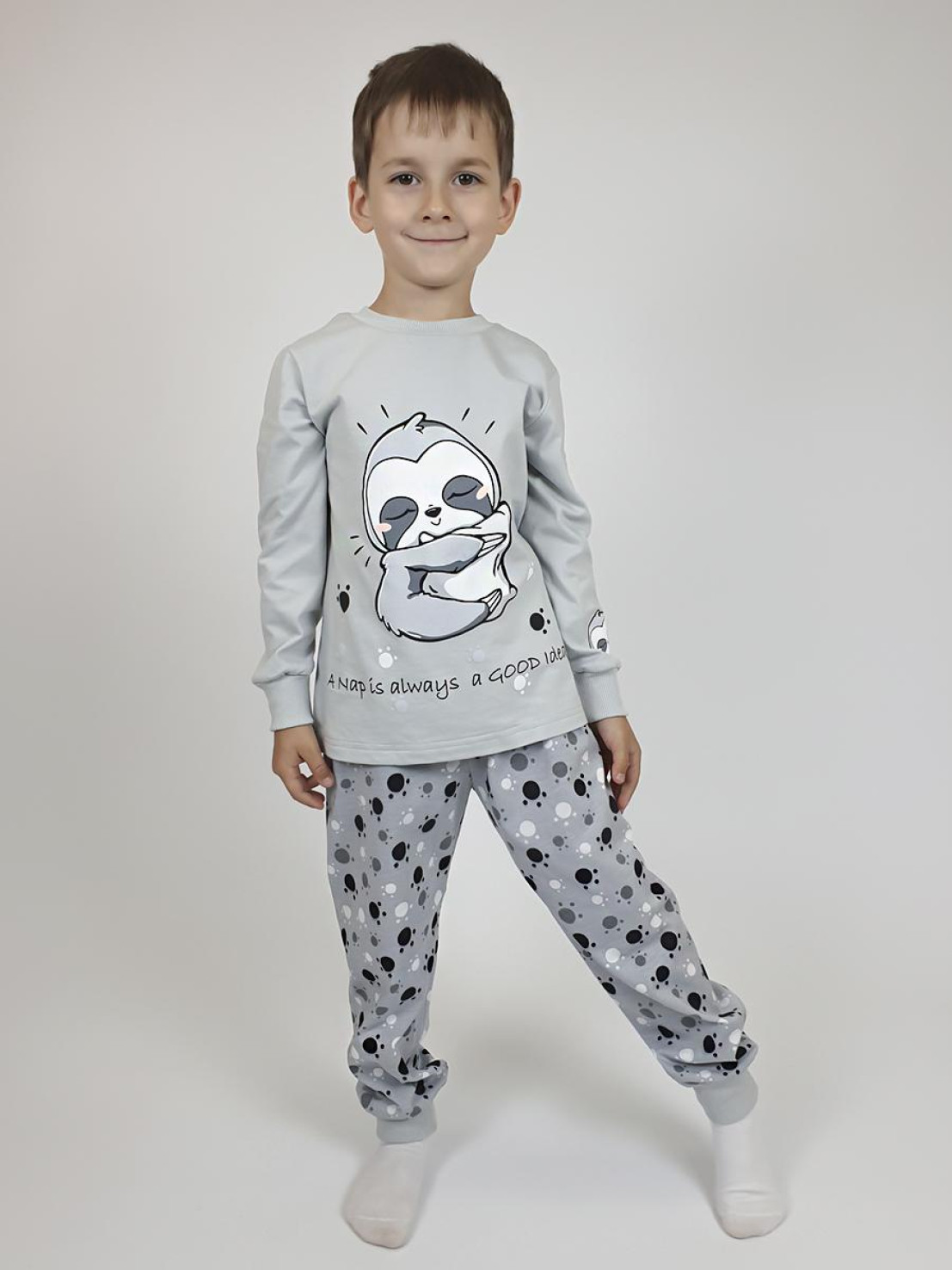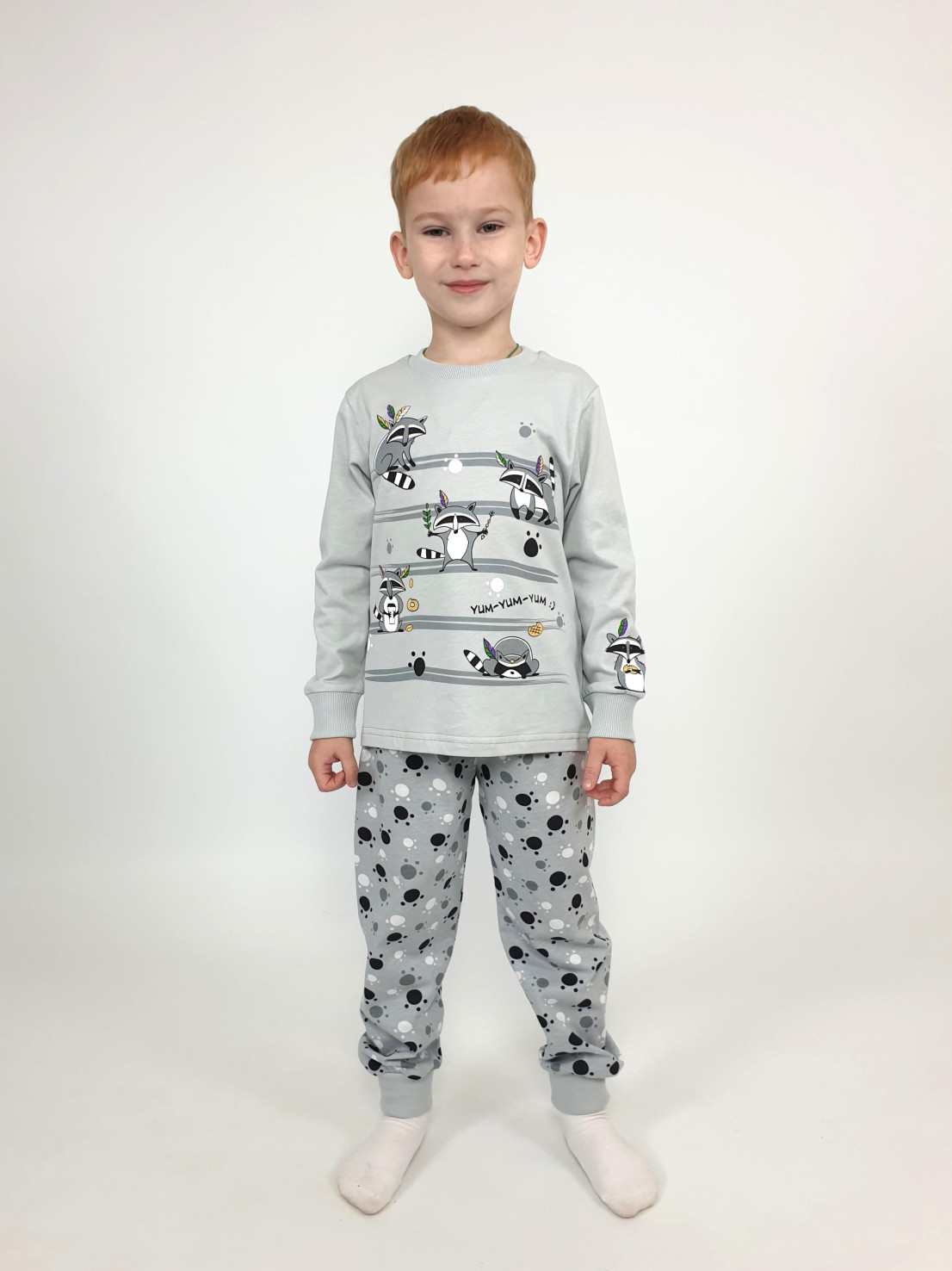 Кулирное полотно:100%х/б. Фуфайка-прямая,рукав втачной,длинный на манжете из ластика.Горловина обработана ластиком.Печать на переде,спинке и левом рукаве внизу. Брюки-длинные на манжете из ластика.Верхний срез подшит с резинкой.