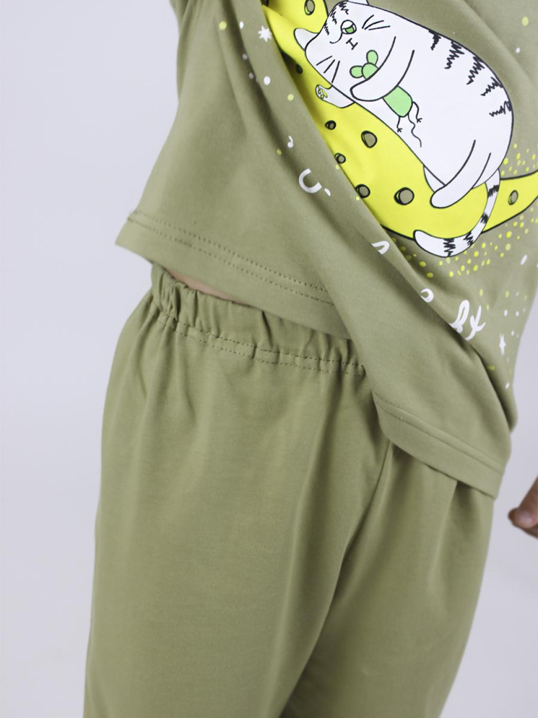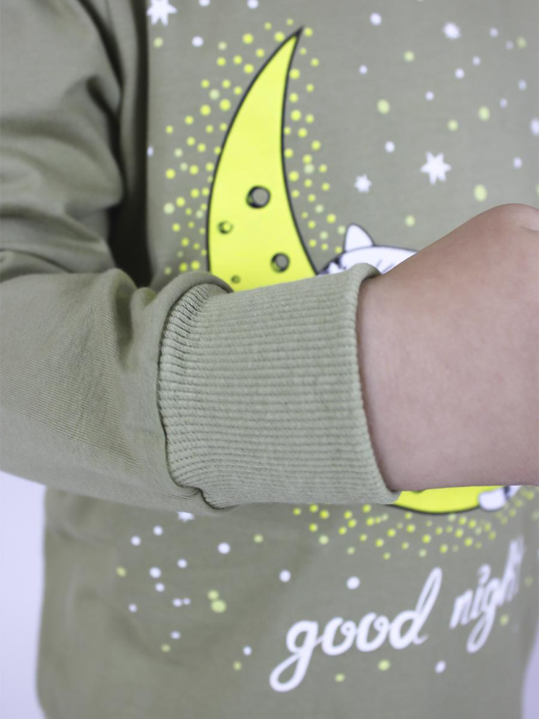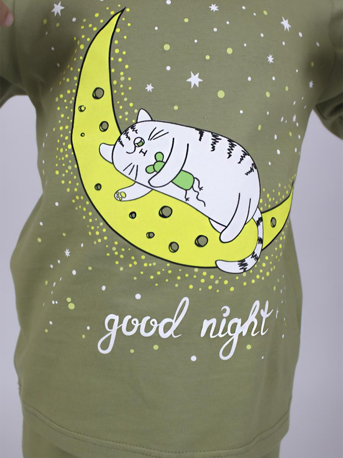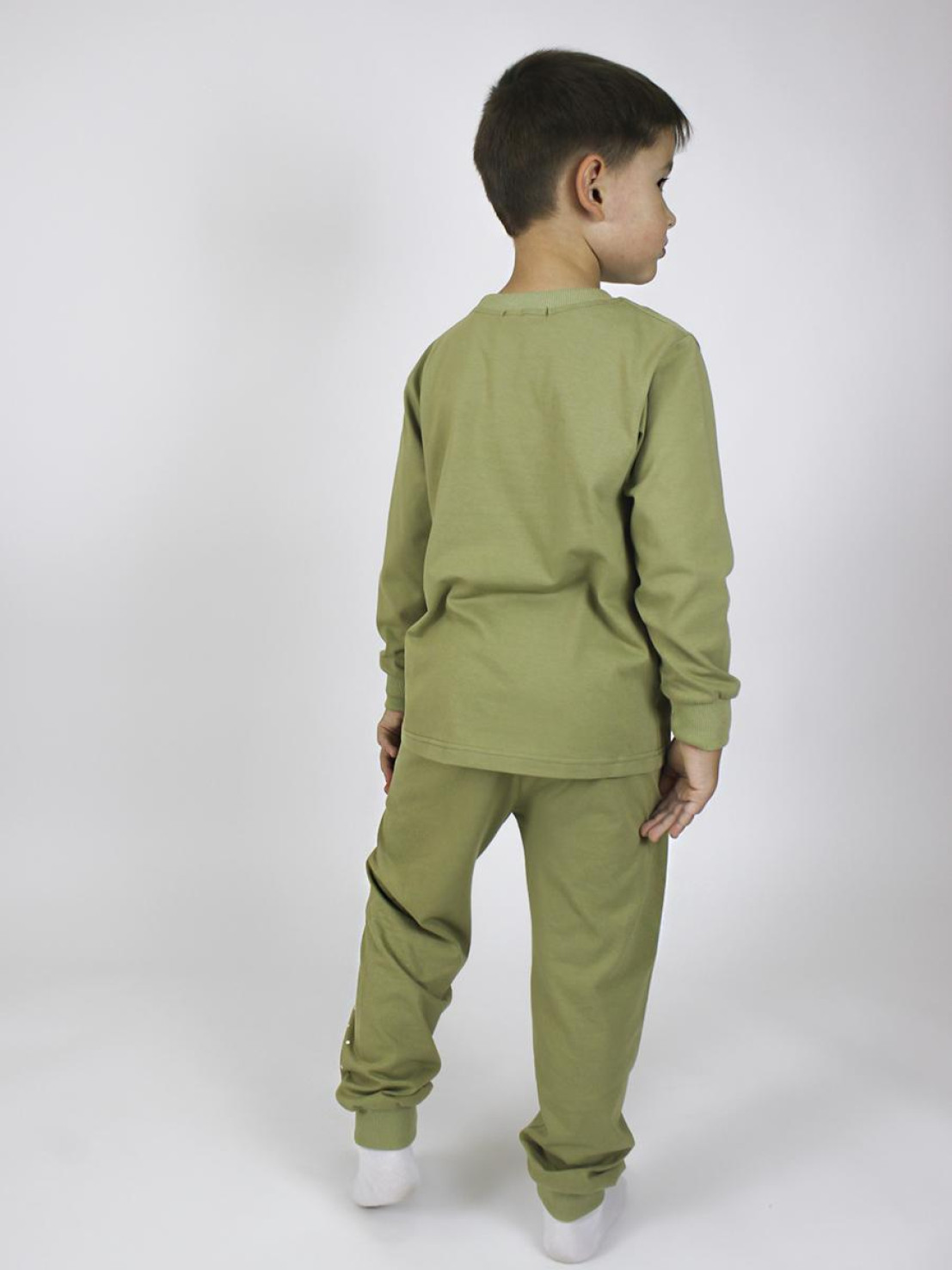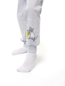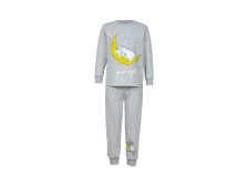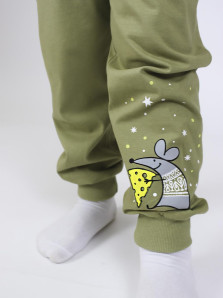 Кулирное полотно:100% х/б. Фуфайка-прямая,рукав втачной,длинный на манжете из ластика.Горловина обработана ластиком.Печать на переде. Брюки-длинные на манжете из ластика.Верхний срез подшит с резинкой.Печать слева,внизу.