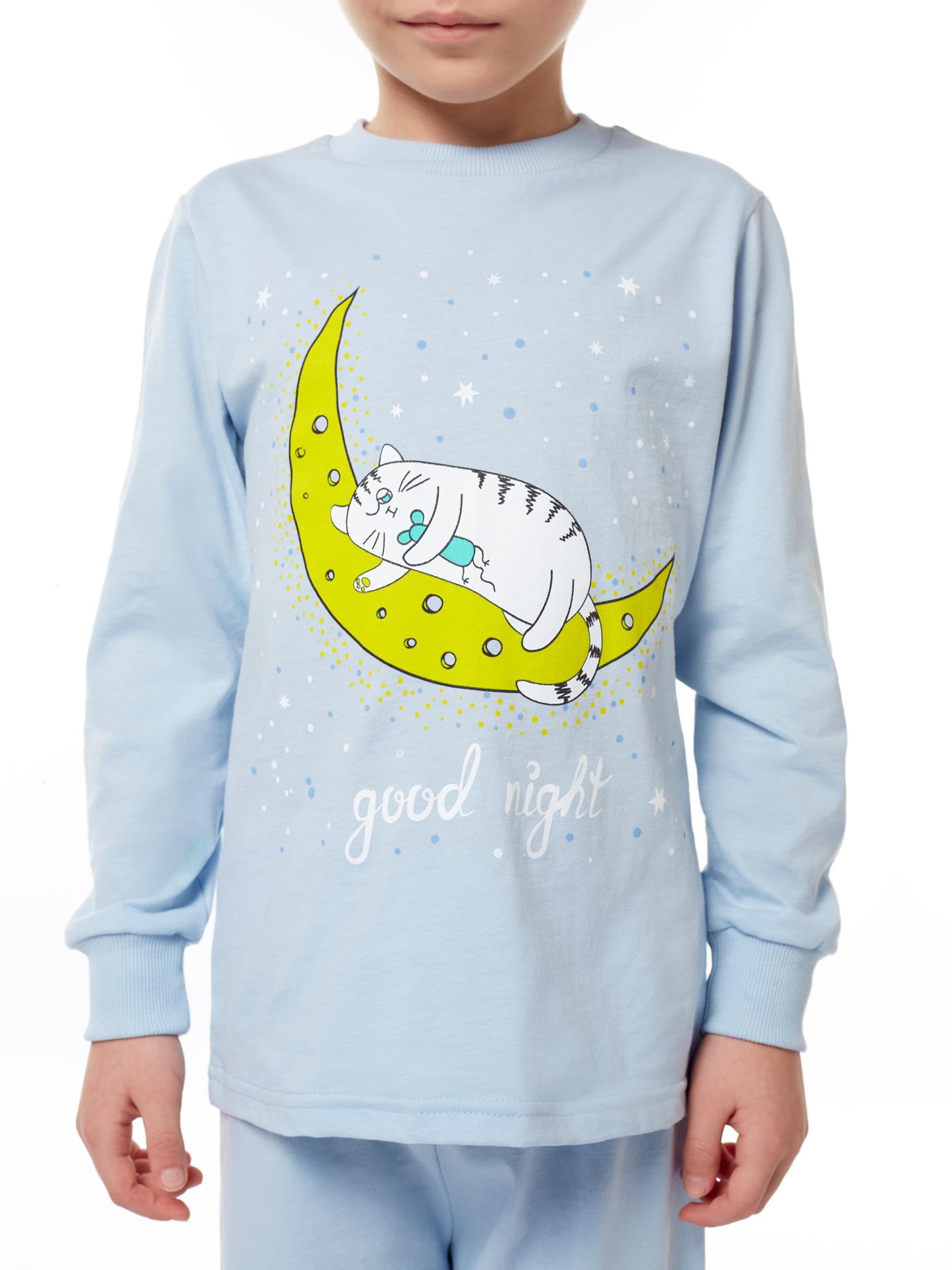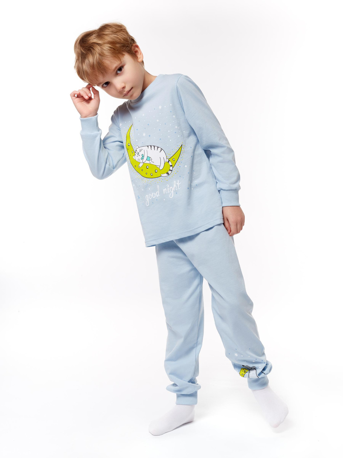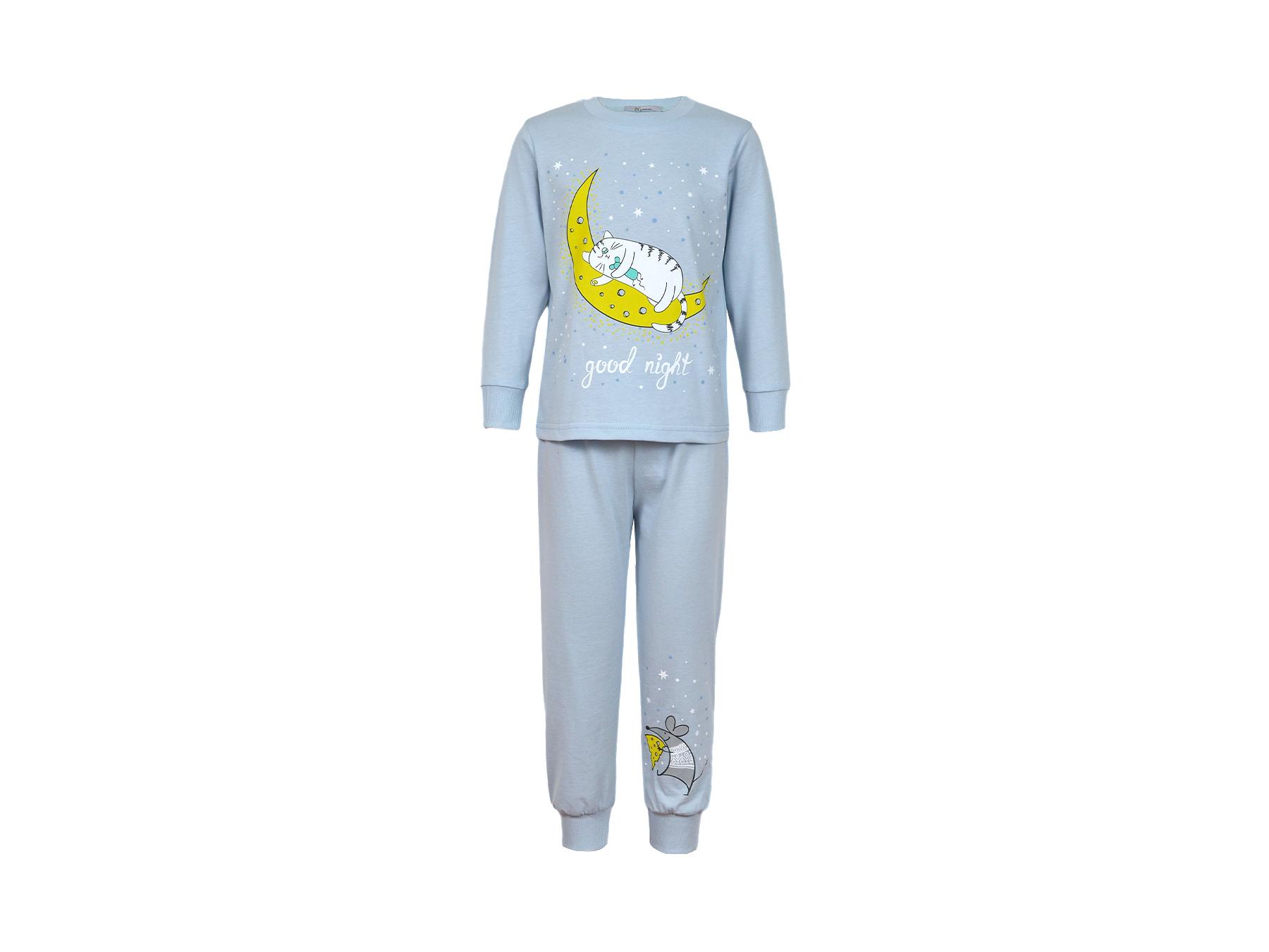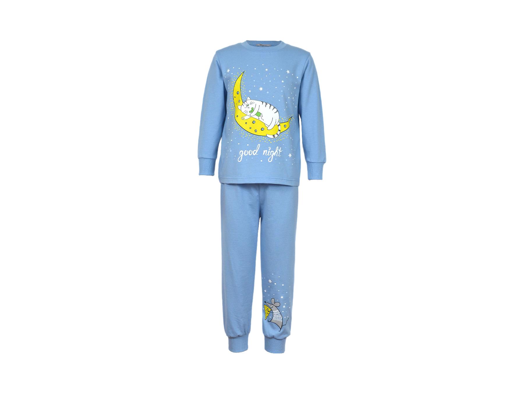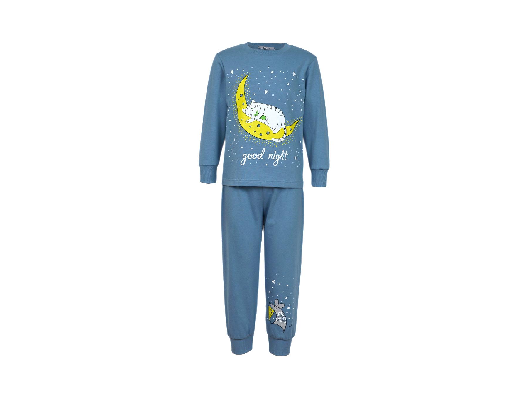 Кулирное полотно:100% х/б. Фуфайка-прямая,рукав втачной,длинный на манжете из ластика.Горловина обработана ластиком.Печать на переде. Брюки-длинные на манжете из ластика.Верхний срез подшит с резинкой.Печать слева,внизу.