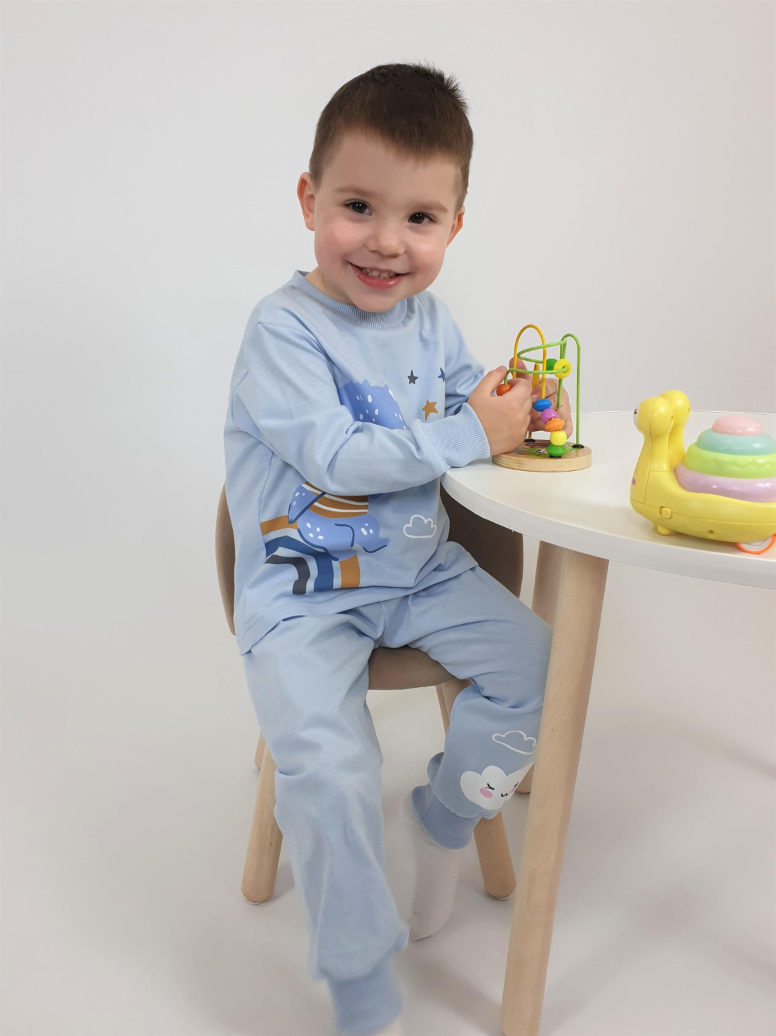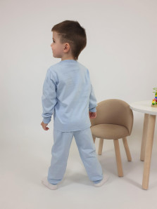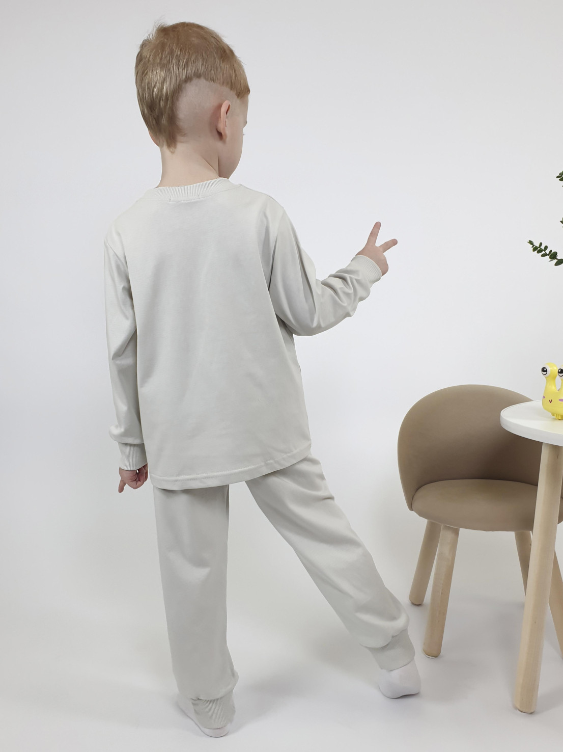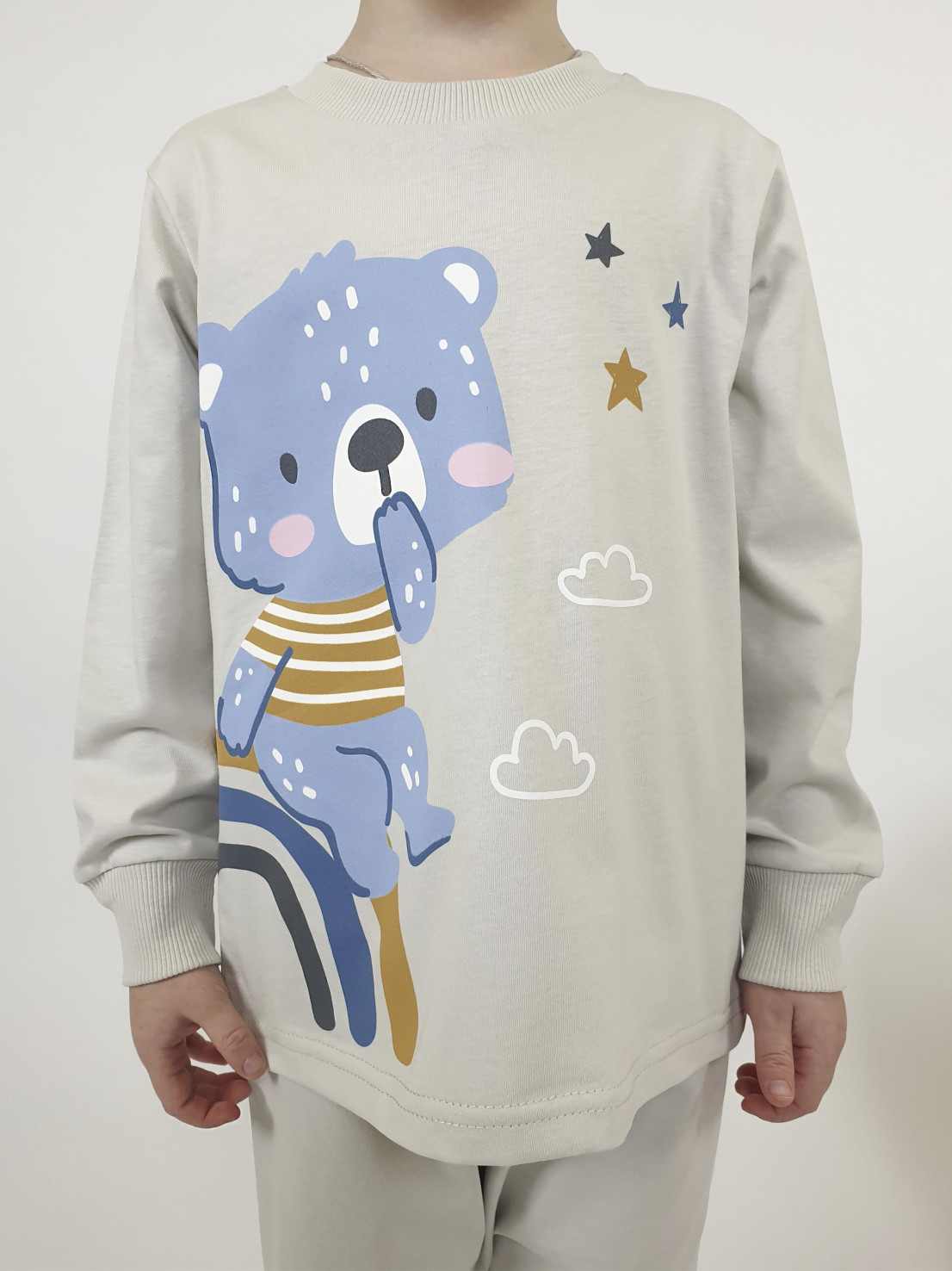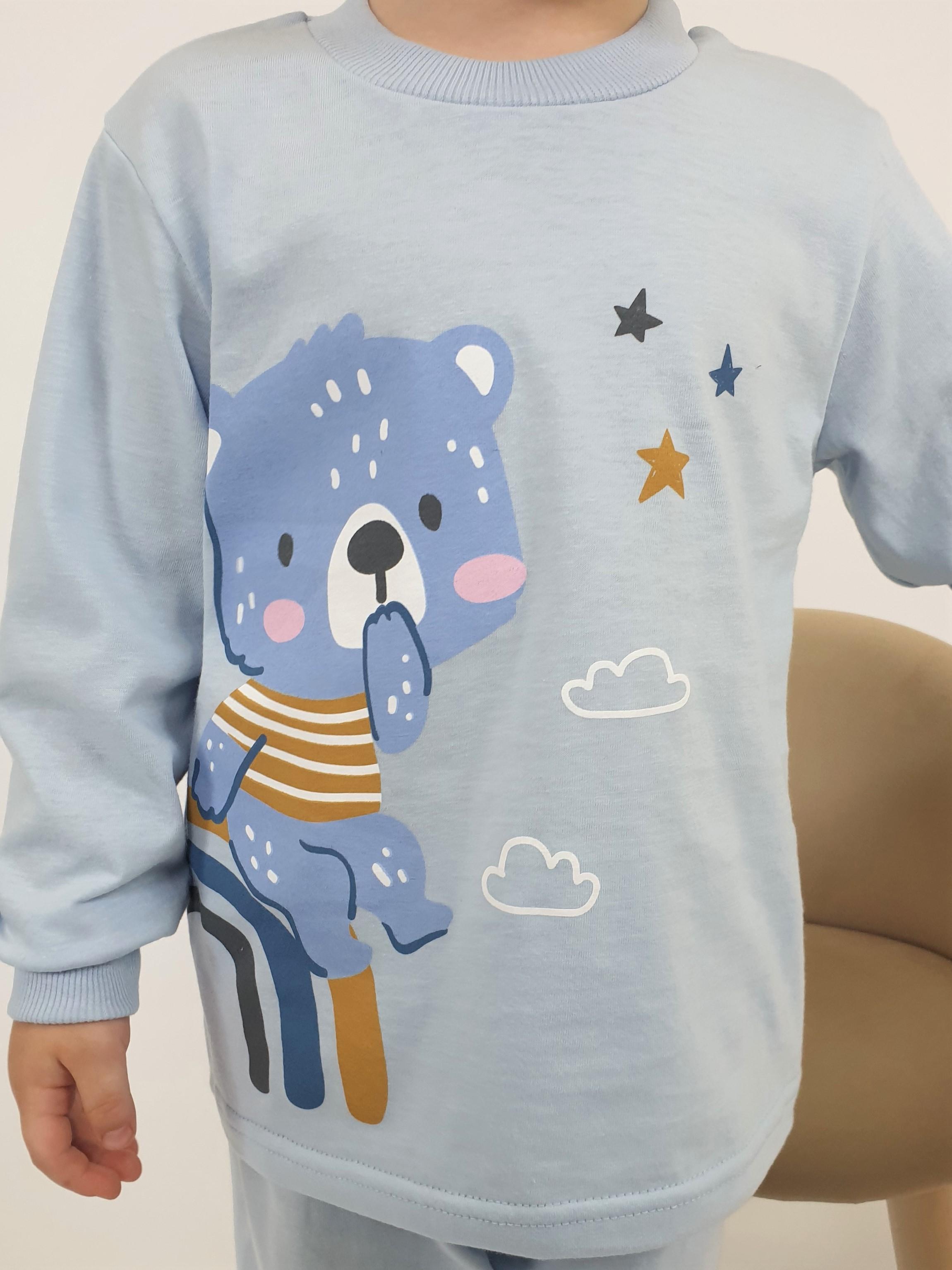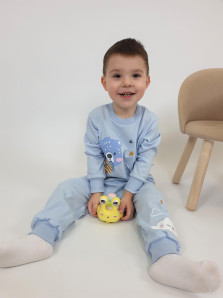 Кулирное полотно:100% х/б. Фуфайка-прямая,рукав втачной,длинный на манжете из ластика.Печать на переде.Горловина обработана ластиком. Брюки-длинные на манжете,верхний срез подшит с резинкой. Печать на левой половинке брюк внизу.