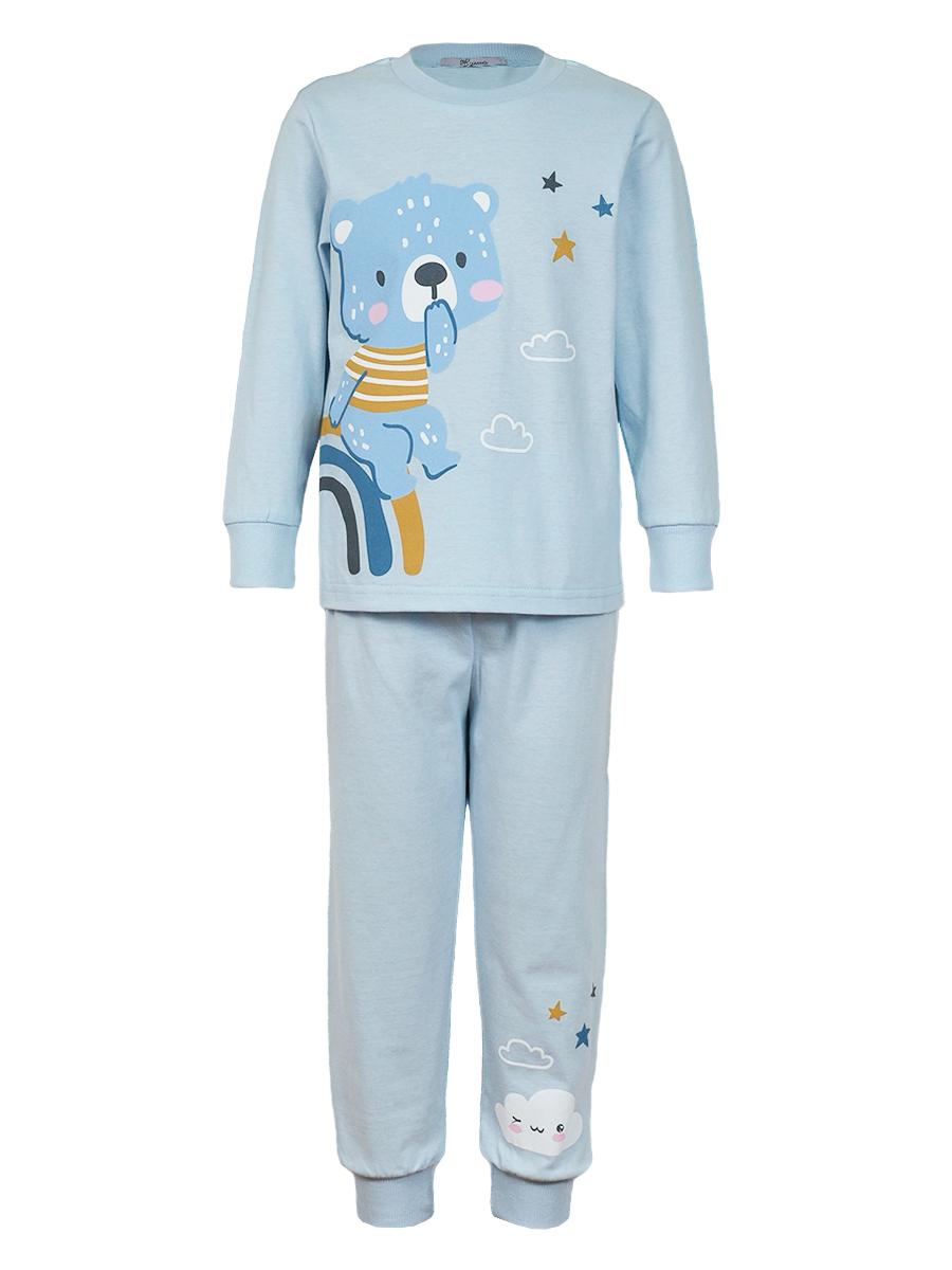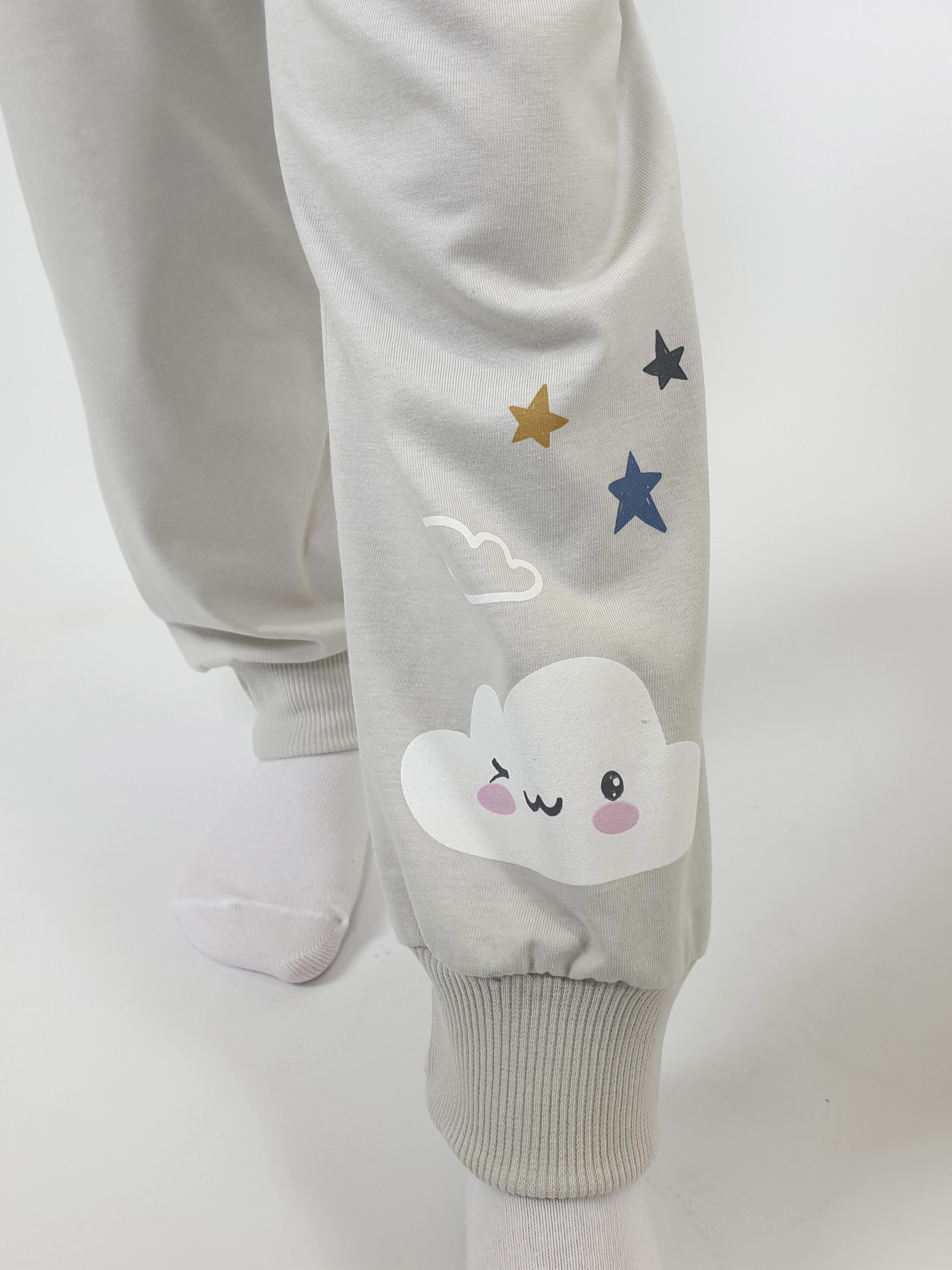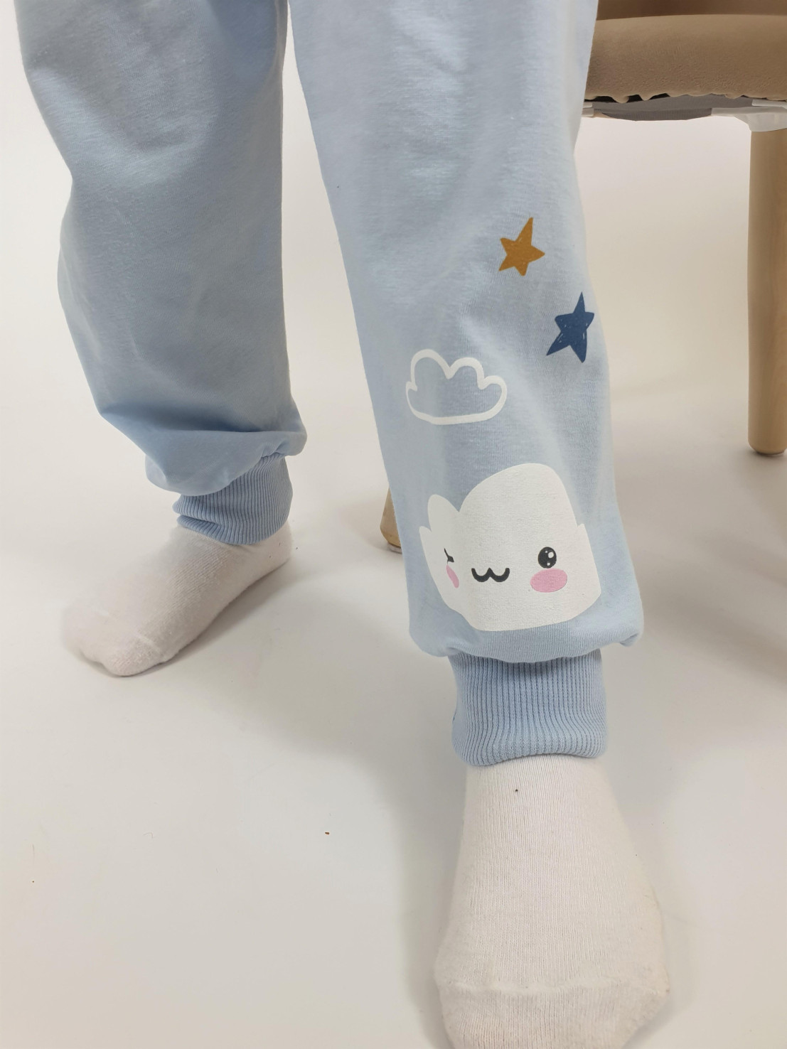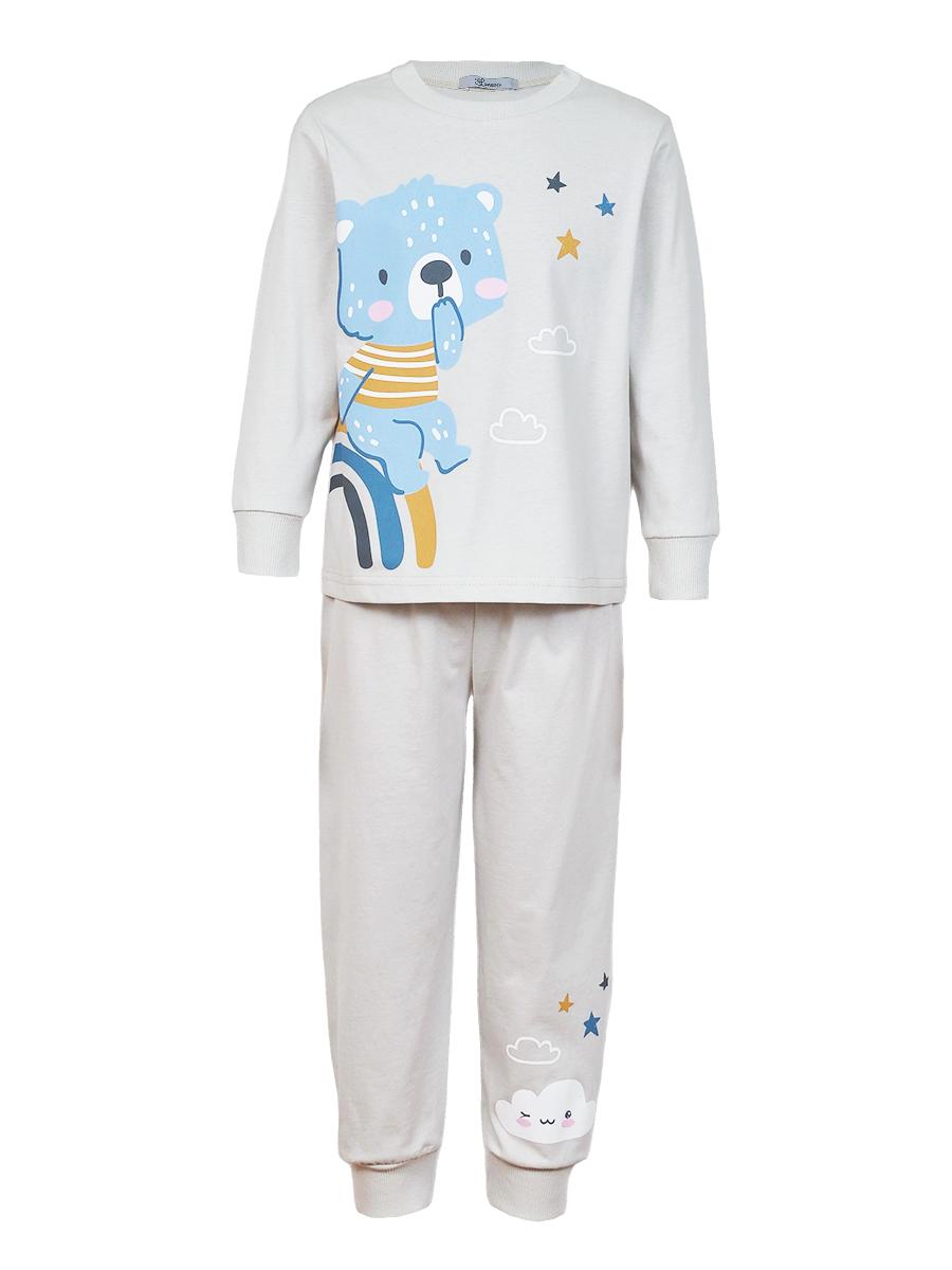 Кулирное полотно:100% х/б. Фуфайка-прямая,рукав втачной,длинный на манжете из ластика.Печать на переде.Горловина обработана ластиком. Брюки-длинные на манжете,верхний срез подшит с резинкой. Печать на левой половинке брюк внизу.