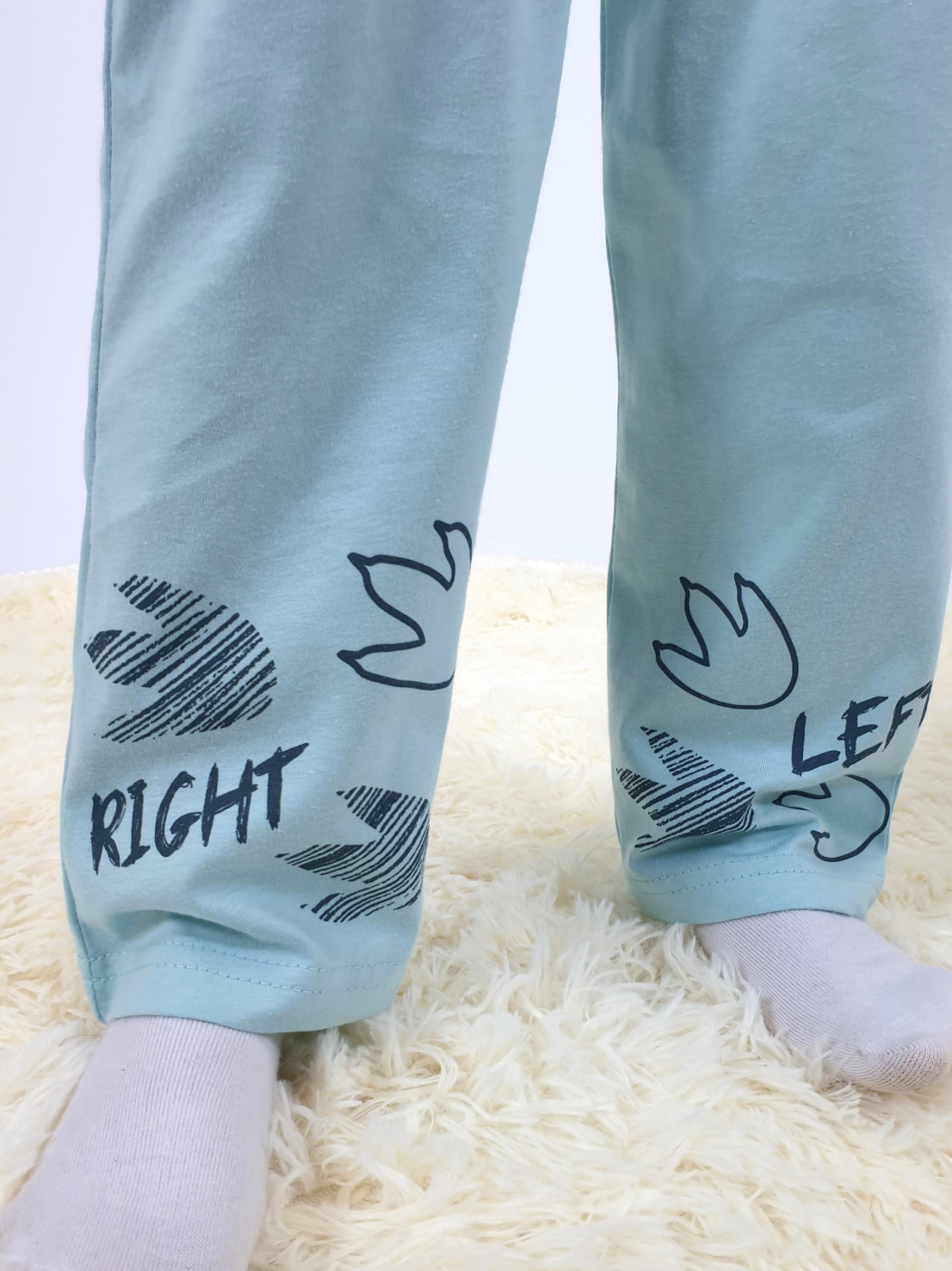 Кулирное полотно:100% х/б. Фуфайка(пижамная)-прямая,рукав втачной,длинный на манжете из ластика.Горловина обработана ластиком.Печать на переде. Брюки(пижамные)-длинные,прямые.Верхний срез подшит с резинкой.Печать на передних половинках внизу.