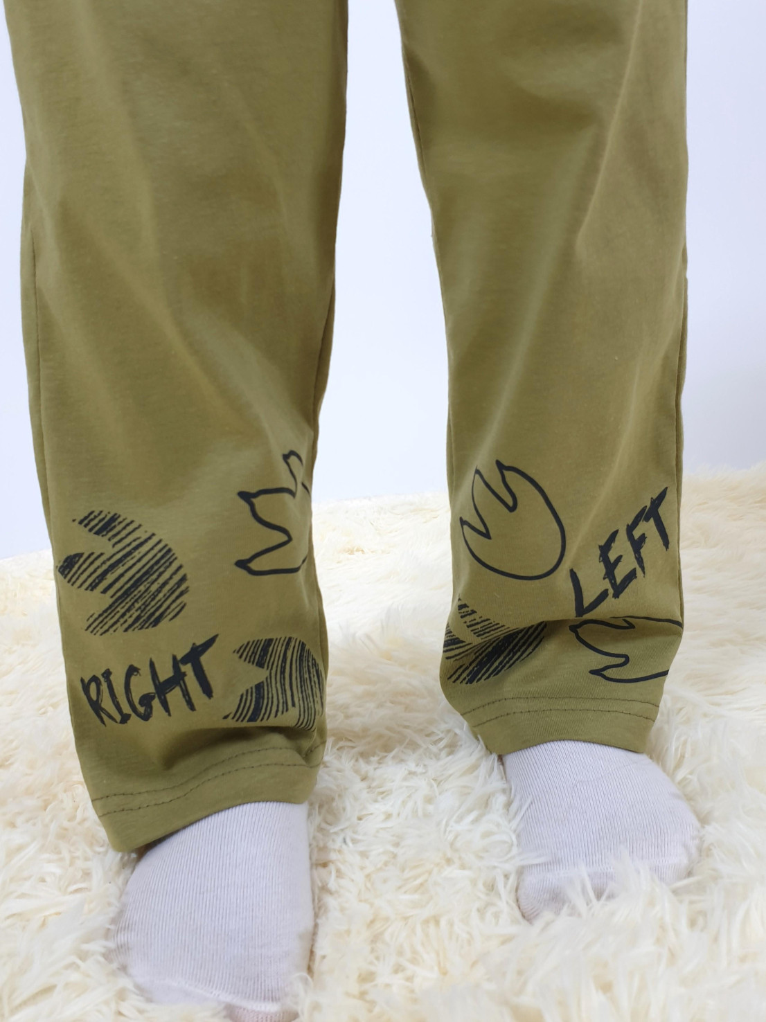 Кулирное полотно:100% х/б. Фуфайка(пижамная)-прямая,рукав втачной,длинный на манжете из ластика.Горловина обработана ластиком.Печать на переде. Брюки(пижамные)-длинные,прямые.Верхний срез подшит с резинкой.Печать на передних половинках внизу.