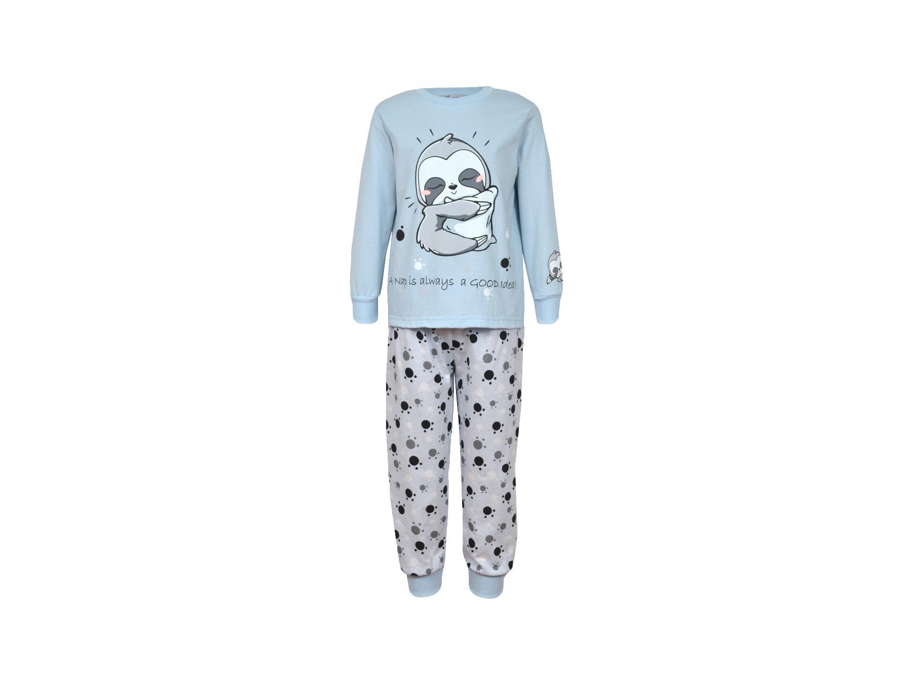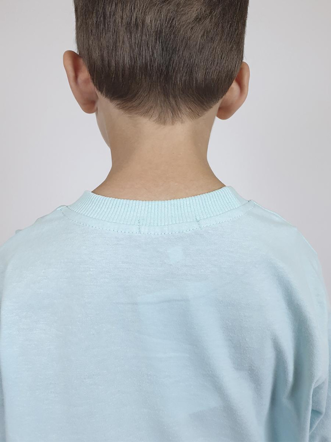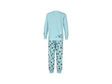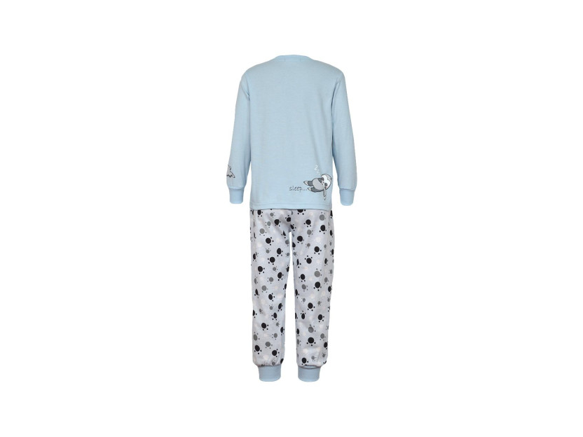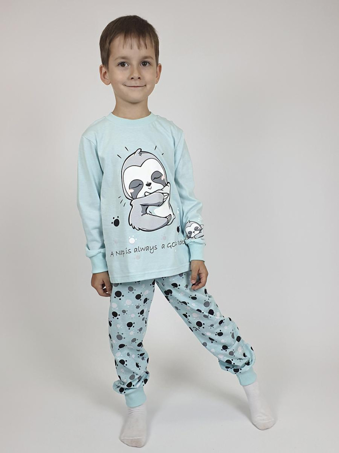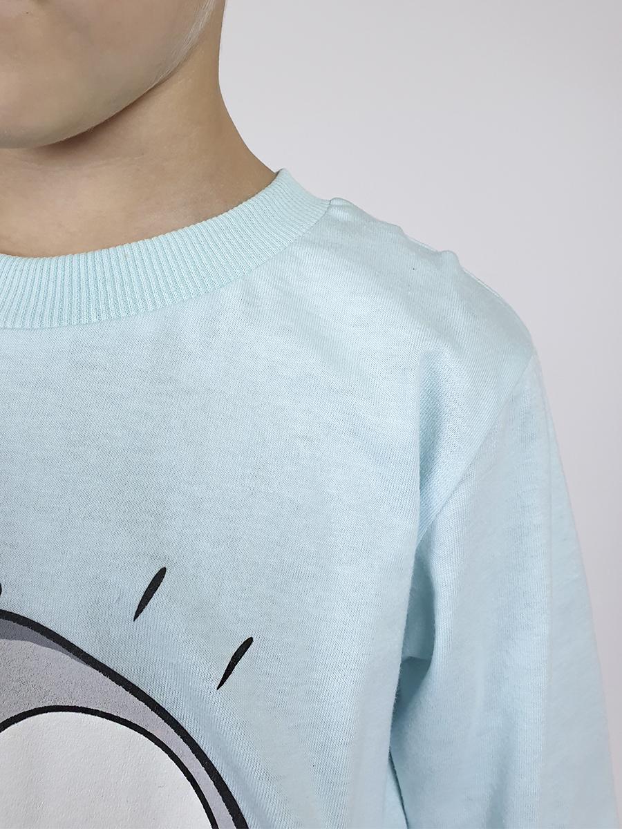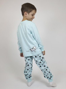Кулирное полотно:100%х/б. Фуфайка-прямая,рукав втачной,длинный на манжете из ластика.Горловина обработана ластиком.Печать на переде,спинке и левом рукаве внизу. Брюки-длинные на манжете из ластика.Верхний срез подшит с резинкой.
