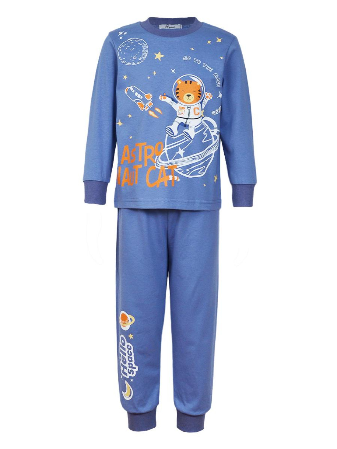 Кулирное полотно:100% х/б. Фуфайка-прямая,рукав втачной,длинный на манжете из ластика.Печать на переде.Горловина обработана ластиком. Брюки-длинные на манжете внизу,верхний срез подшит с резинкой. Печать на правой передней половинке брюк.
