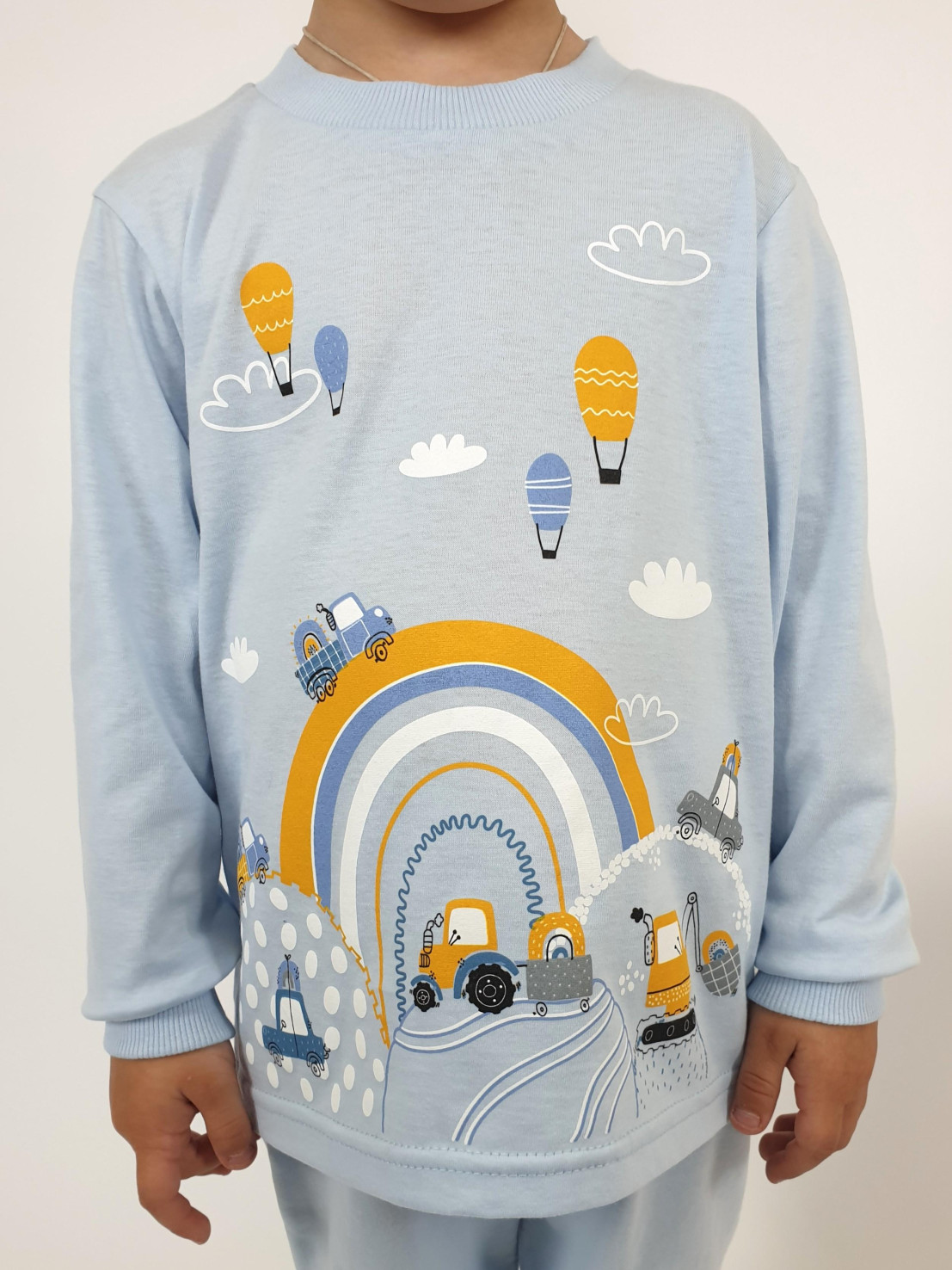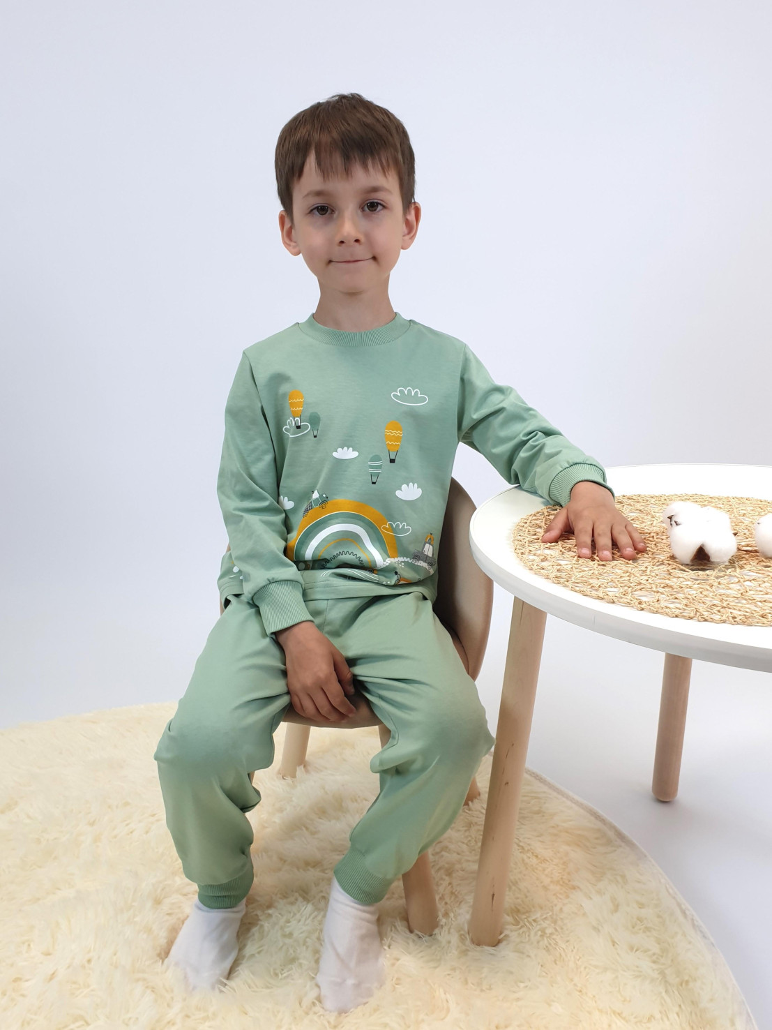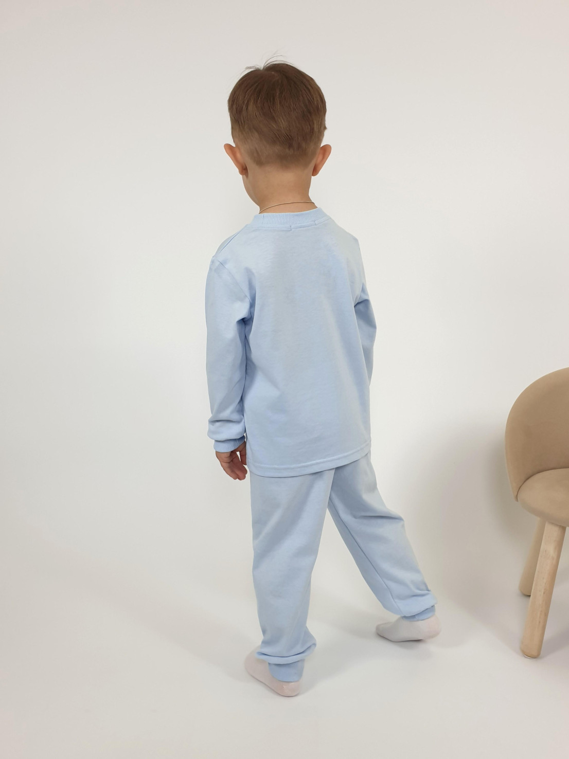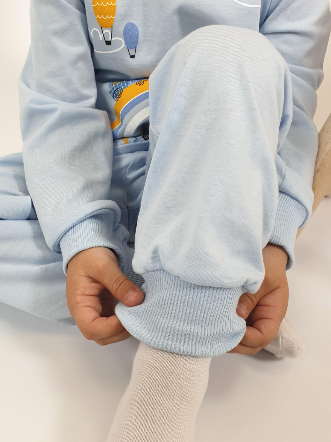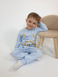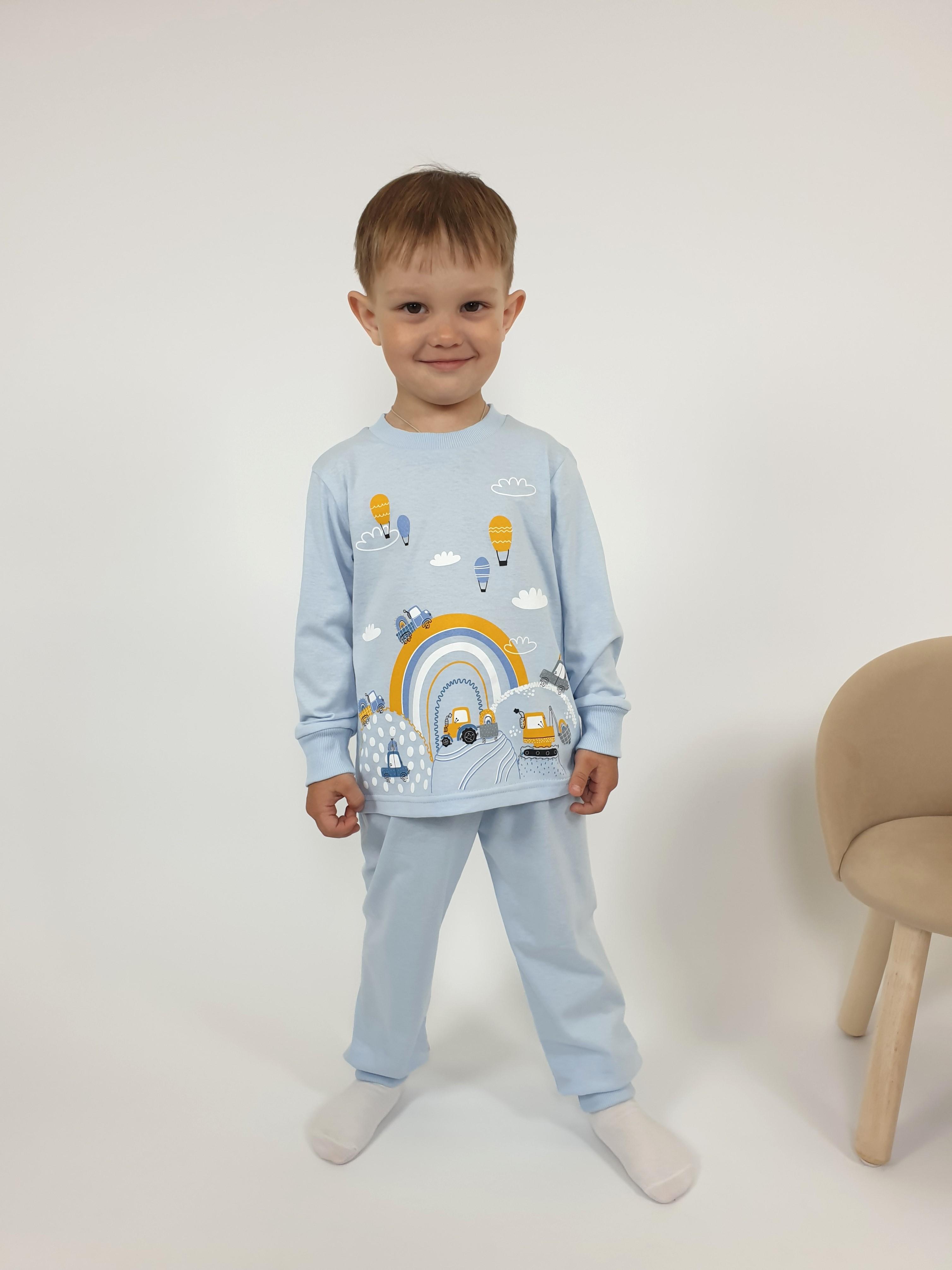 Кулирное полотно:100% х/б. Фуфайка-прямая,рукав втачной,длинный на манжете из ластика.Печать на переде.Горловина обработана ластиком. Брюки-длинные на манжете внизу,верхний срез подшит с резинкой.