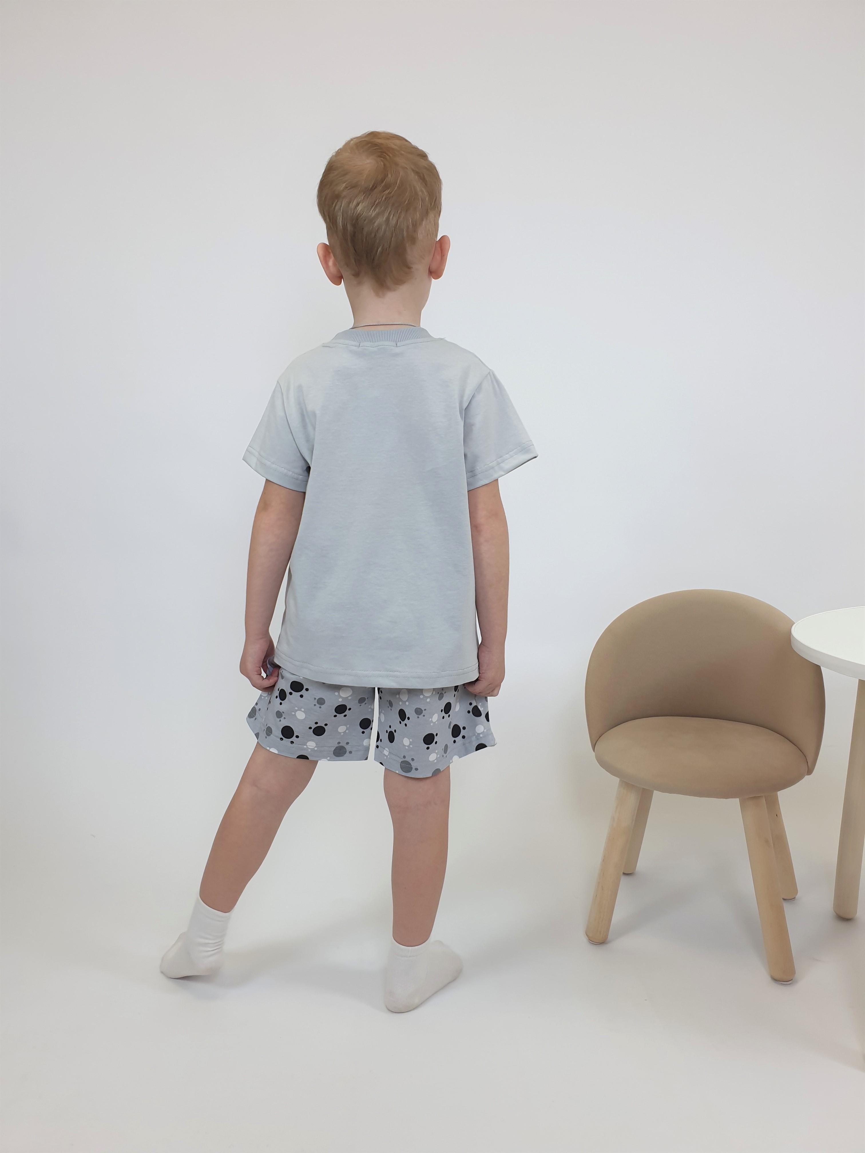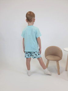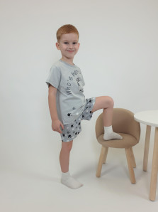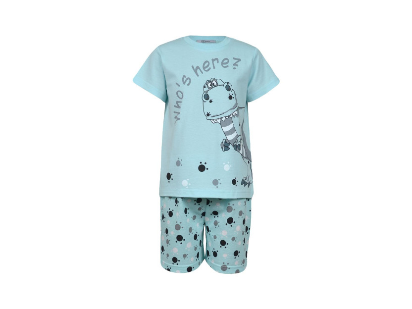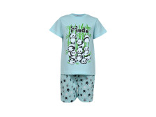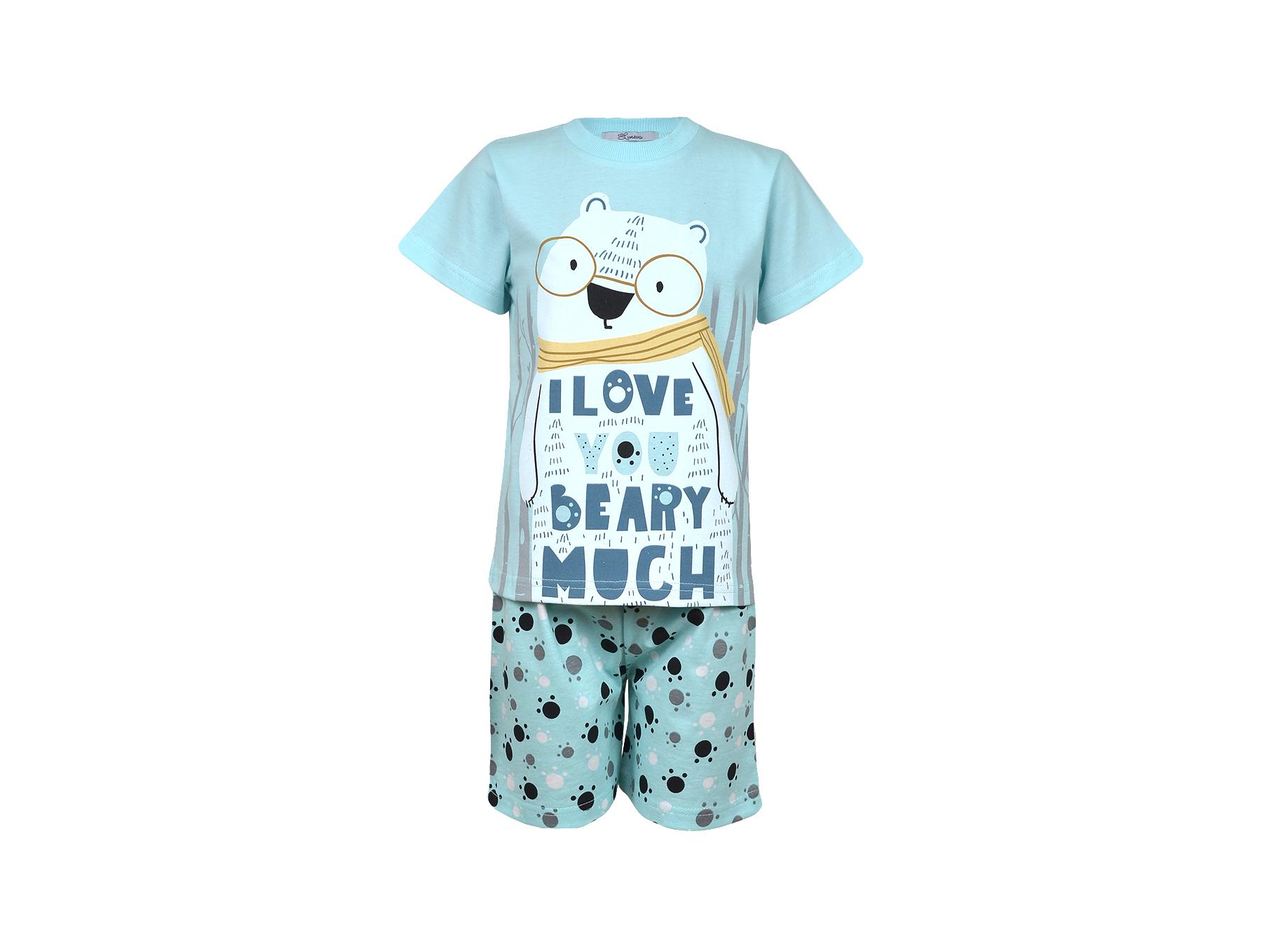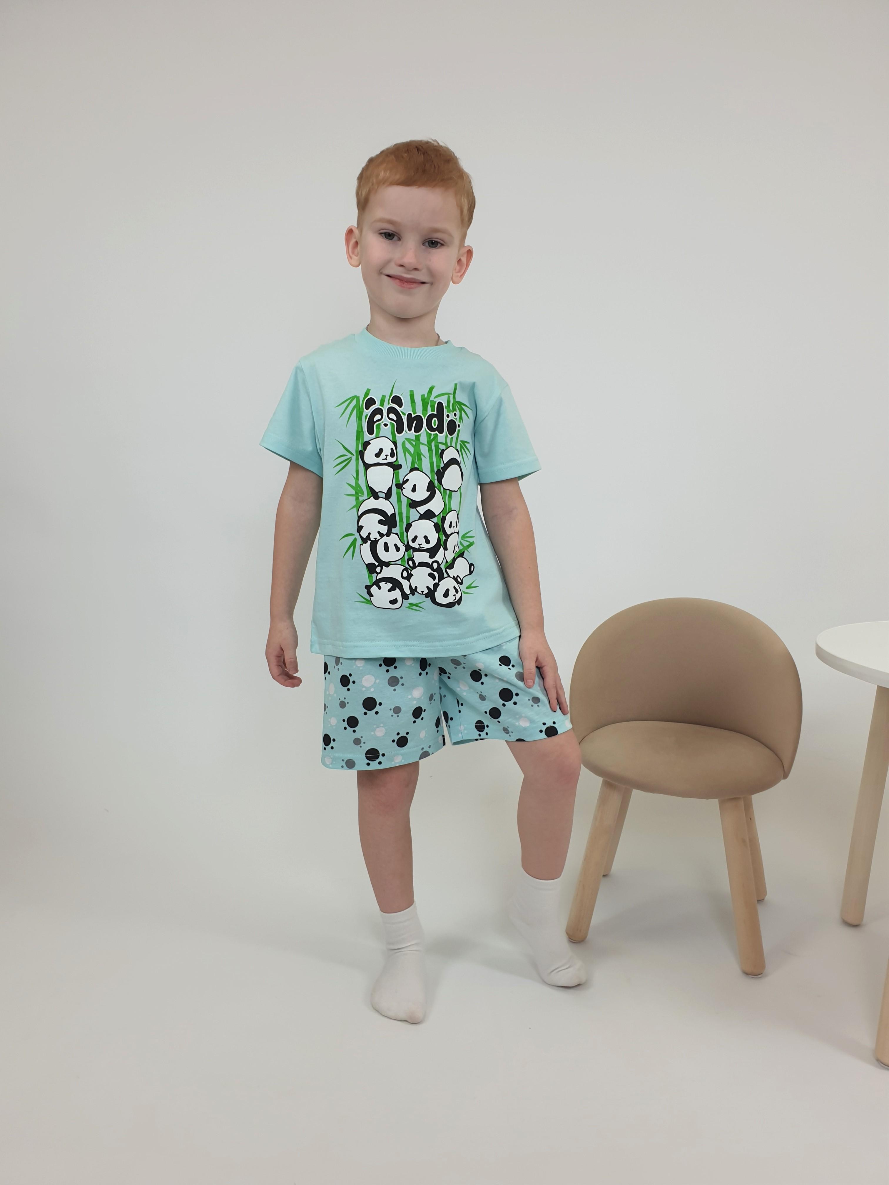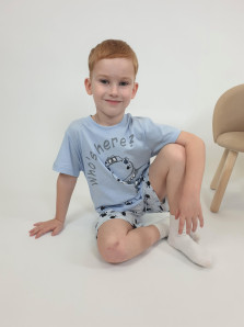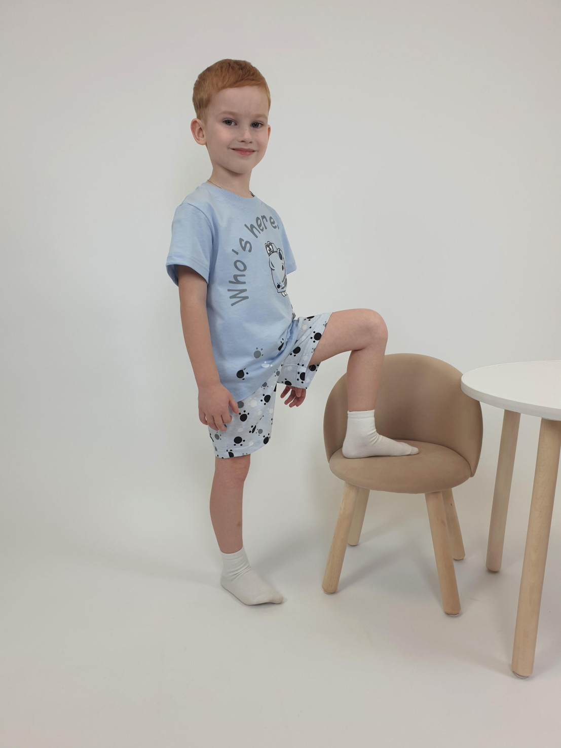 Кулирное полотно:100%х/б. Фуфайка-прямая,рукав втачной,короткий.Горловина обработана ластиком.Печать на переде. Брюки-короткие,верхний срез подшит с резинкой.
