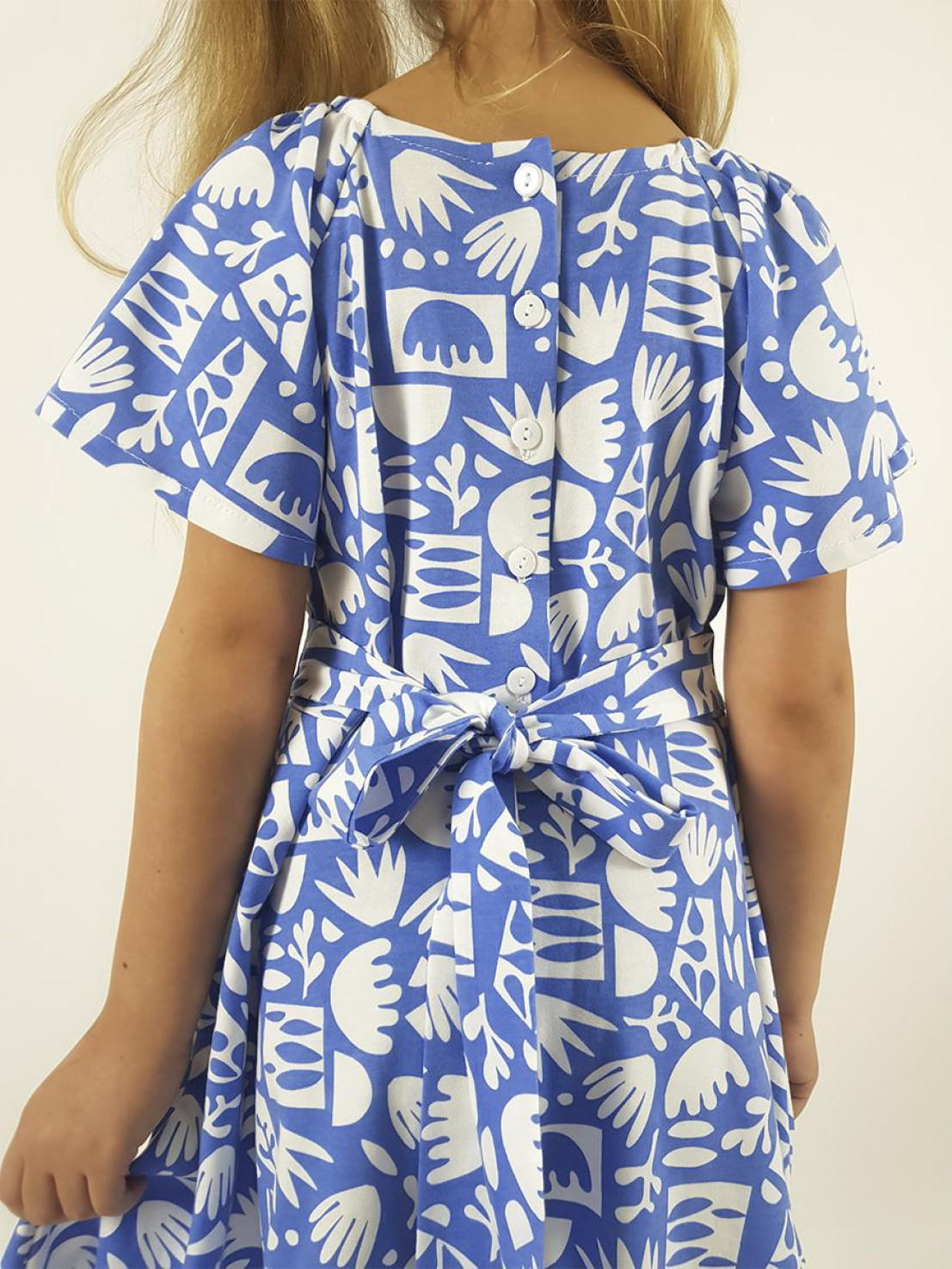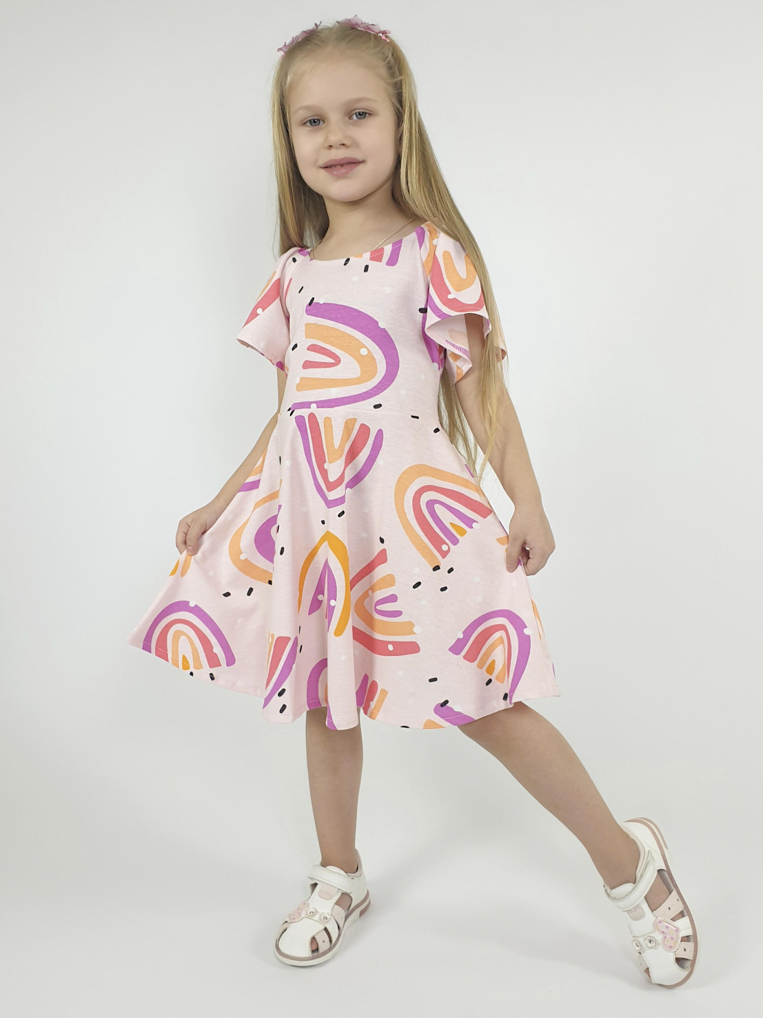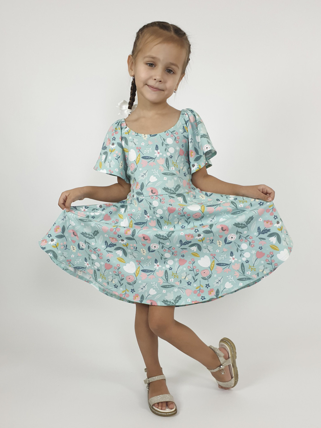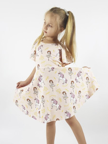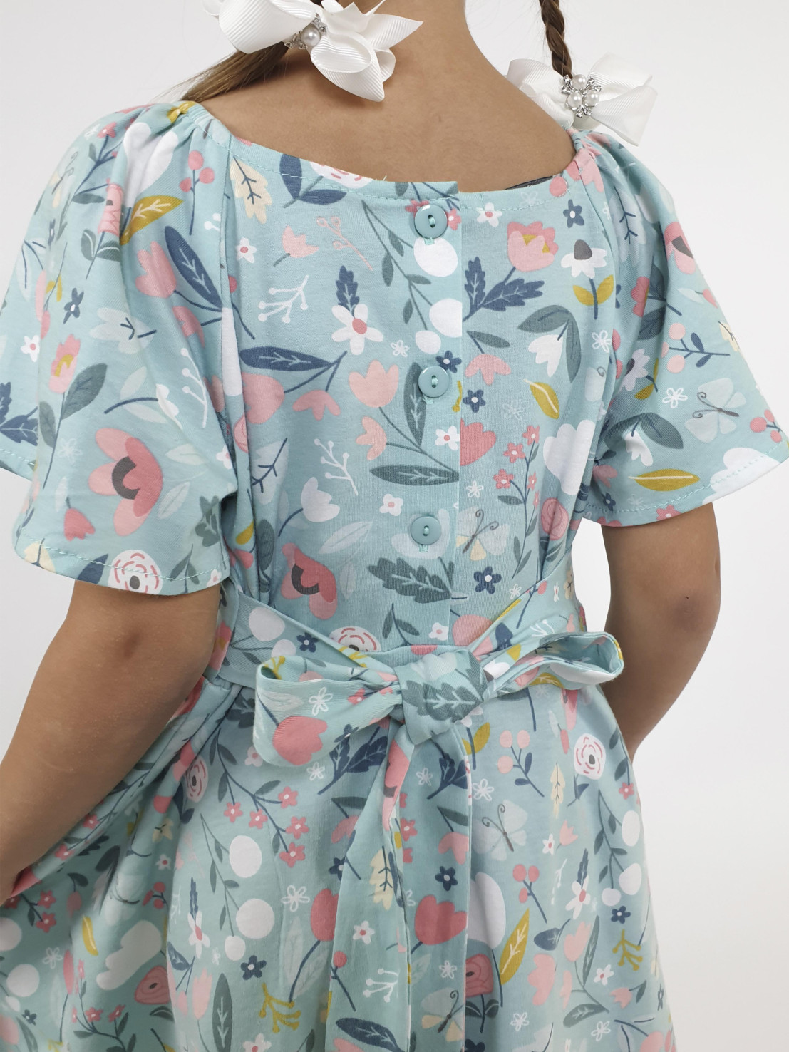 Кулирное полотно(набивка): 100% х/б. Платье-с отрезной юбкой"клеш".Рукав реглан,короткий в горловине собран на резинку.Вырез горловины переда и спинки подшит.Застежка на пуговицы,завязывающийся пояс на спинке.