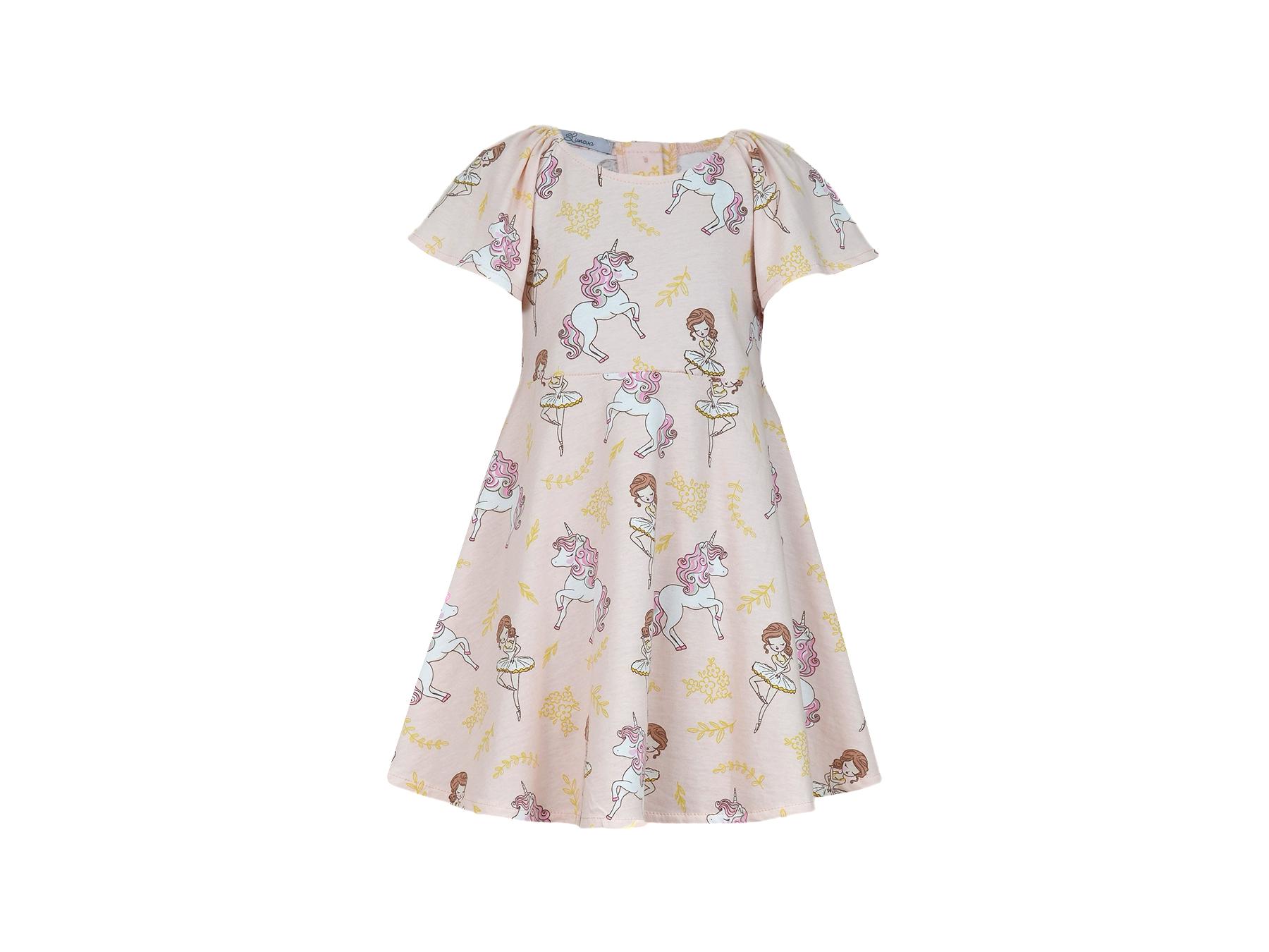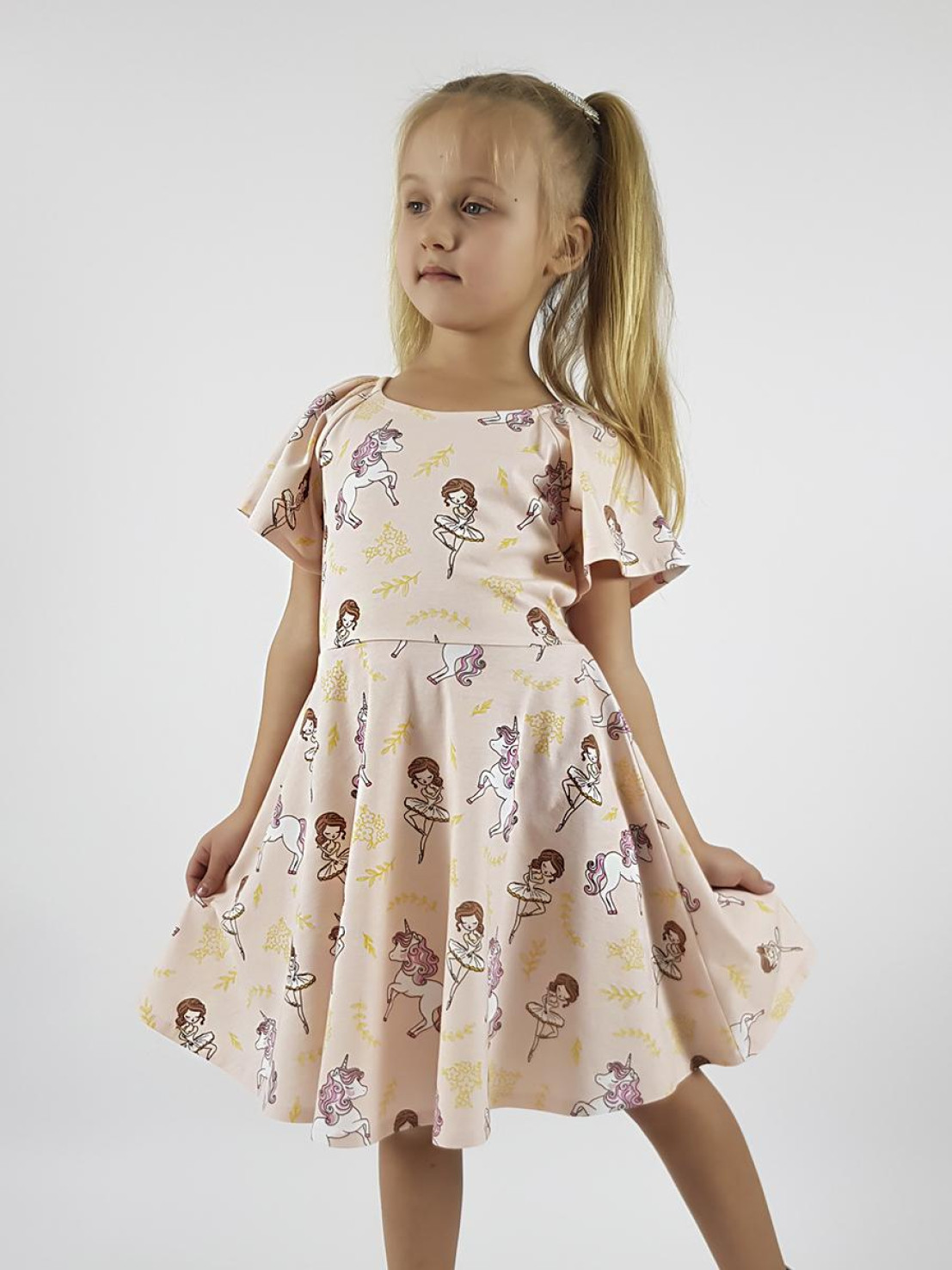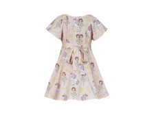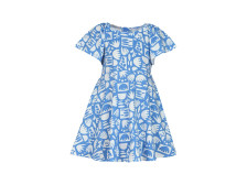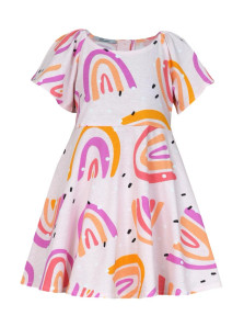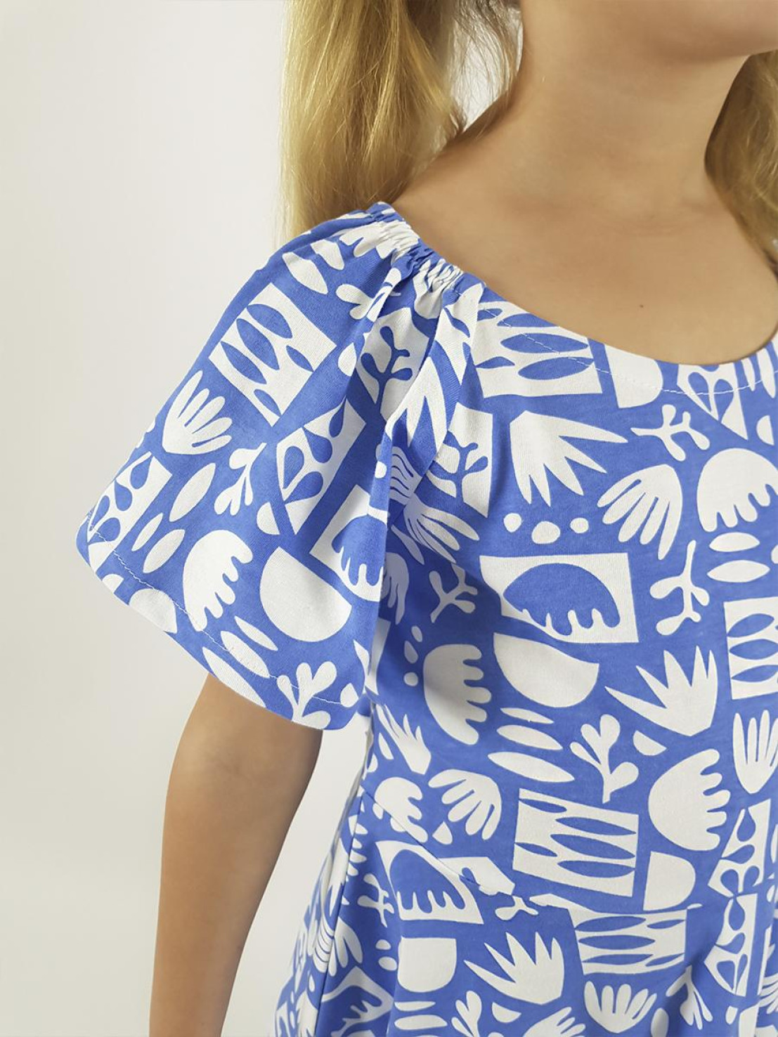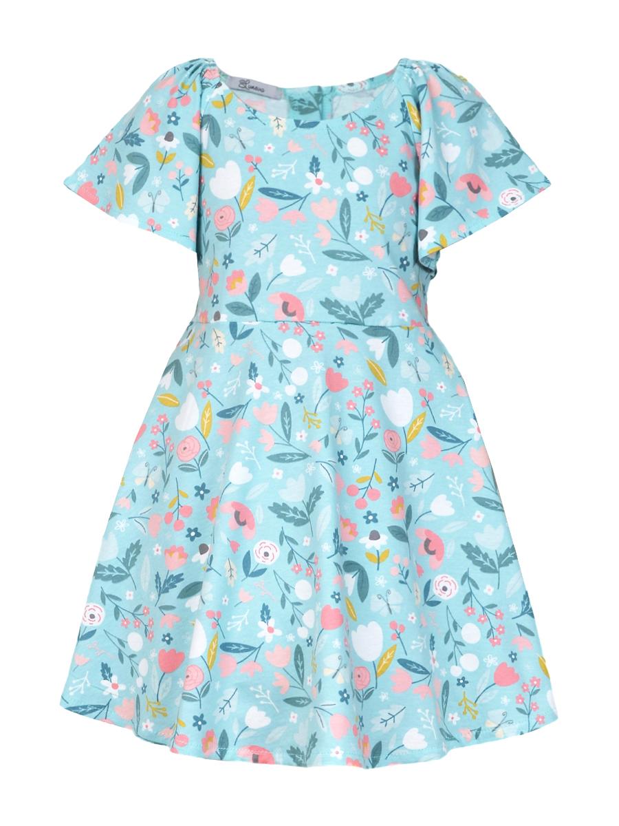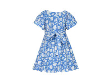 Кулирное полотно(набивка): 100% х/б. Платье-с отрезной юбкой"клеш".Рукав реглан,короткий в горловине собран на резинку.Вырез горловины переда и спинки подшит.Застежка на пуговицы,завязывающийся пояс на спинке.