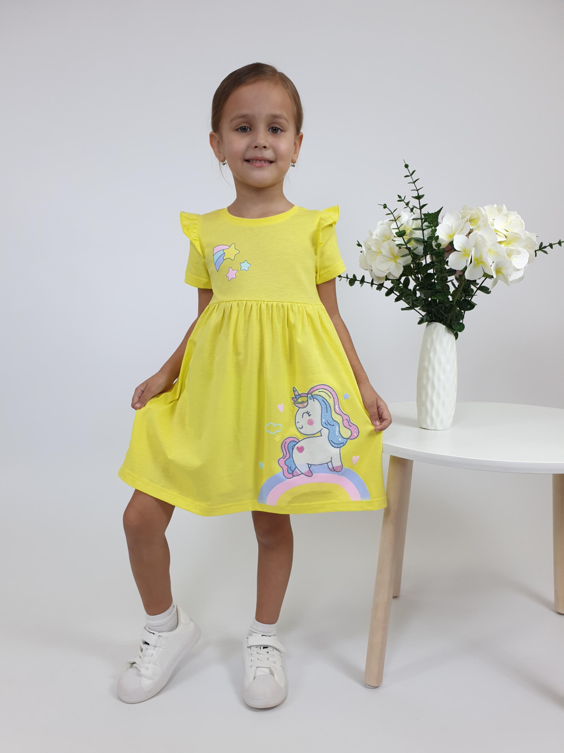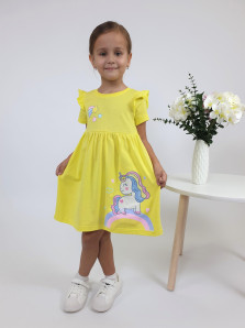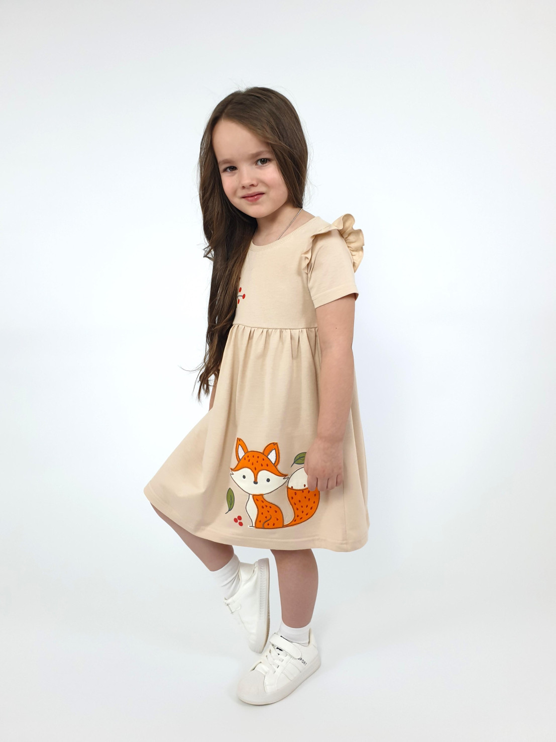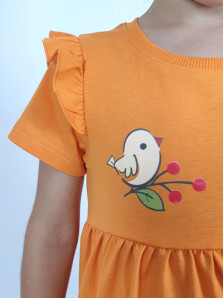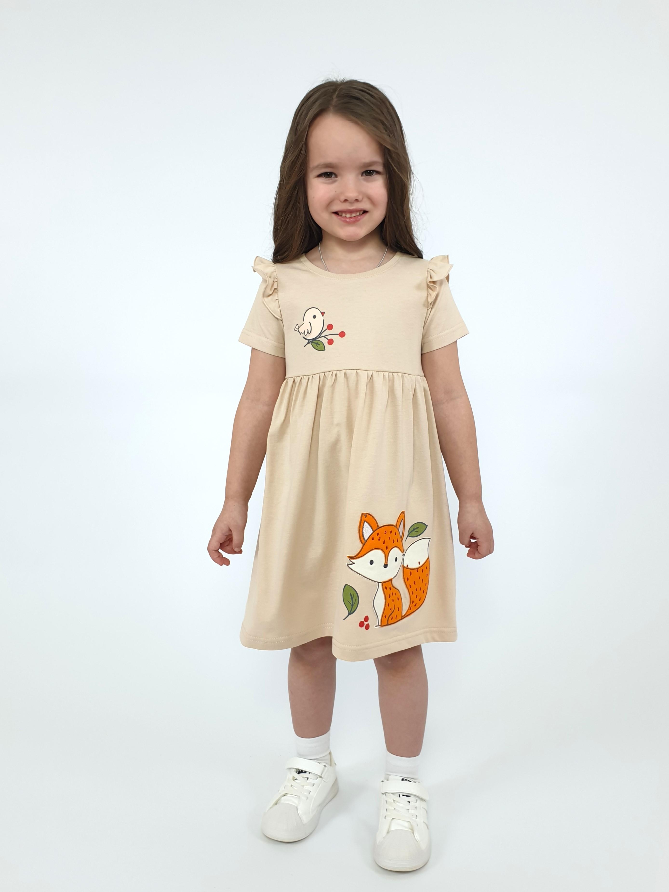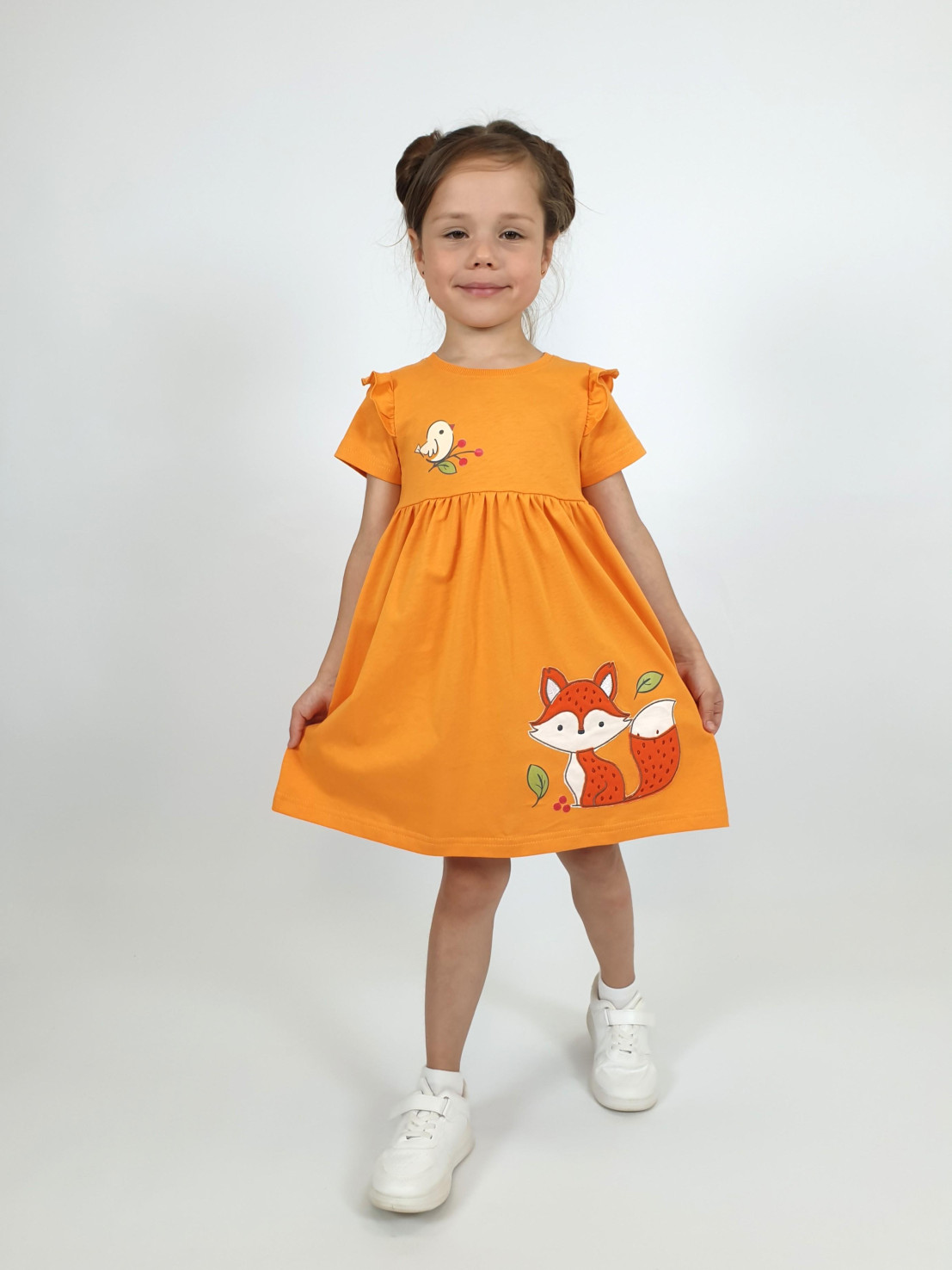 Кулирное полотно:100% х/б. Платье-отрезная юбка со сборкой,с вышивкой на переде.Кокетка переда с печатью.Короткий рукав,в пройме рюша,горловина обработана ластиком.