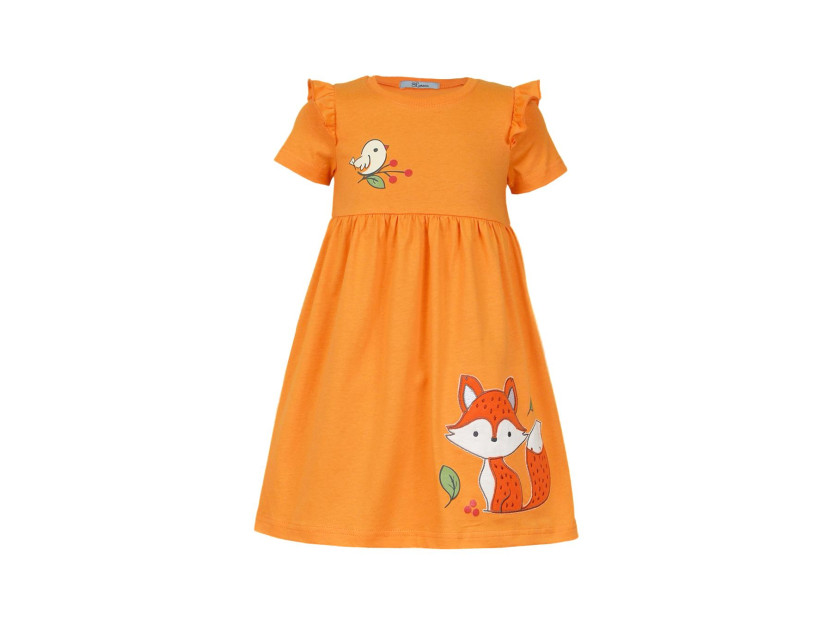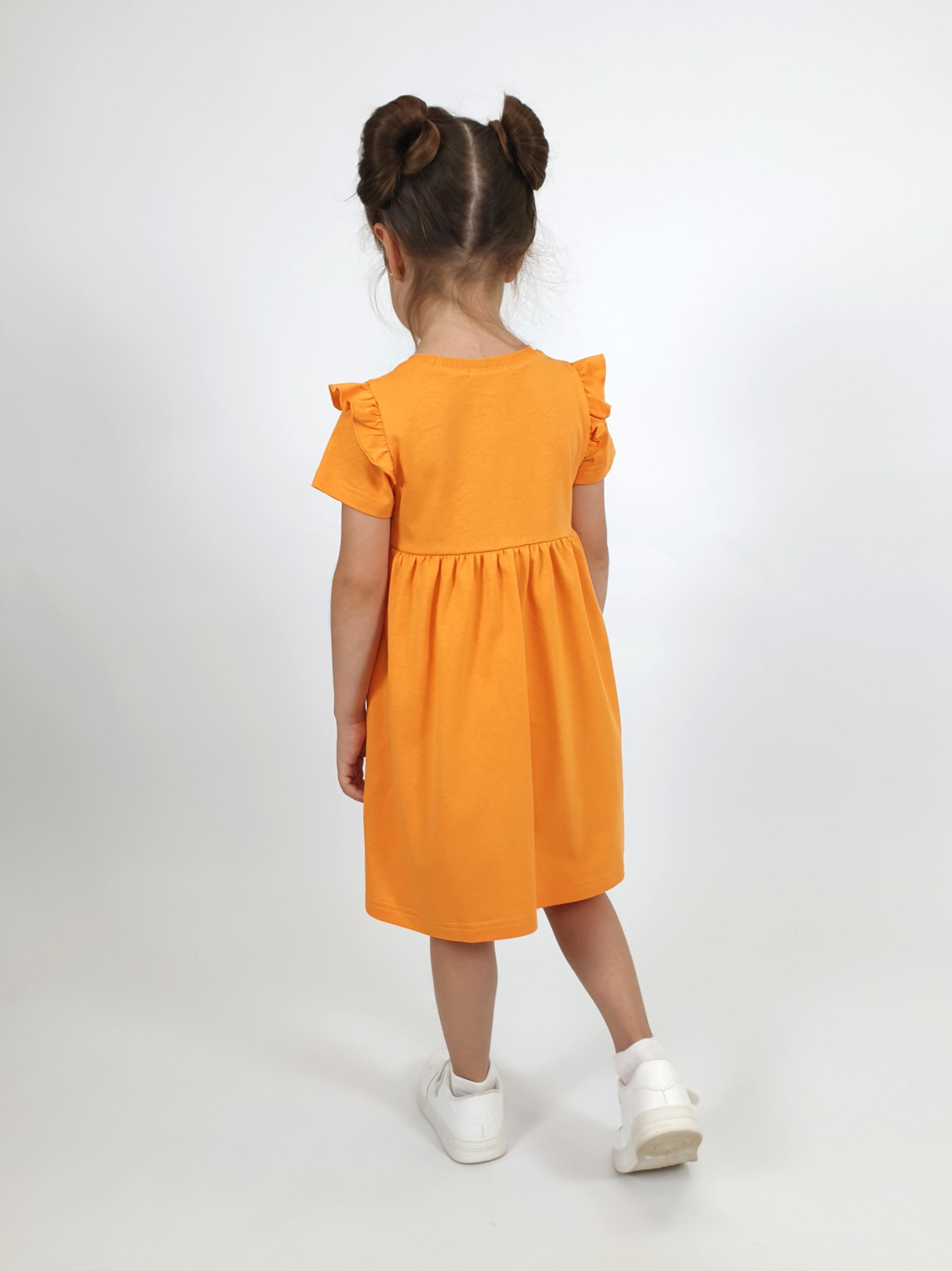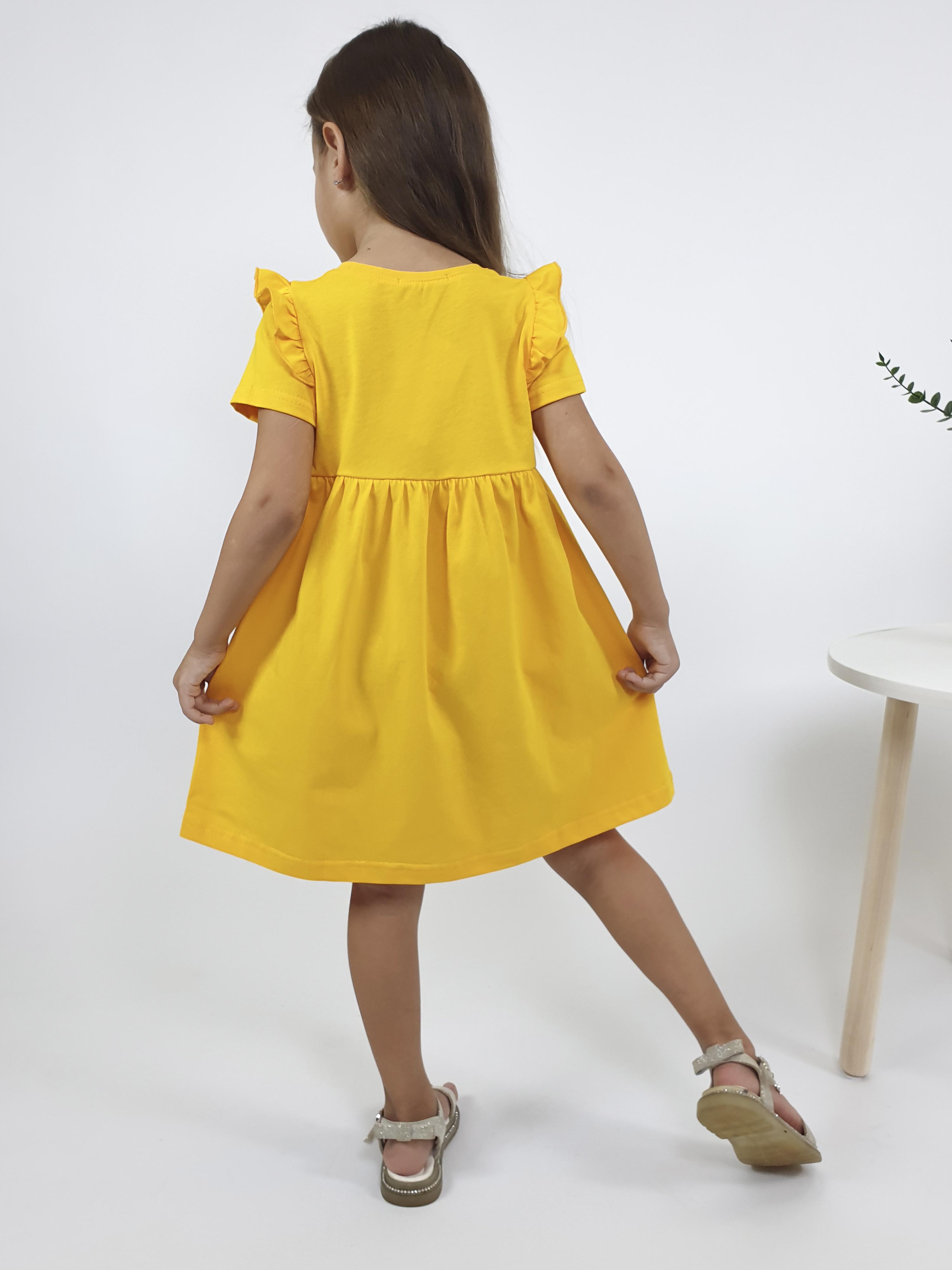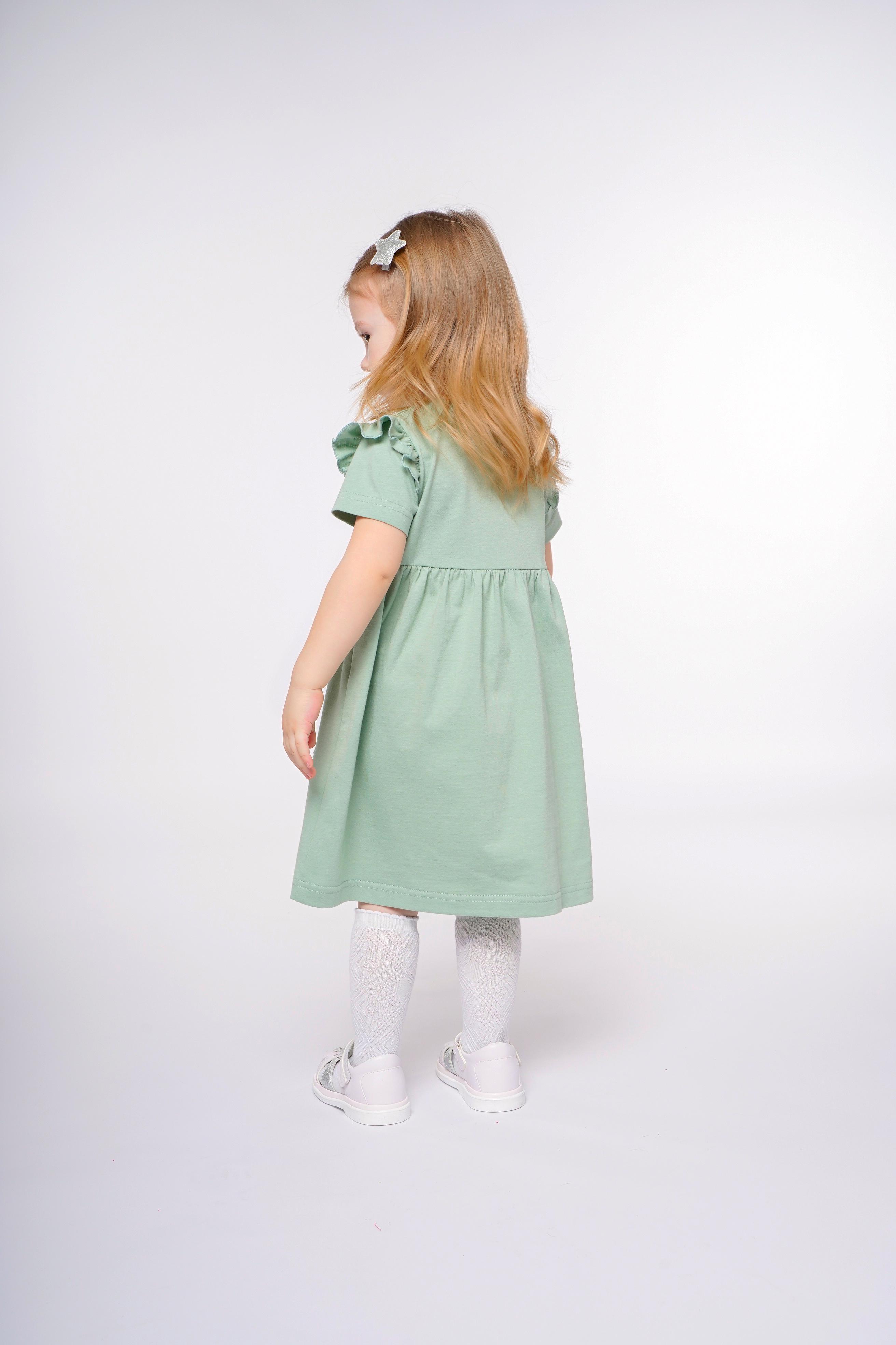 Кулирное полотно:100% х/б. Платье-отрезная юбка со сборкой,с вышивкой на переде.Кокетка переда с печатью.Короткий рукав,в пройме рюша,горловина обработана ластиком.