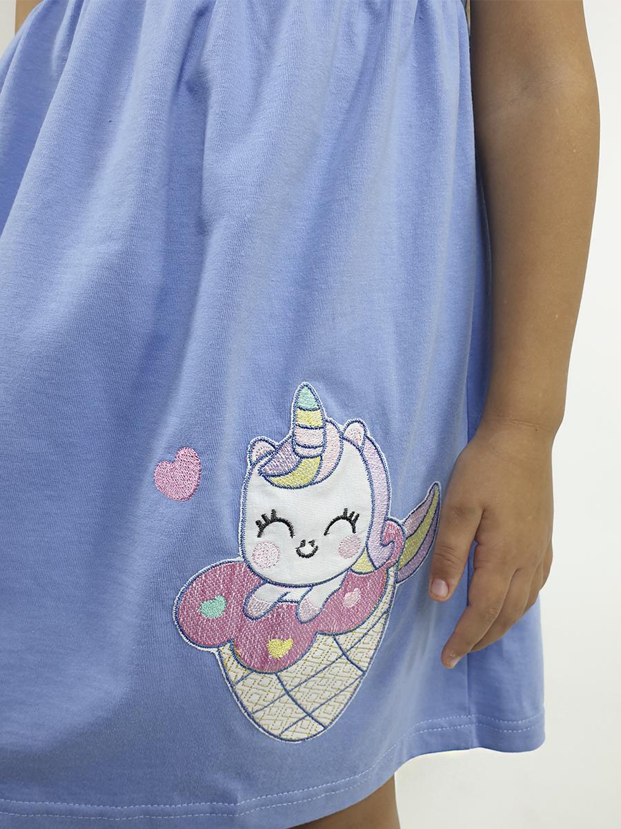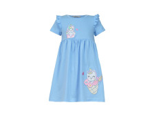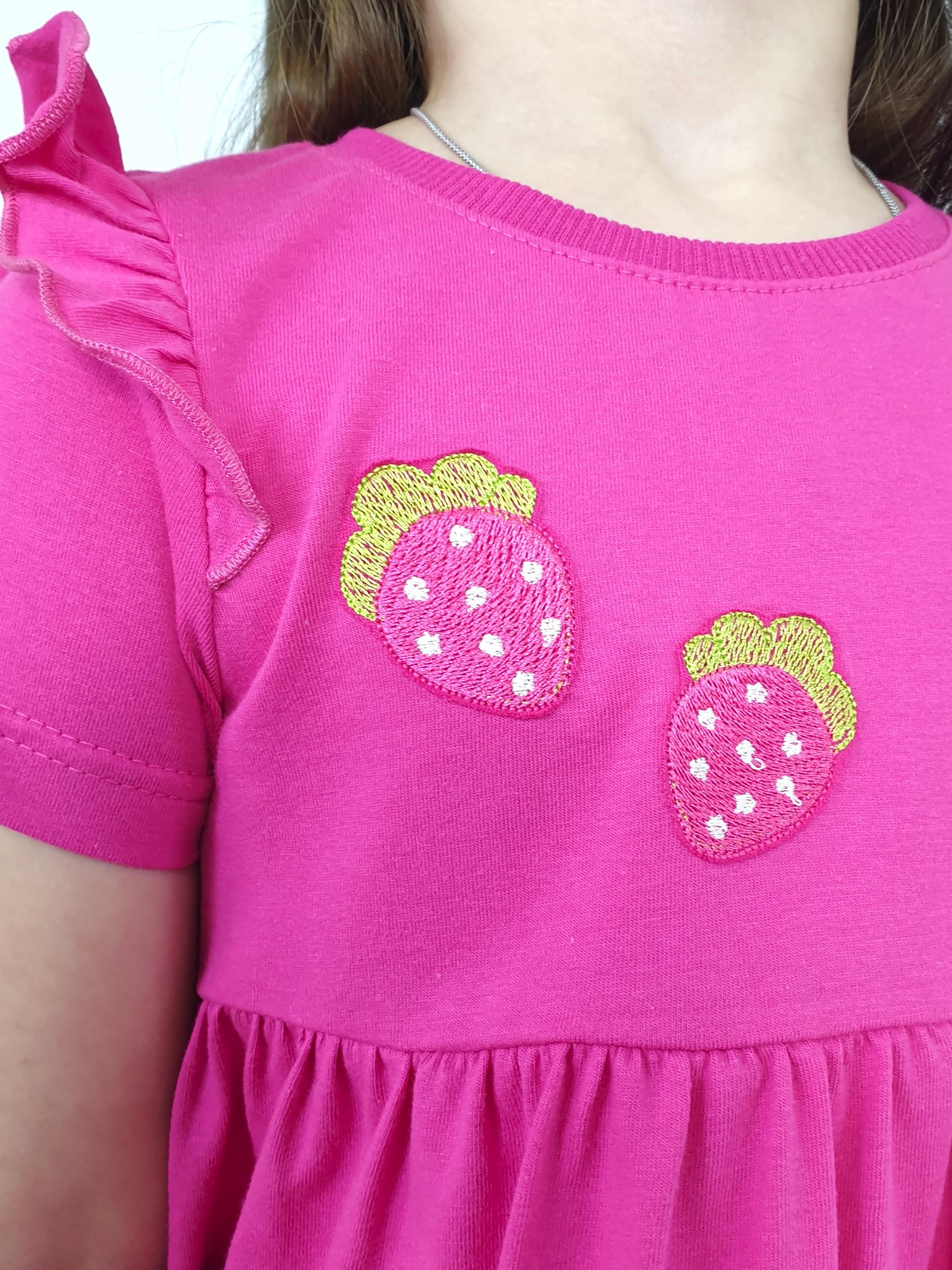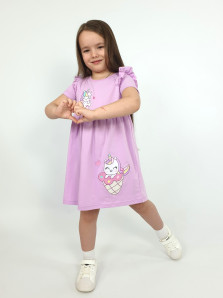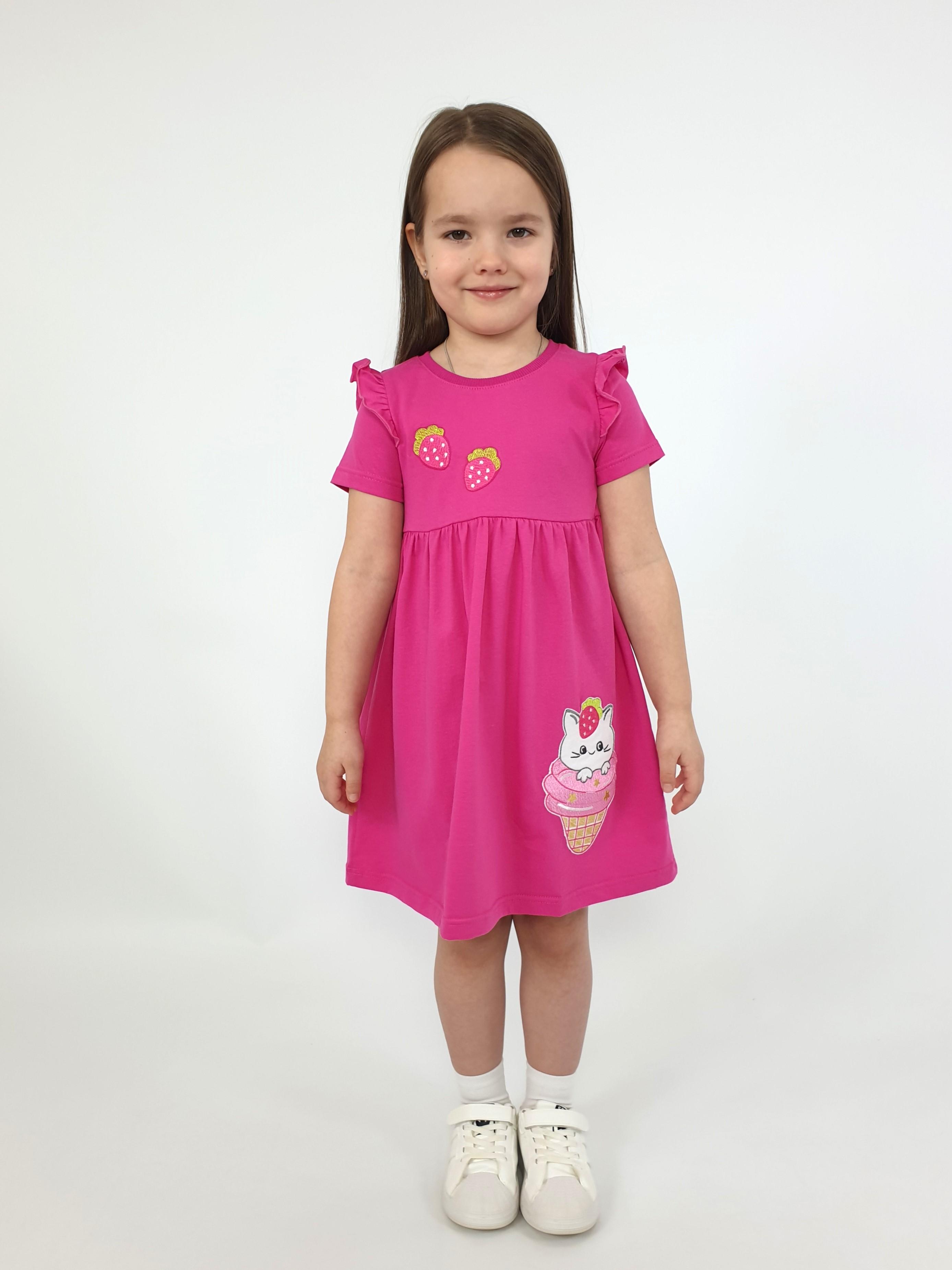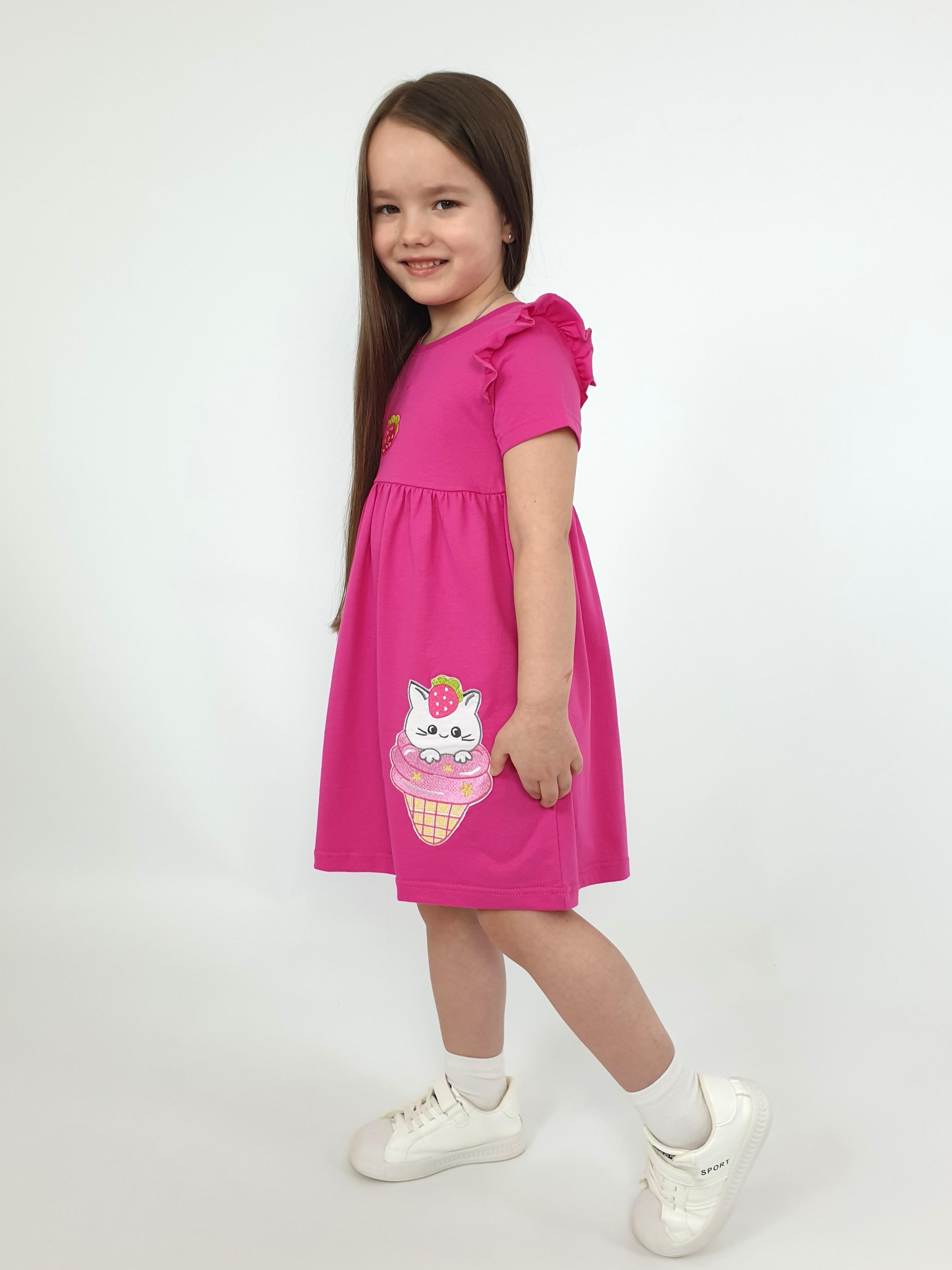 Кулирное полотно:100% х/б. Платье-отрезная юбка со сборкой,с вышивкой на переде.Кокетка переда с печатью.Короткий рукав,в пройме рюша,горловина обработана ластиком.