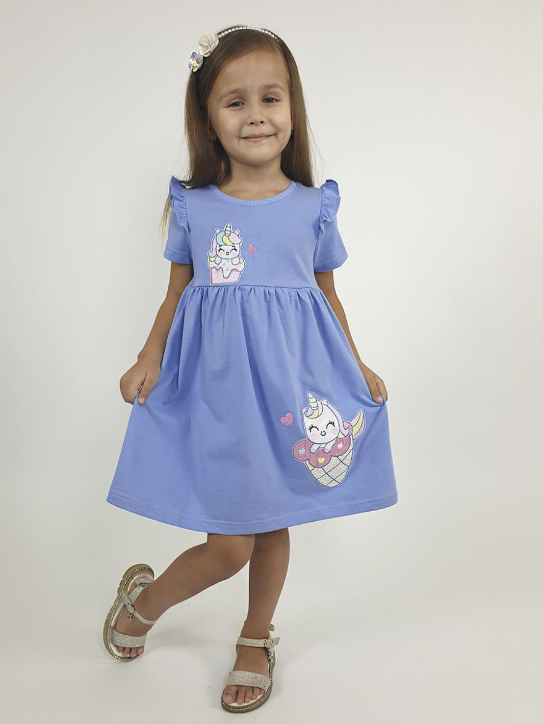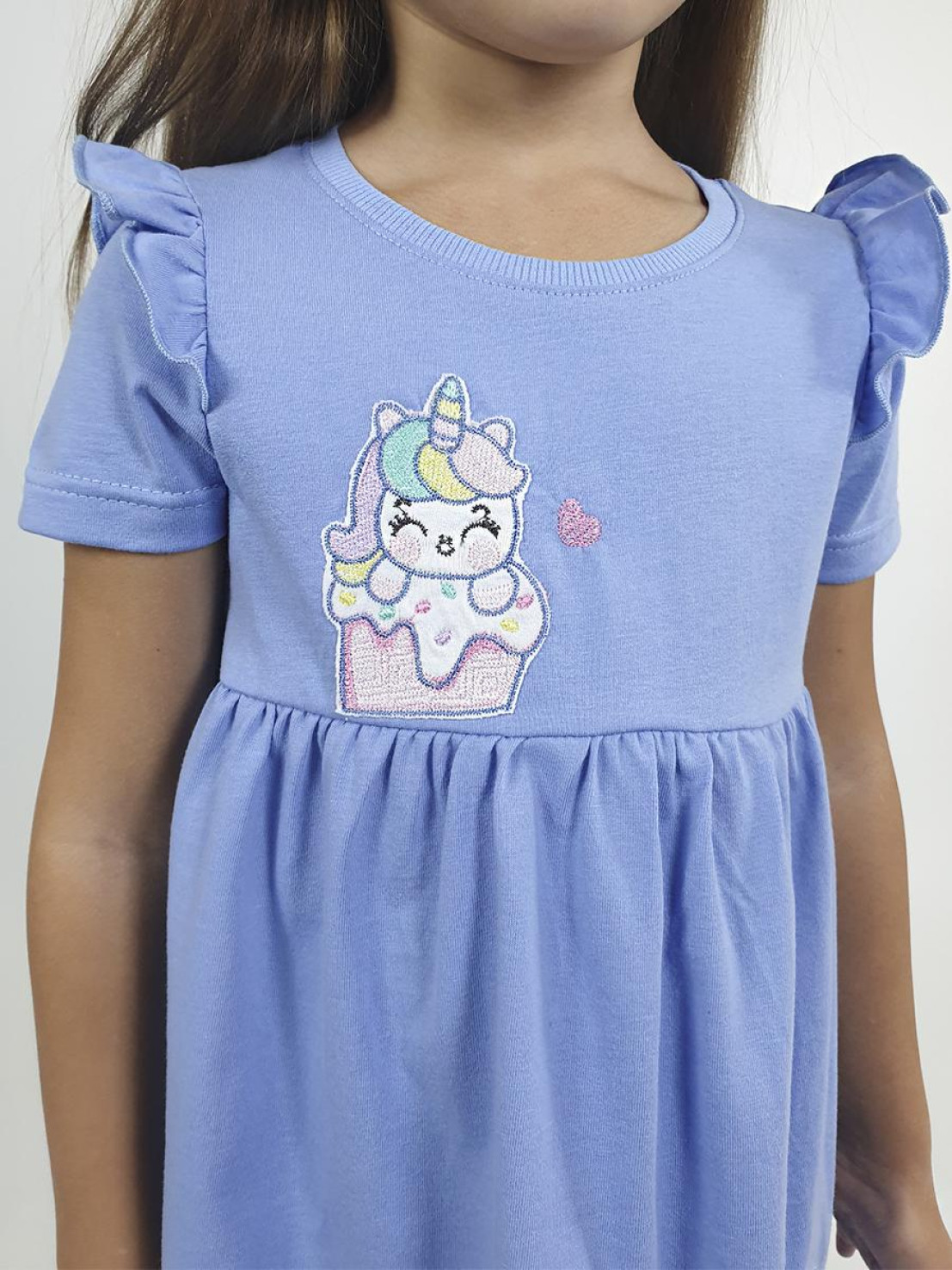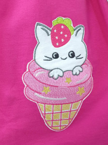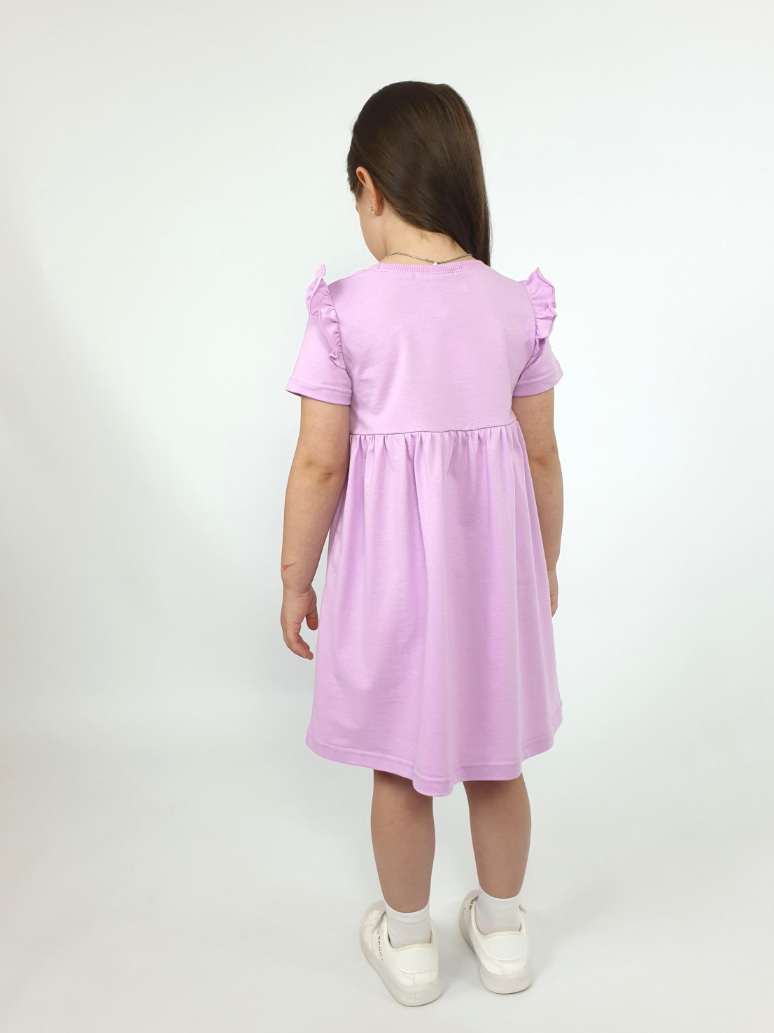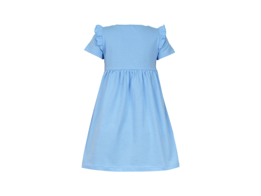 Кулирное полотно:100% х/б. Платье-отрезная юбка со сборкой,с вышивкой на переде.Кокетка переда с печатью.Короткий рукав,в пройме рюша,горловина обработана ластиком.