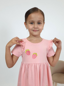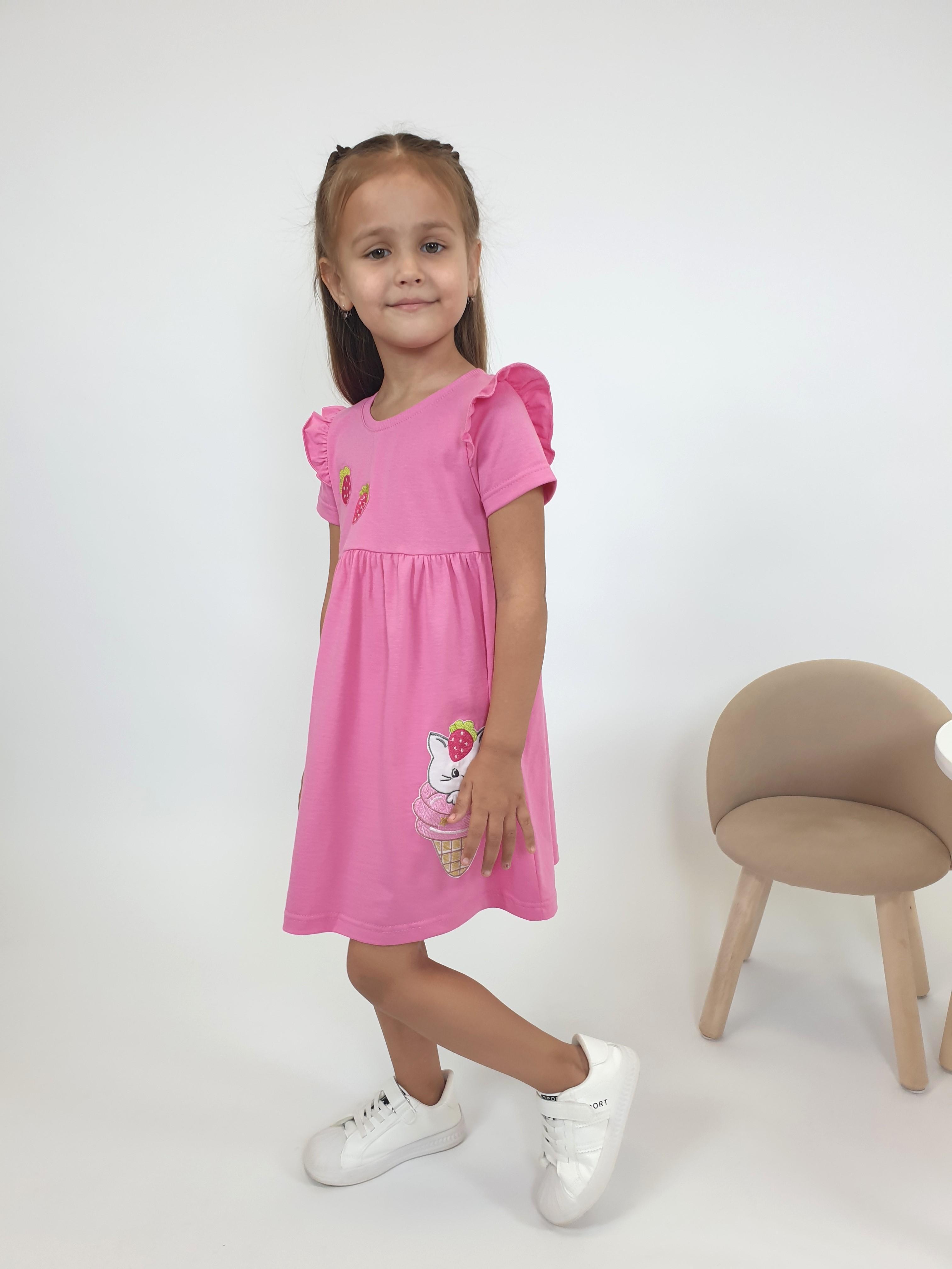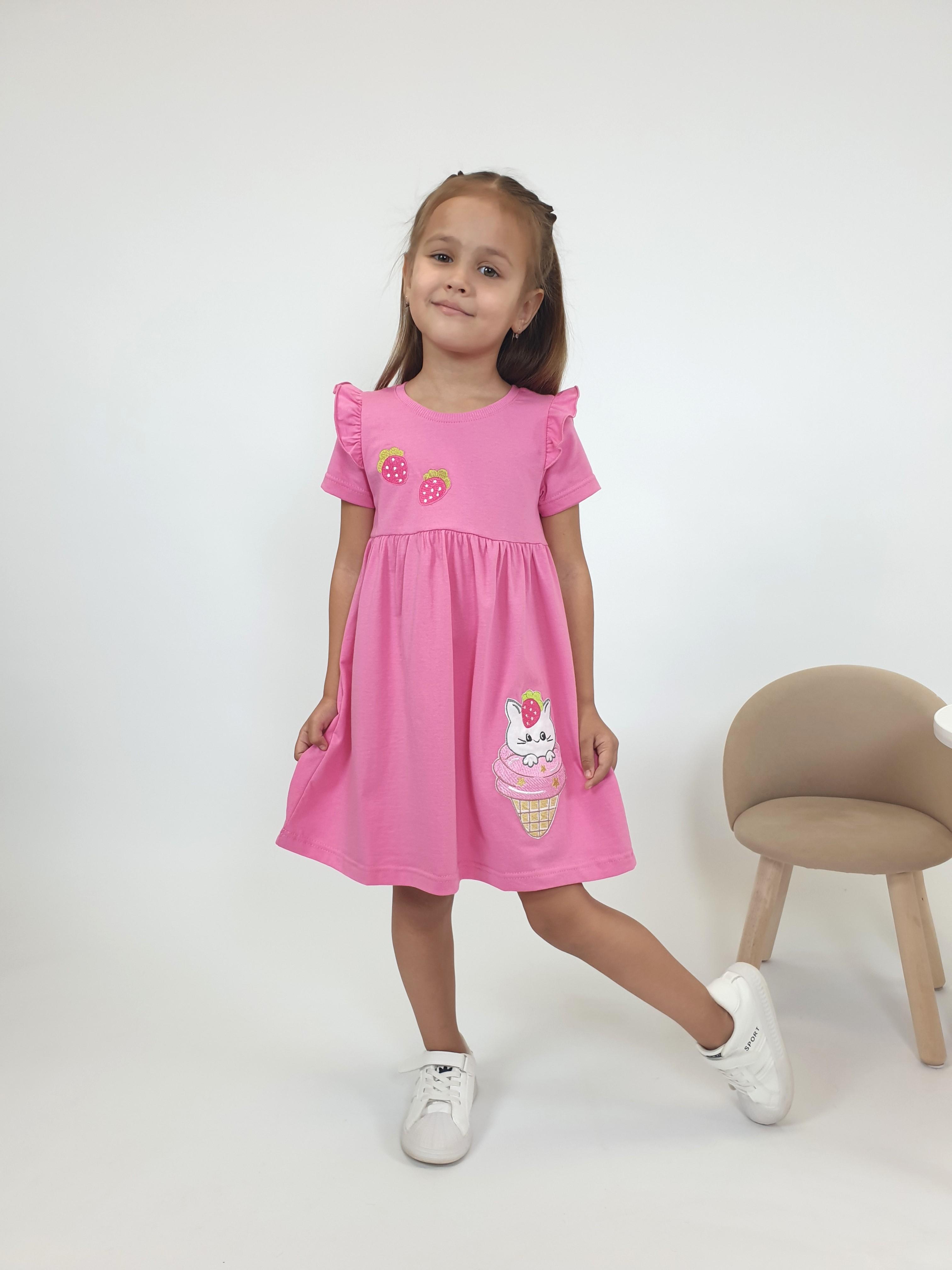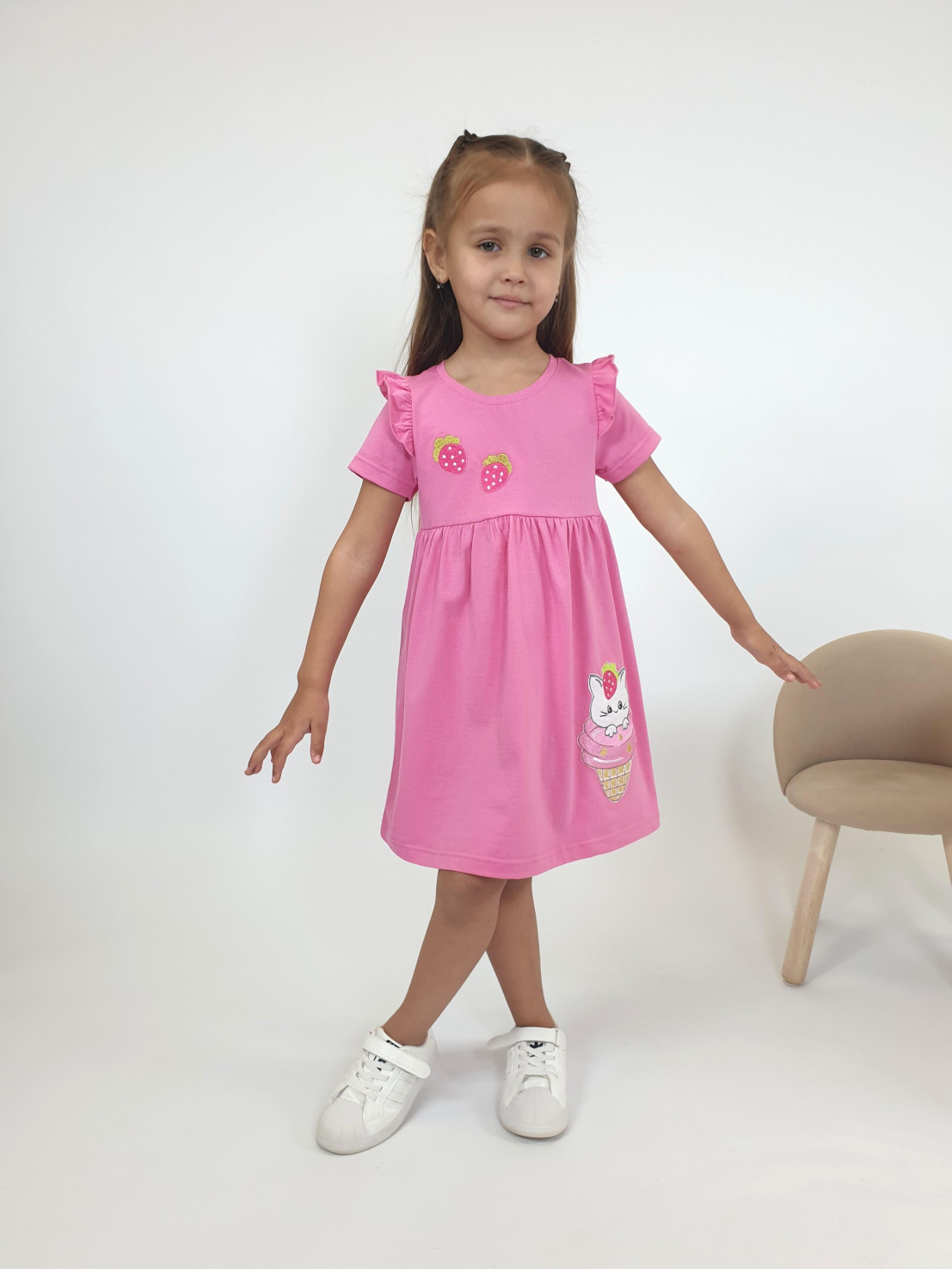 Кулирное полотно:100% х/б. Платье-отрезная юбка со сборкой,с вышивкой на переде.Кокетка переда с печатью.Короткий рукав,в пройме рюша,горловина обработана ластиком.
