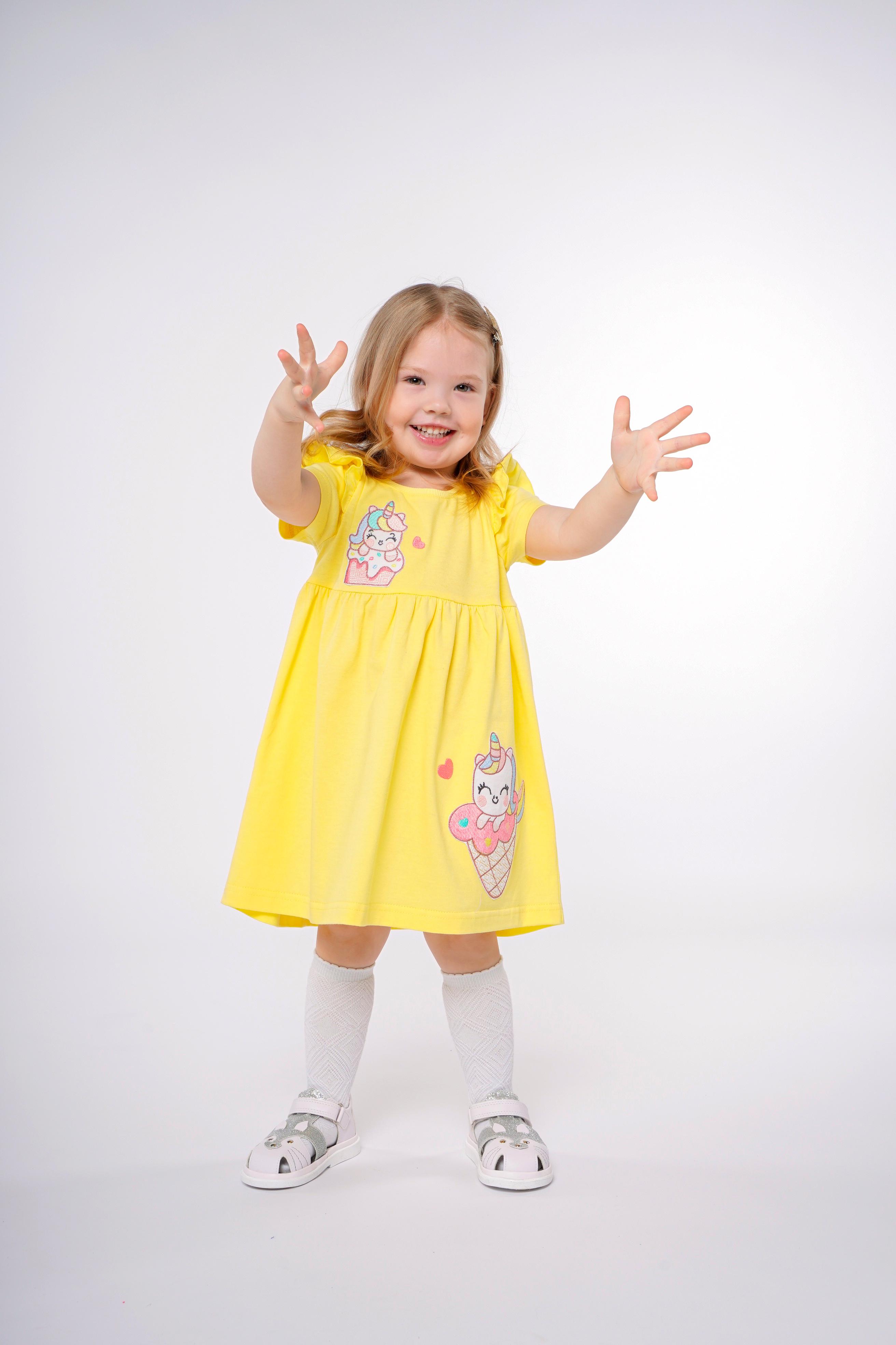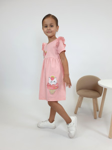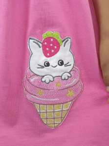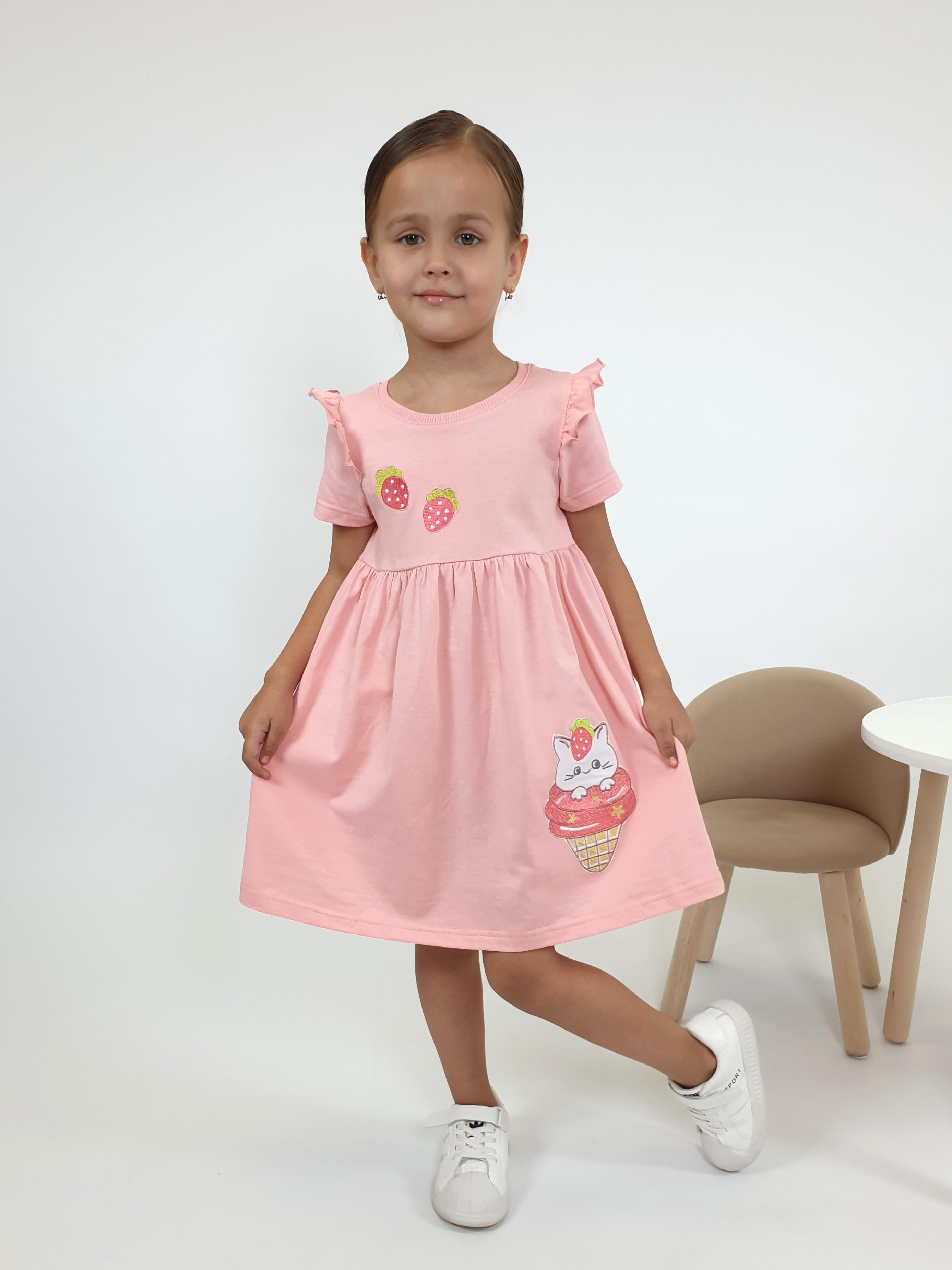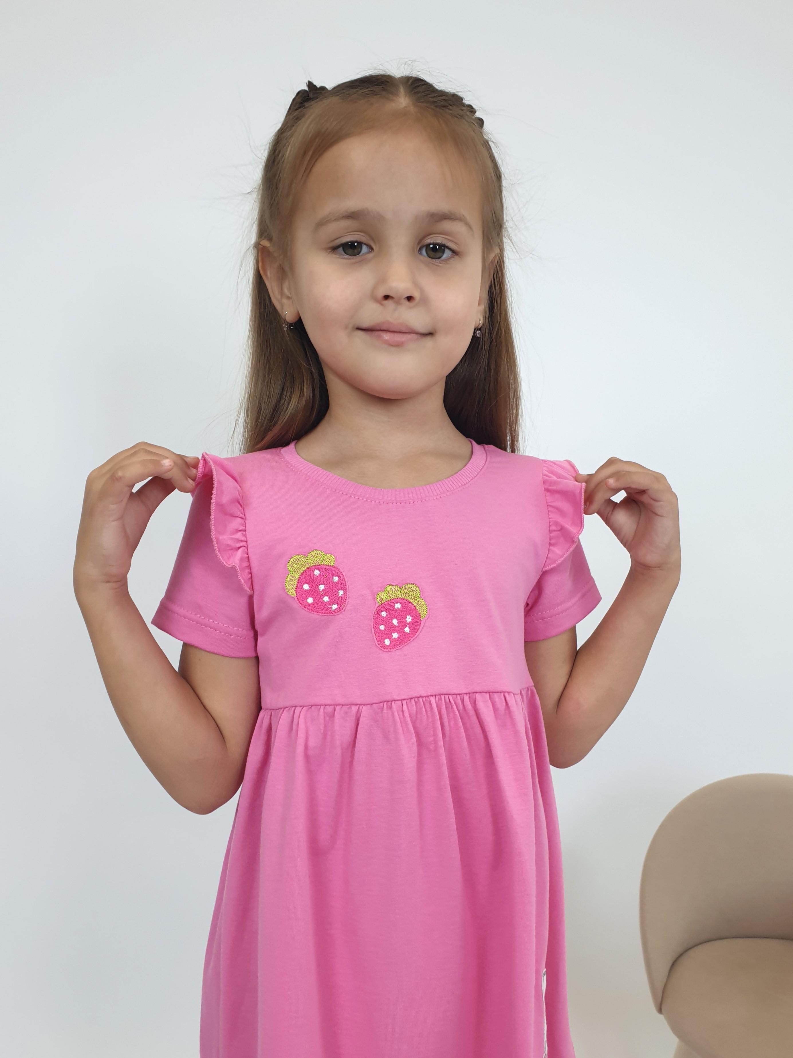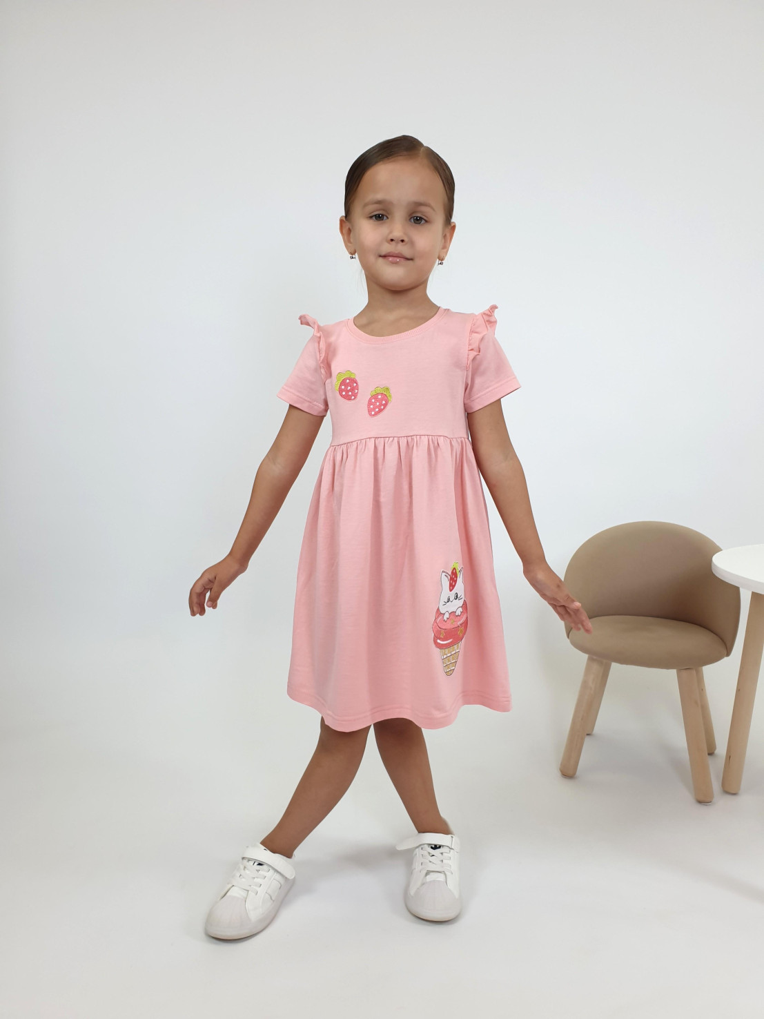 Кулирное полотно:100% х/б. Платье-отрезная юбка со сборкой,с вышивкой на переде.Кокетка переда с печатью.Короткий рукав,в пройме рюша,горловина обработана ластиком.