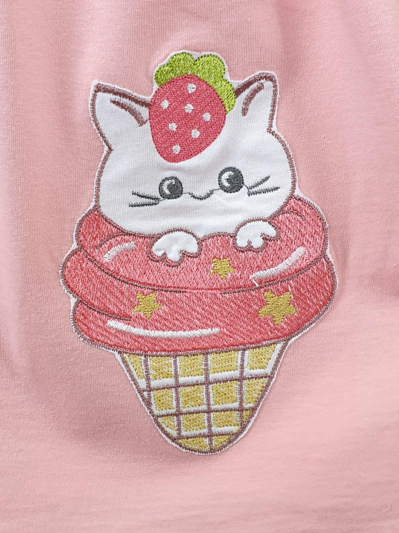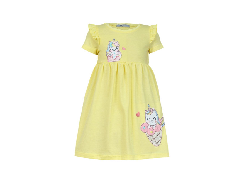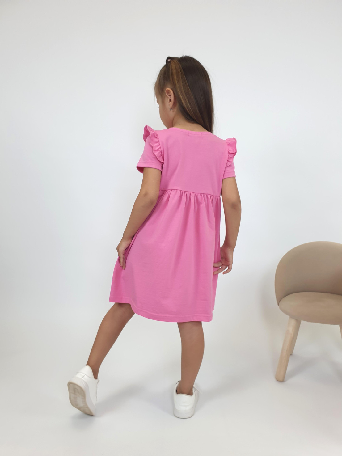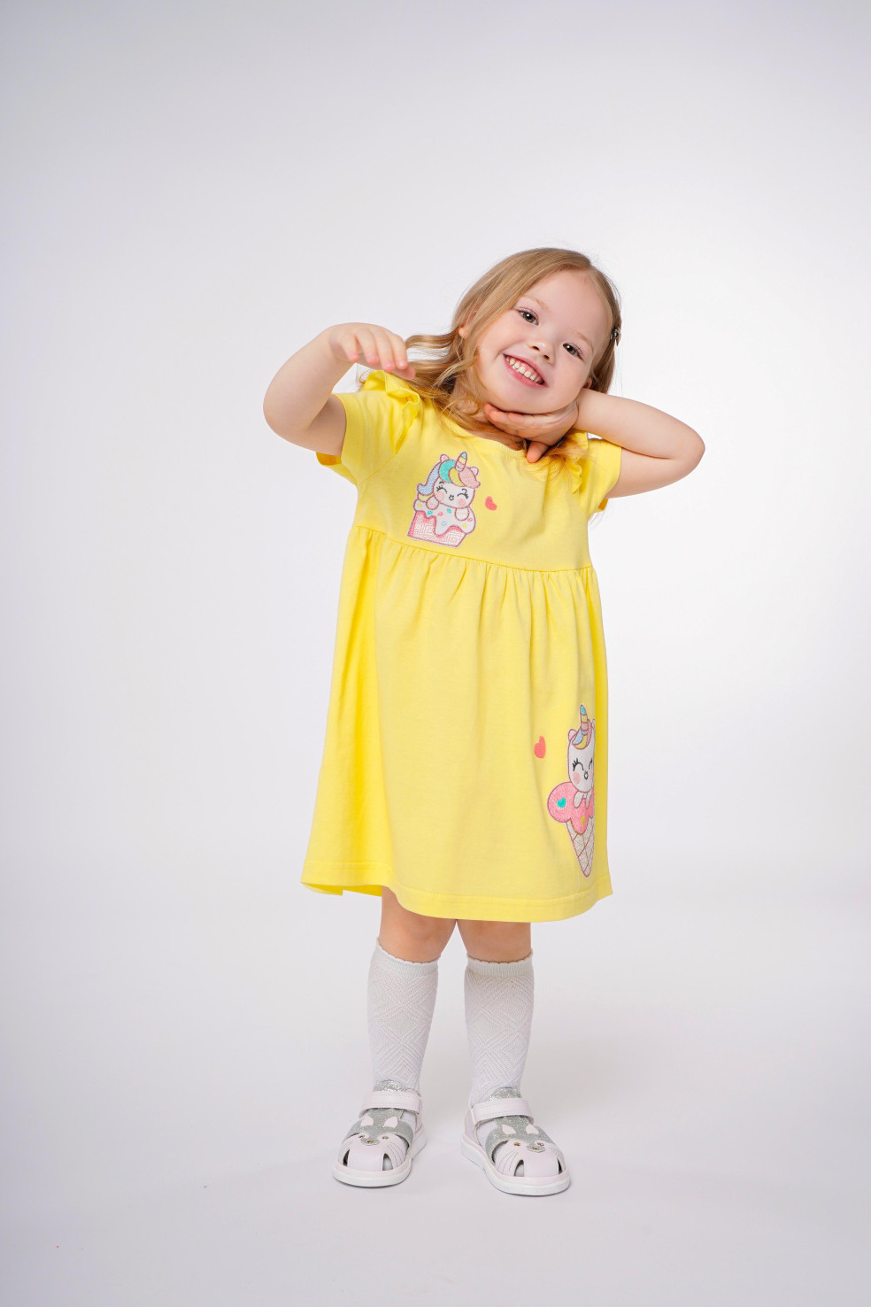 Кулирное полотно:100% х/б. Платье-отрезная юбка со сборкой,с вышивкой на переде.Кокетка переда с печатью.Короткий рукав,в пройме рюша,горловина обработана ластиком.