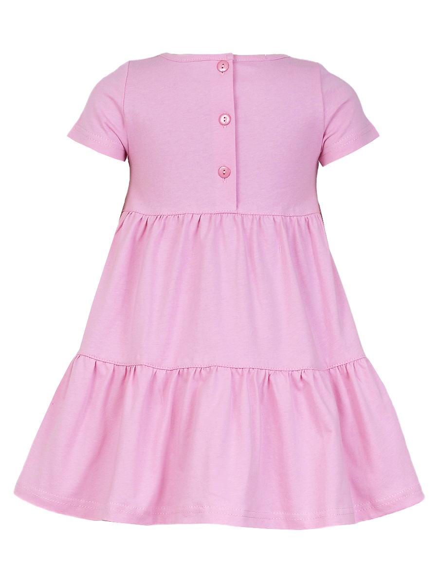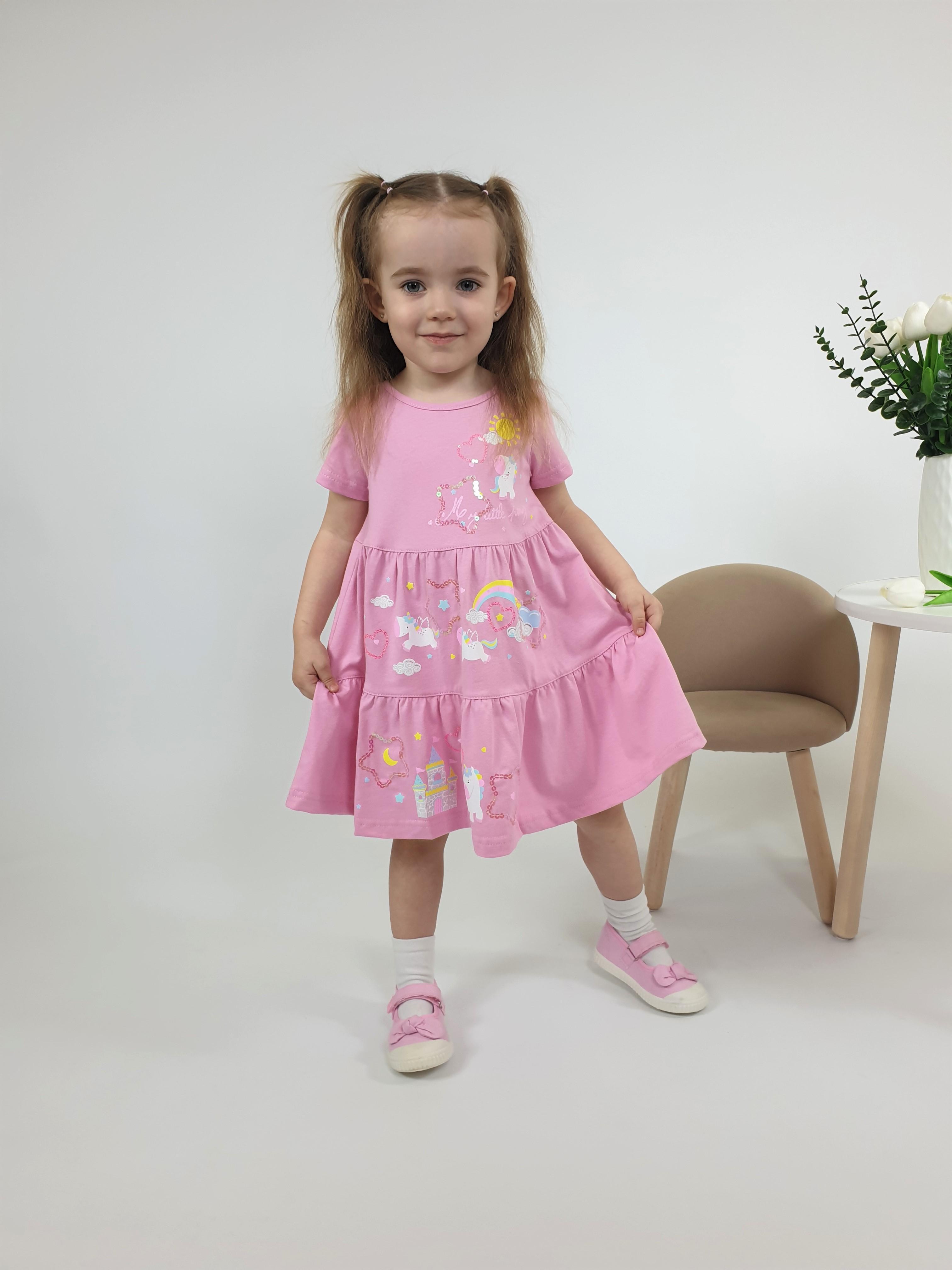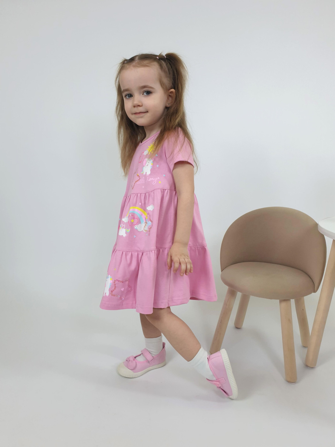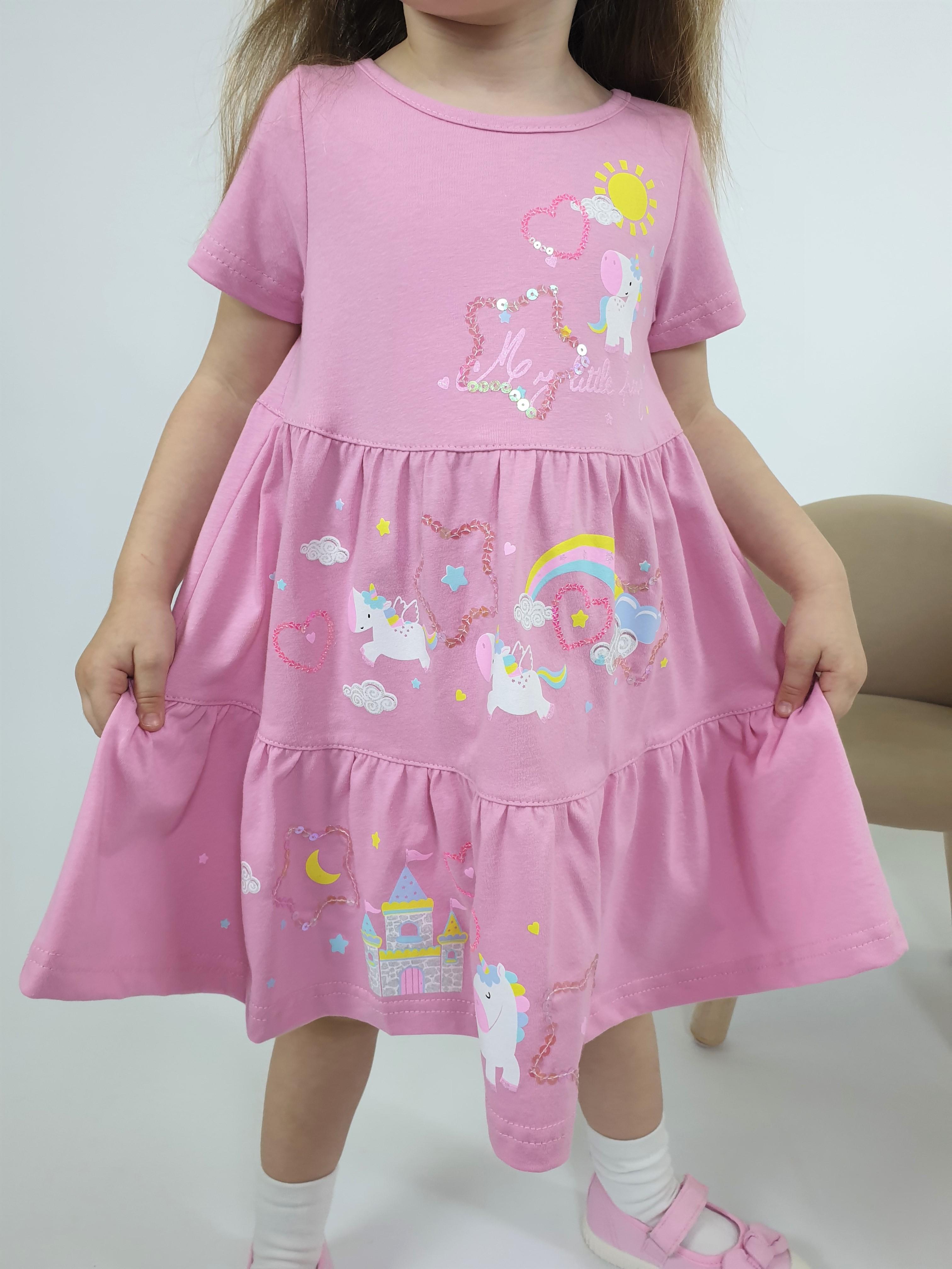 Кулирное полотно:100% х/б. Платье-силуэт трапеция,короткий втачной рукав.Юбка переда и спинки из двух воланов,по передним воланам печать.Кокетка переда с печатью,застежка по спинке на пуговицы.Горловина окантована.Вышивка(пайетки)-на кокетке переда,среднем и нижнем волане.