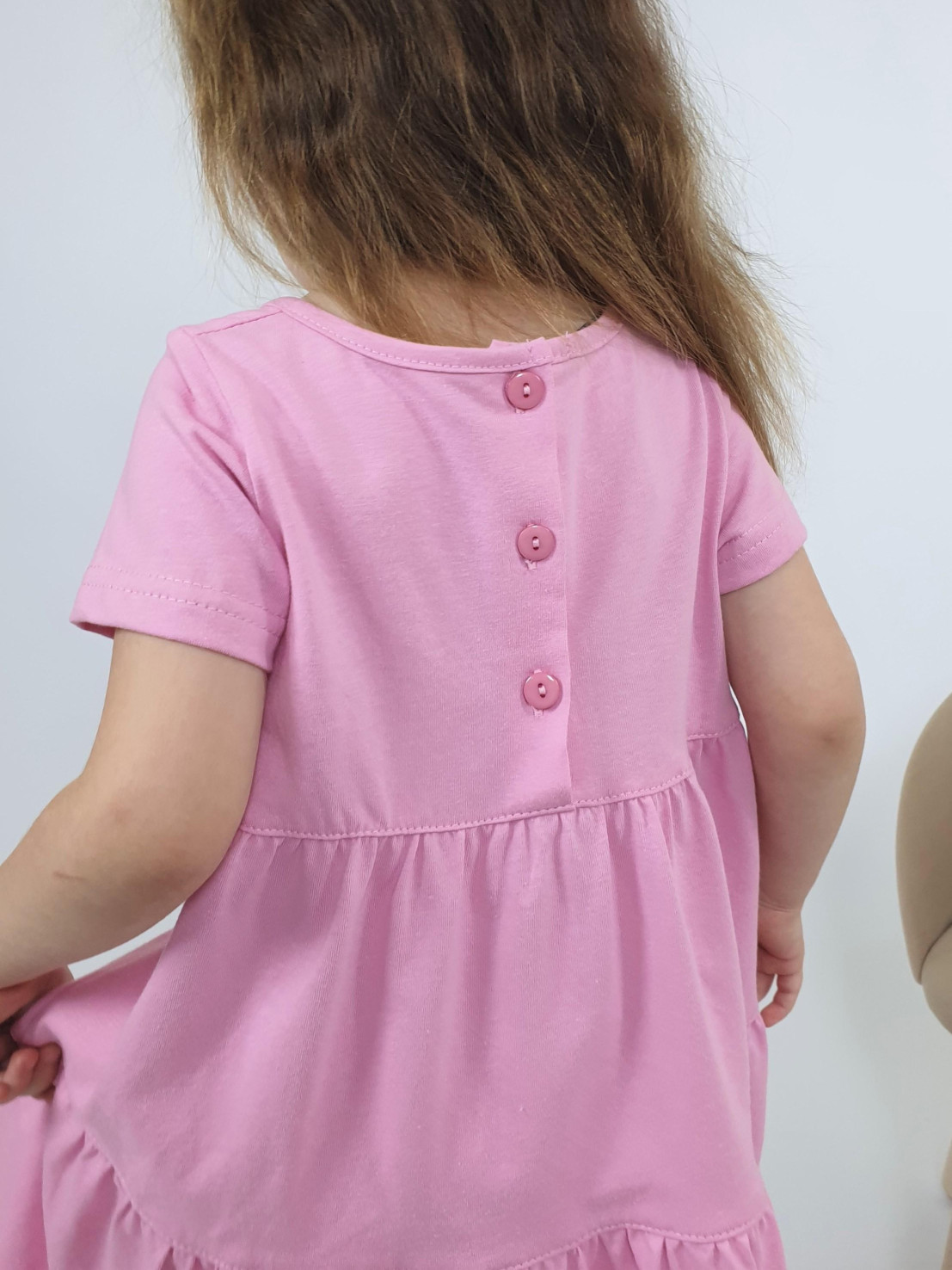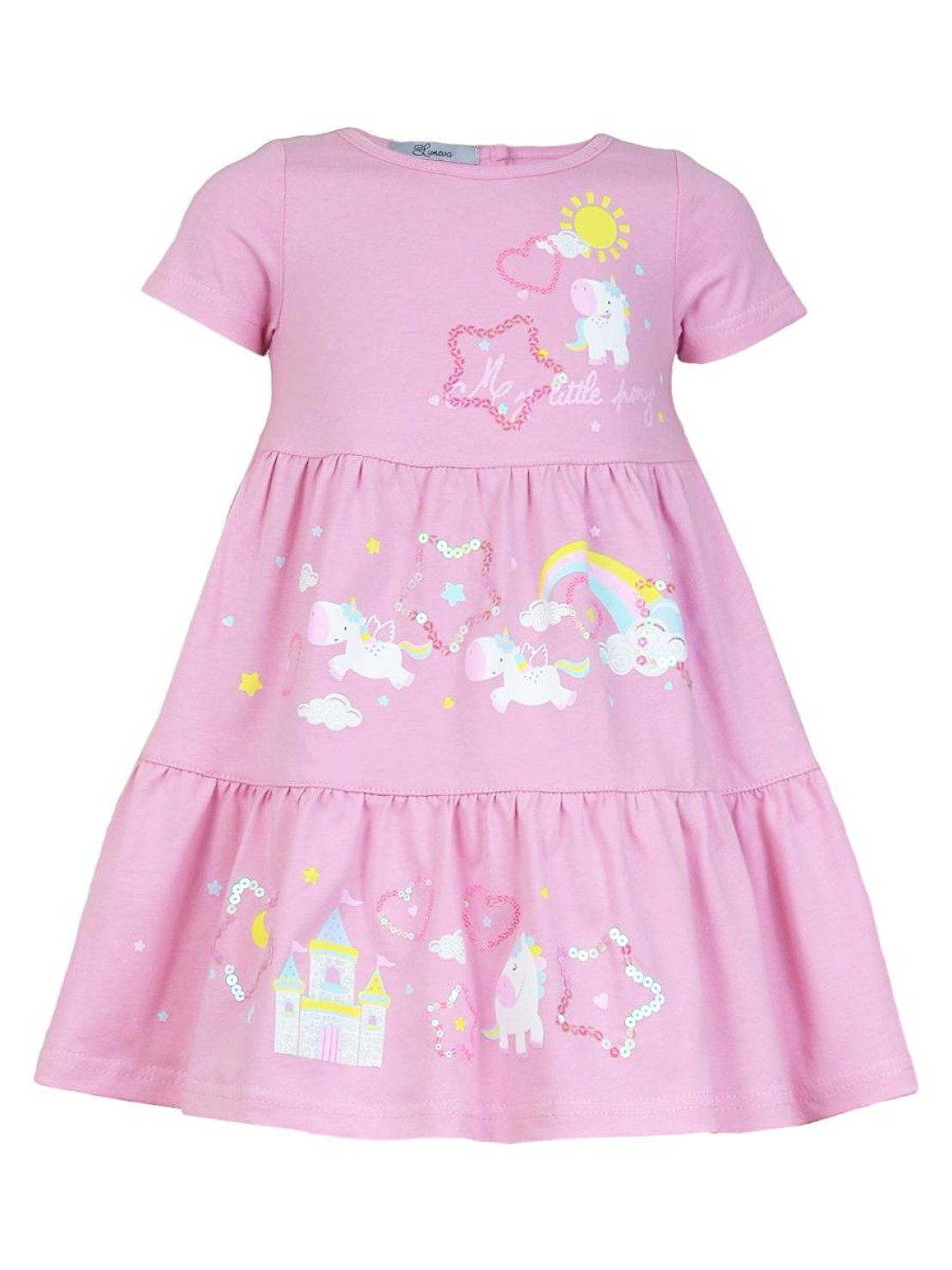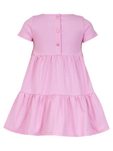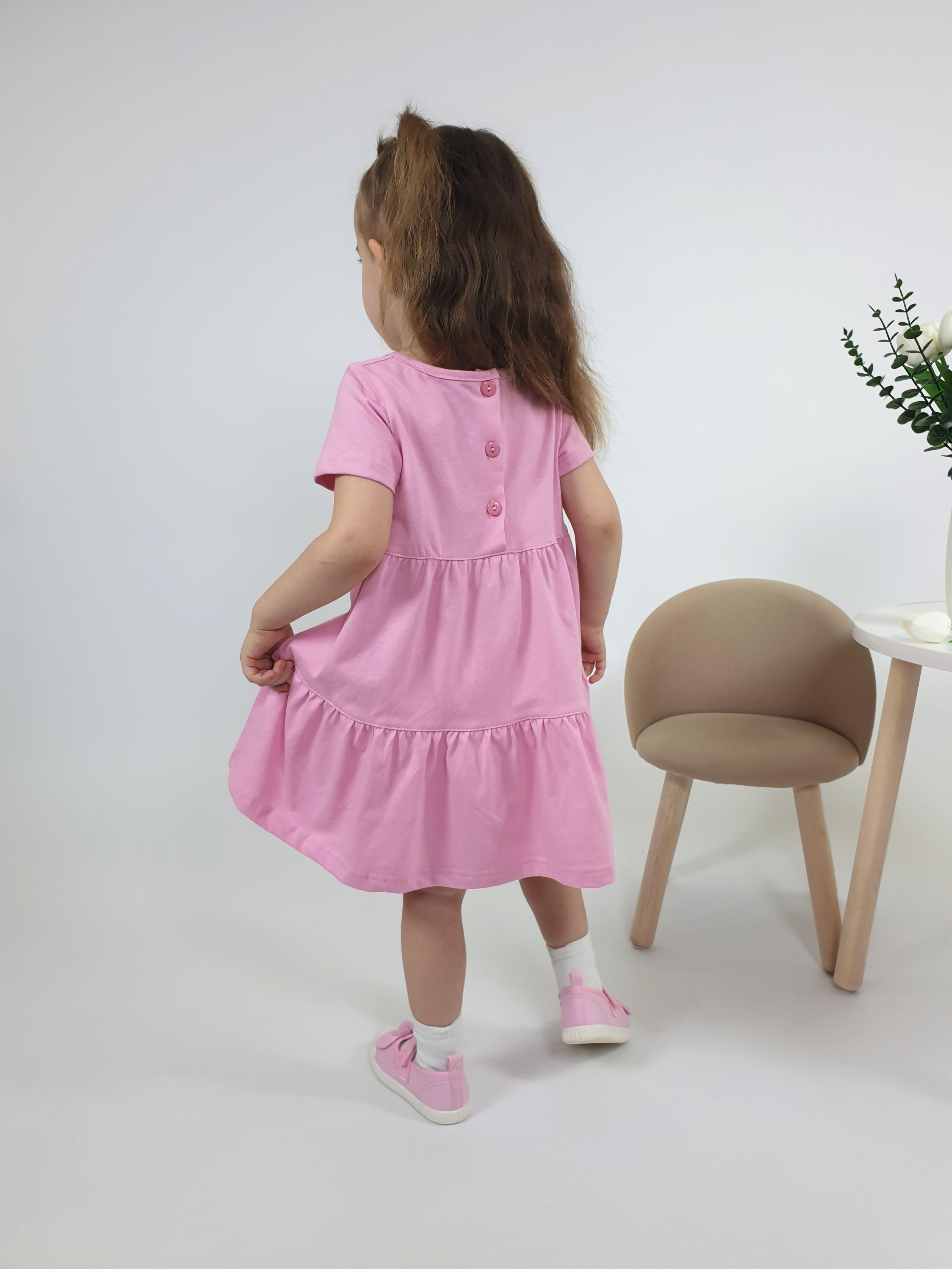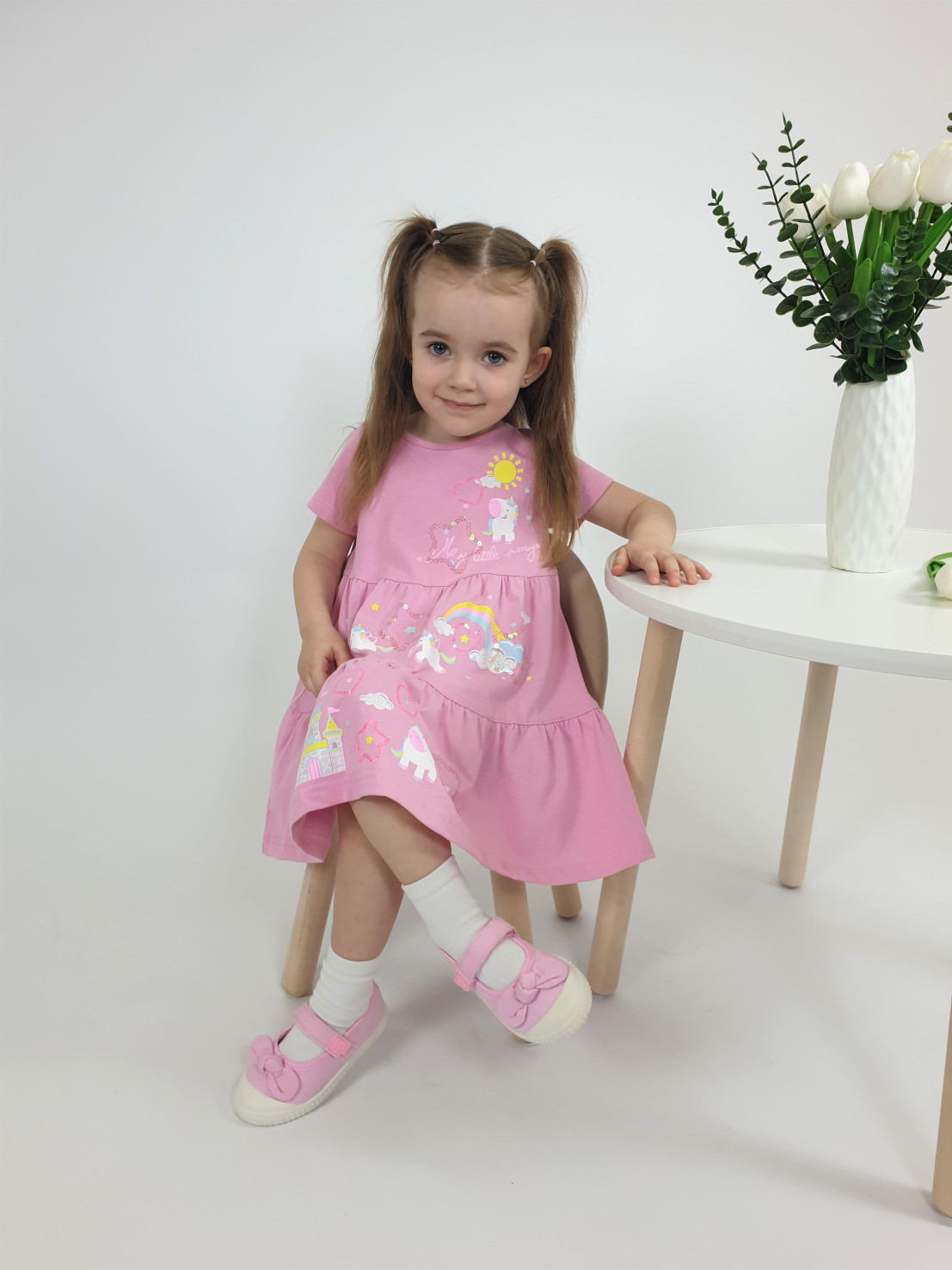 Кулирное полотно:100% х/б. Платье-силуэт трапеция,короткий втачной рукав.Юбка переда и спинки из двух воланов,по передним воланам печать.Кокетка переда с печатью,застежка по спинке на пуговицы.Горловина окантована.Вышивка(пайетки)-на кокетке переда,среднем и нижнем волане.