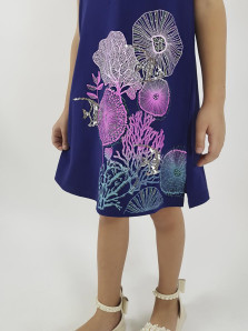 Кулирное полотно: 95% х/б,5% лайкра. Платье-силуэт трапеция,короткий втачной рукав на манжете.Перед с печатью и вышивкой-пайетки,сбоку разрезы.Вырез горловины обработан планкой.