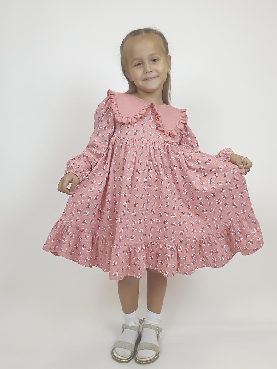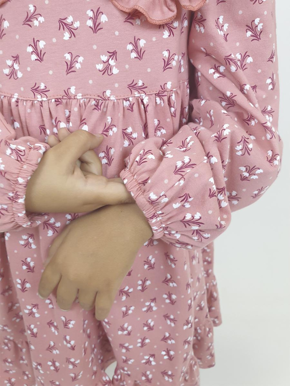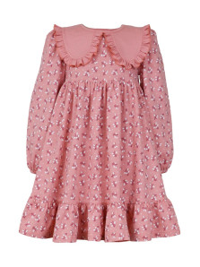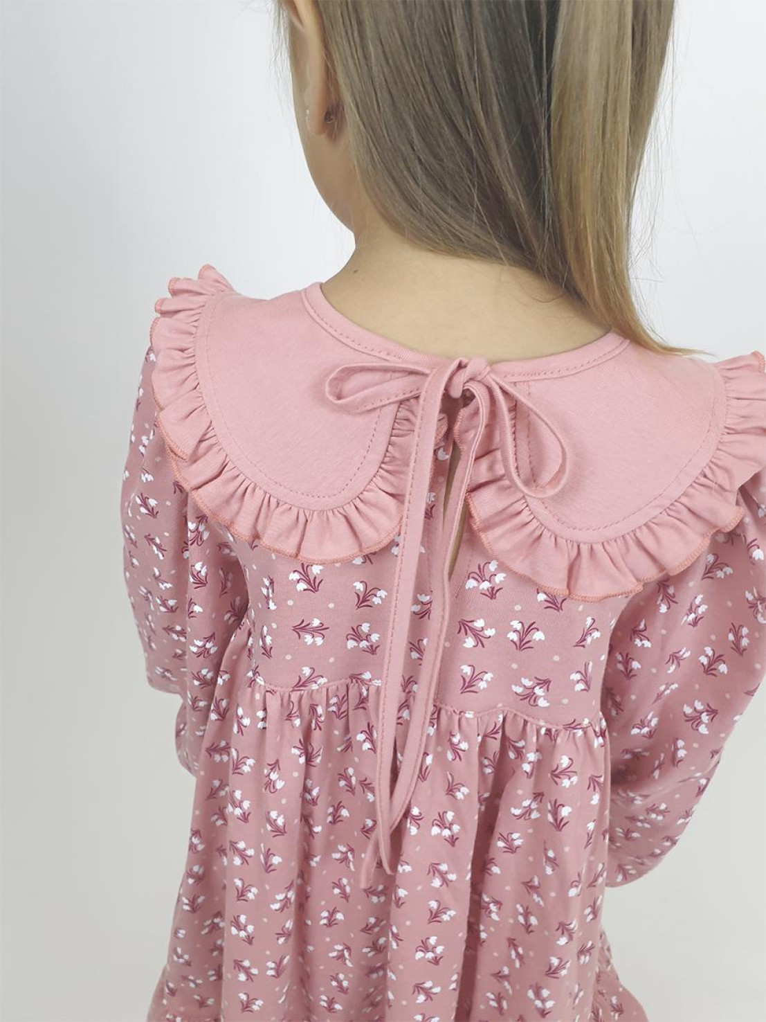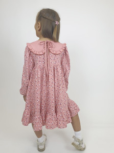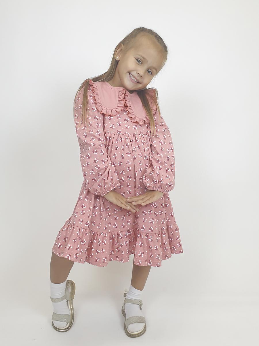 Кулирное полотно:100% х/б. Платье-силуэт трапеция,длинный втачной рукав сборка по окату,внизу на резинке.Юбка отрезная со сборкой,внизу с воланом.Горловина окантована и подшита,застежка на пуговицу по спинке.Отделочный,съемный воротник.
