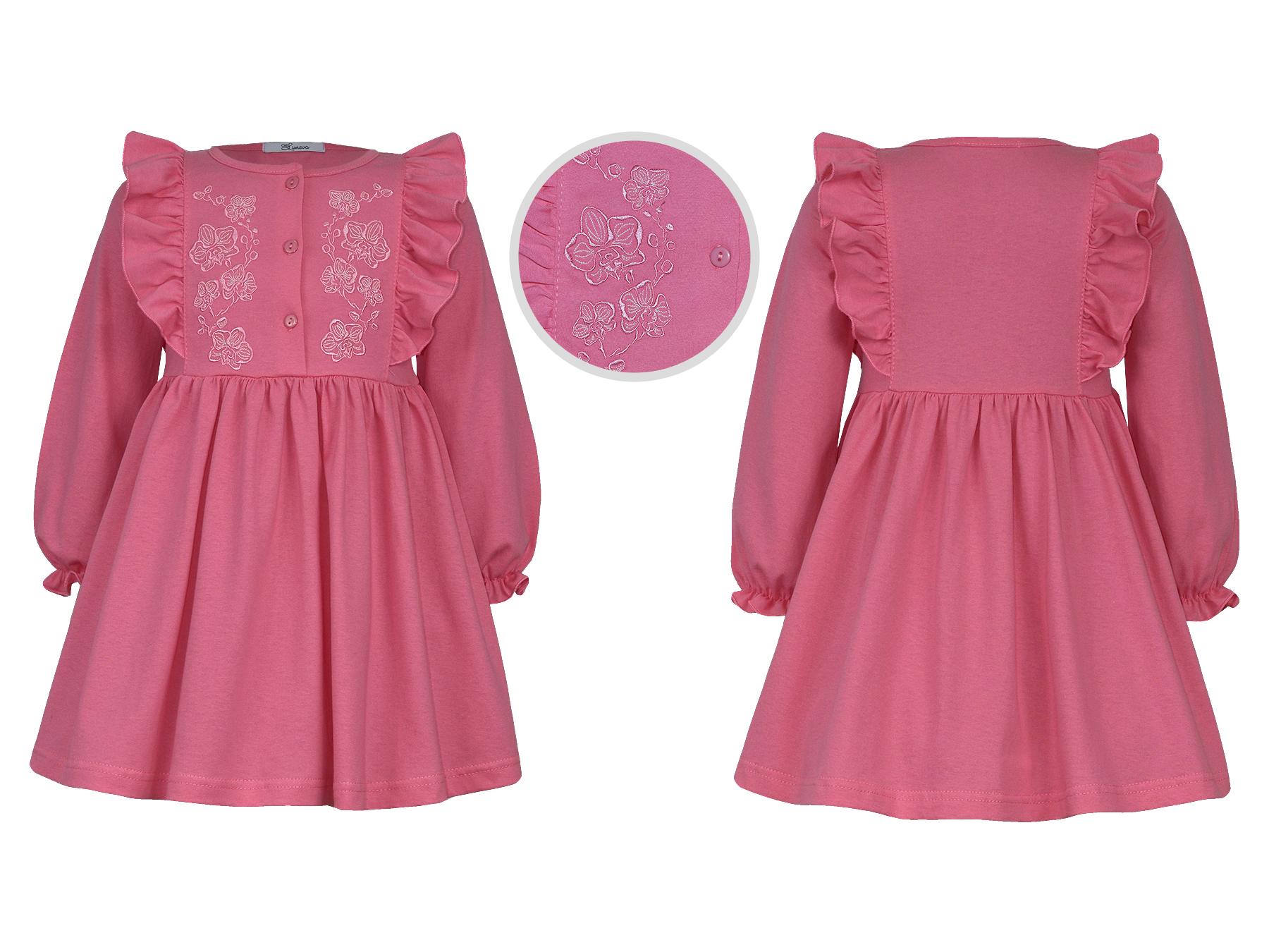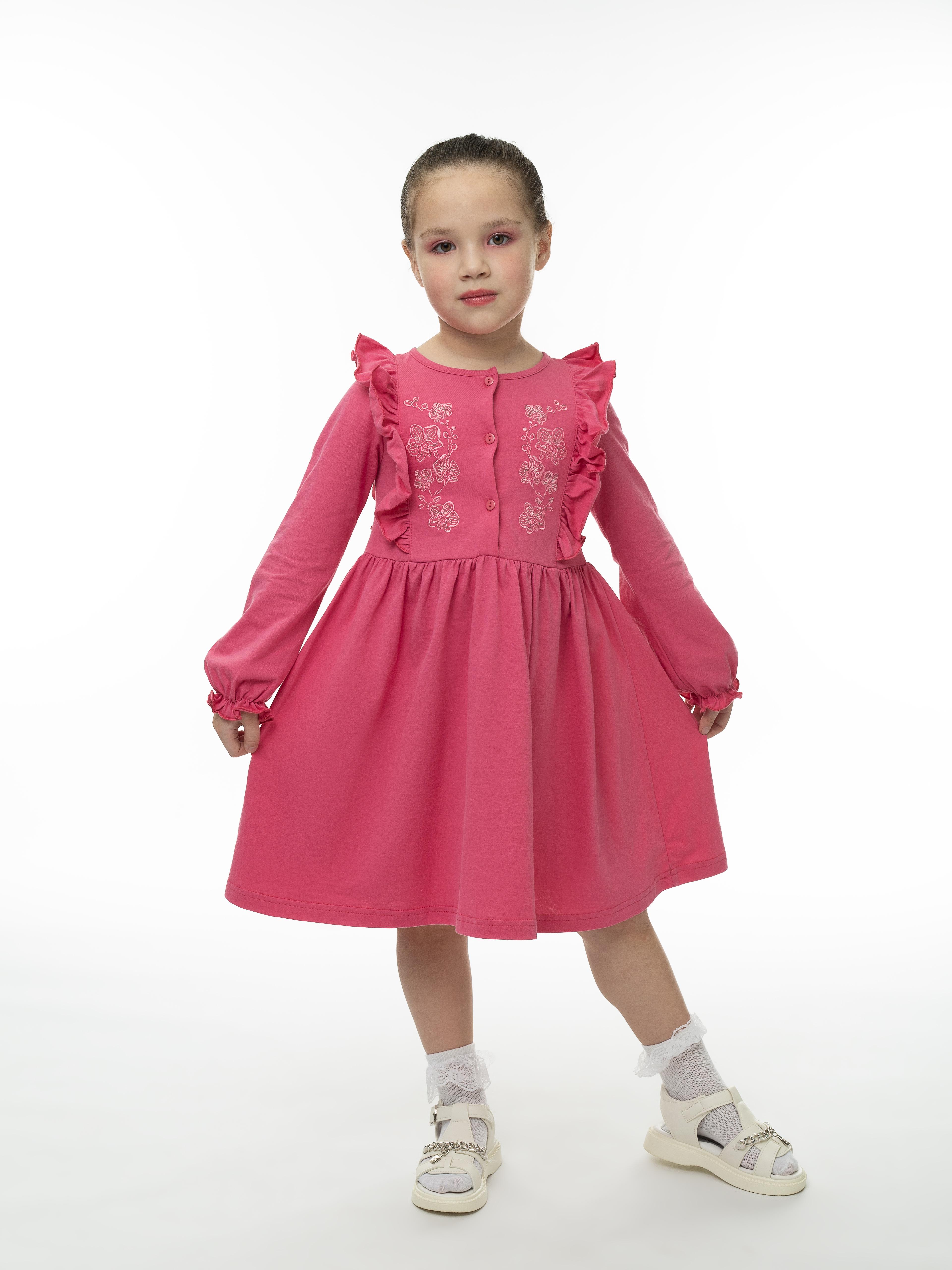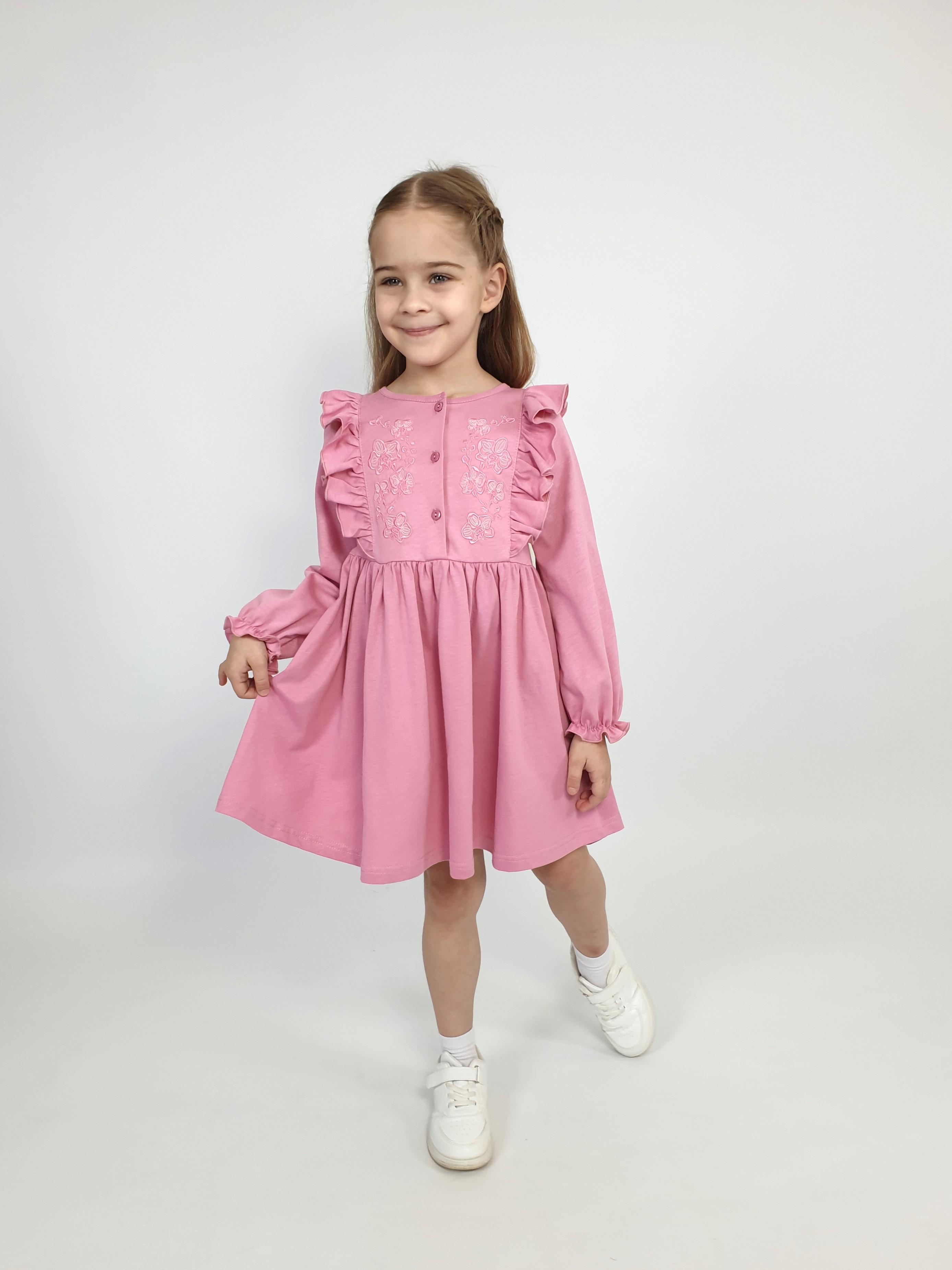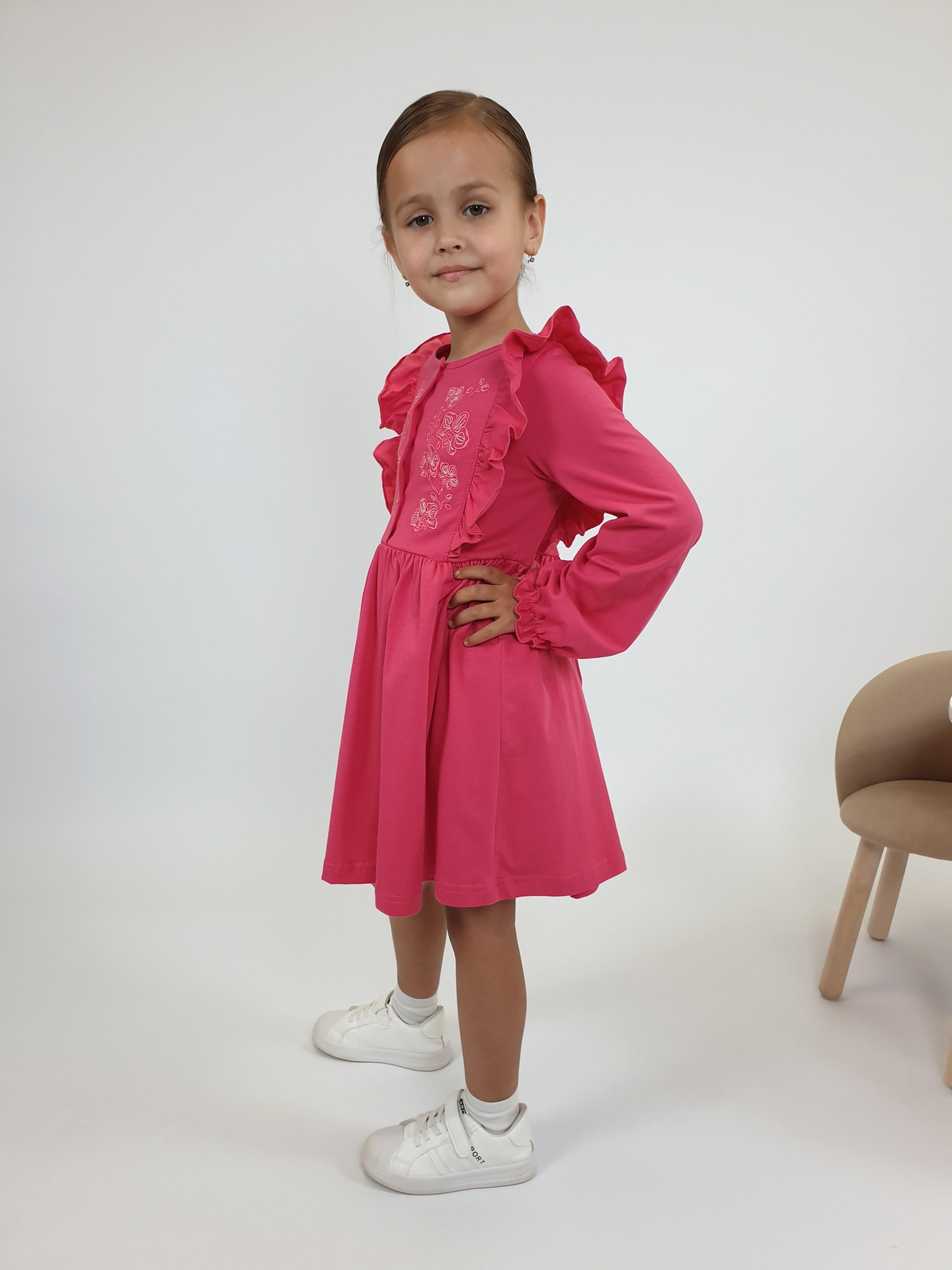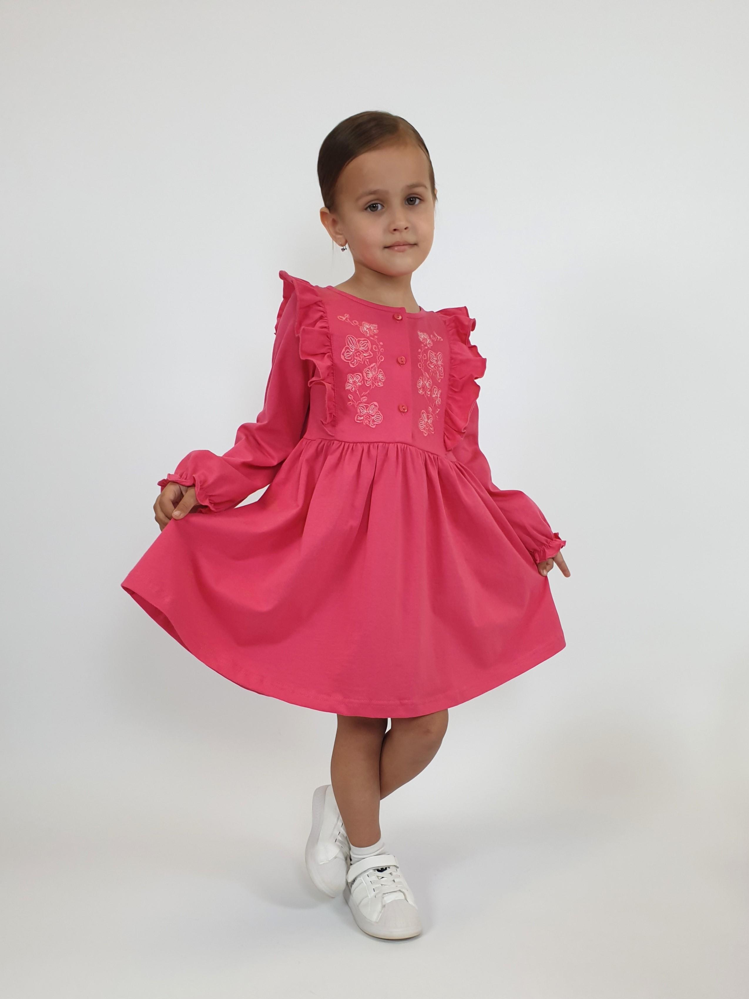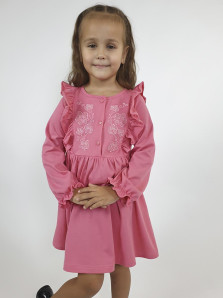 Кулирное полотно:100% х/б. Платье-полуприлегающего силуэта,длинный рукав с резинкой "венгерка" внизу.Отрезная юбка со сборкой.рельефы с рюшей.Вышивка на переде.Горловина окантована.застежка центральная на пуговицы.