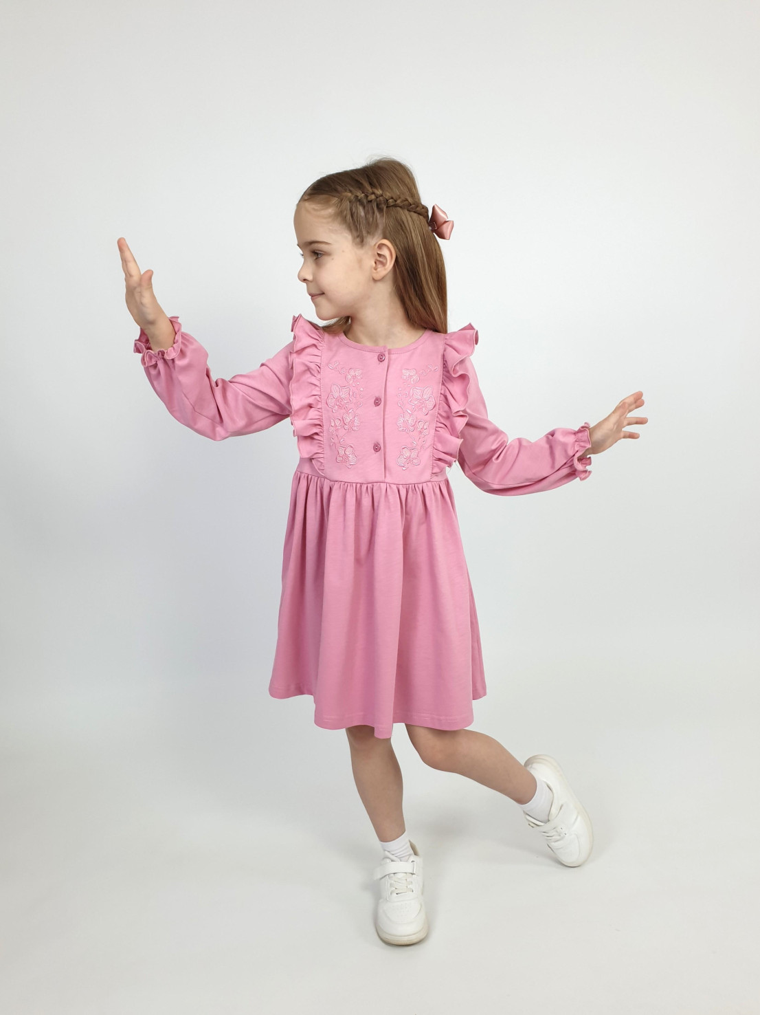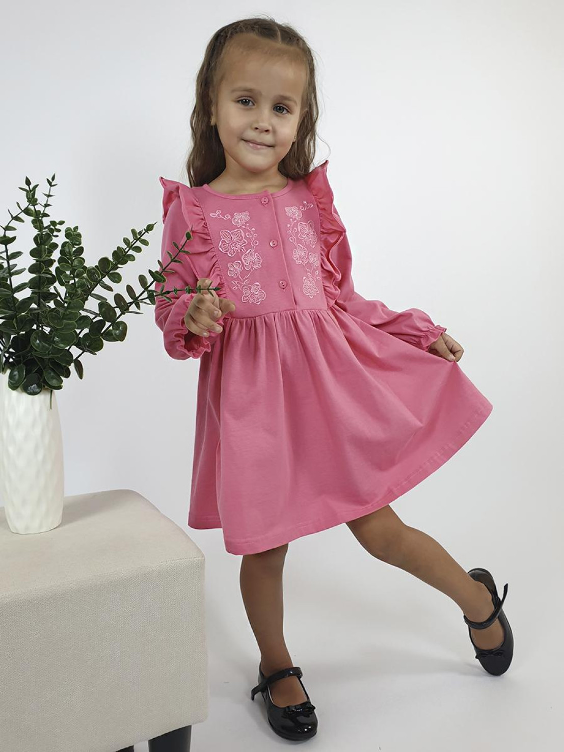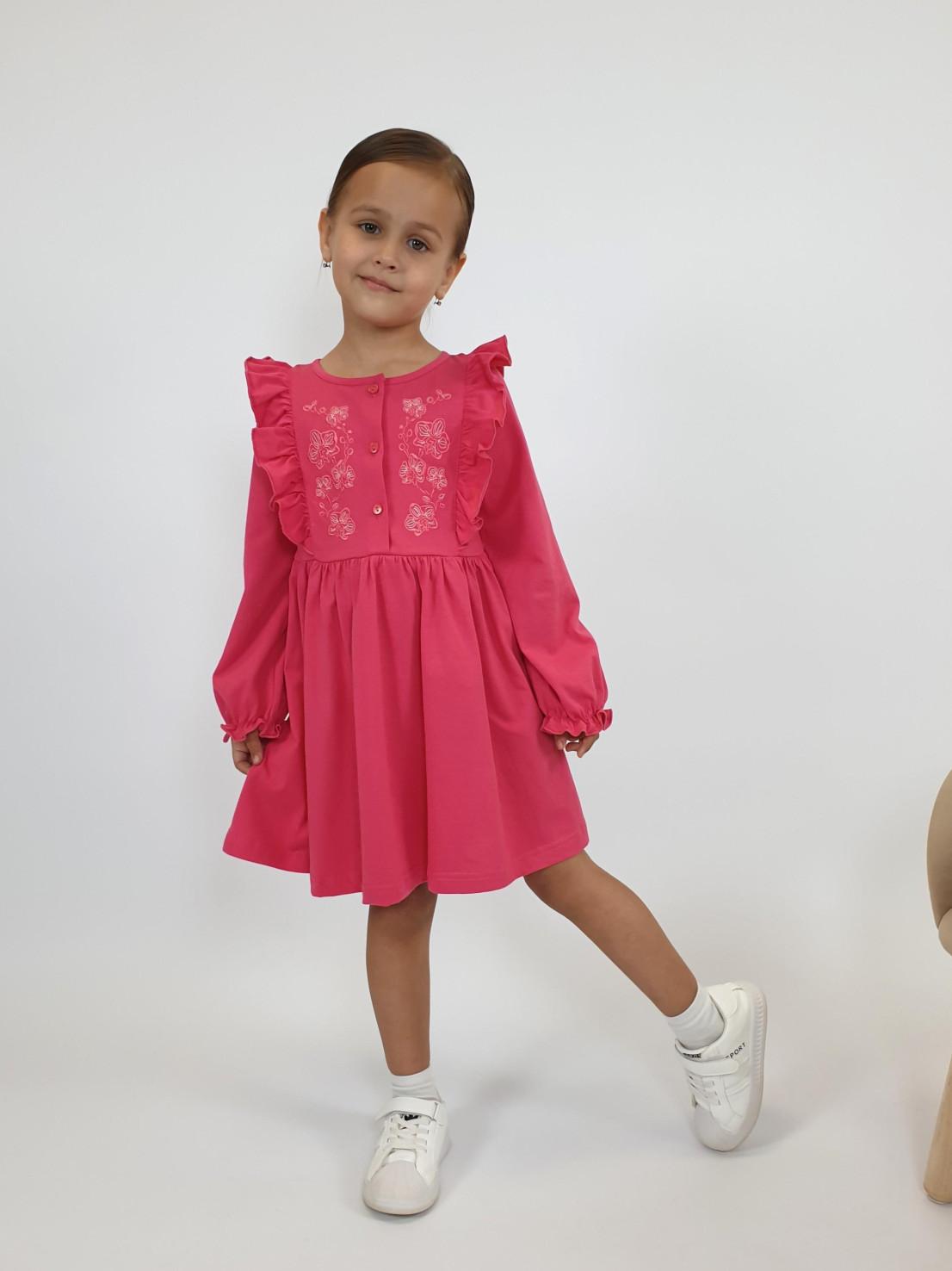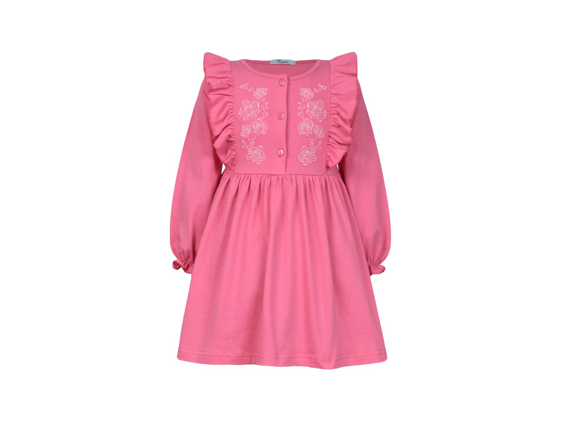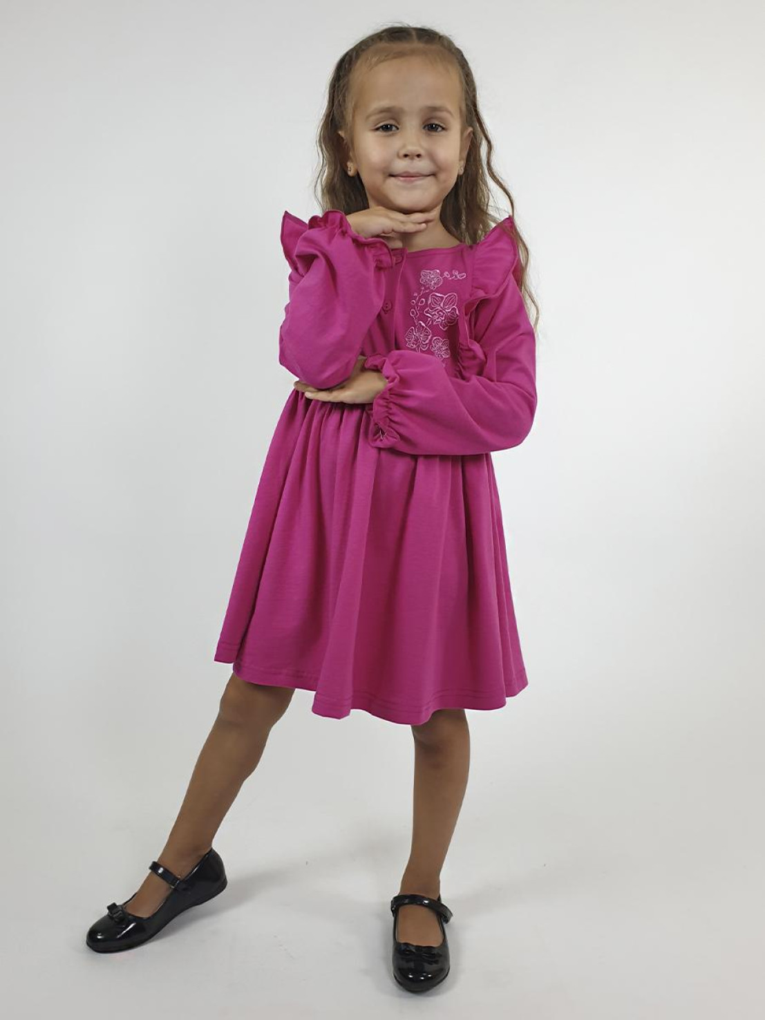 Кулирное полотно:100% х/б. Платье-полуприлегающего силуэта,длинный рукав с резинкой "венгерка" внизу.Отрезная юбка со сборкой.рельефы с рюшей.Вышивка на переде.Горловина окантована.застежка центральная на пуговицы.