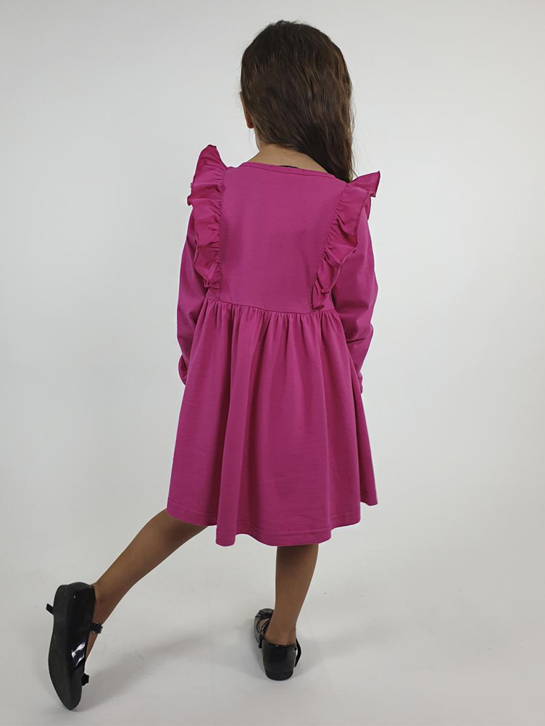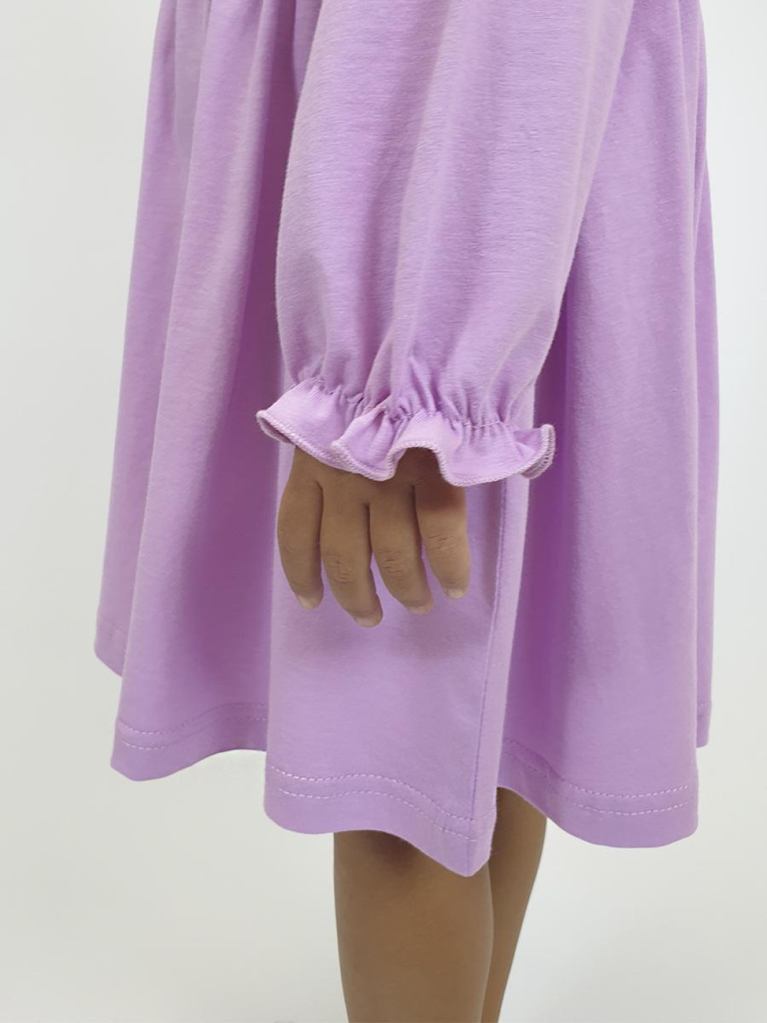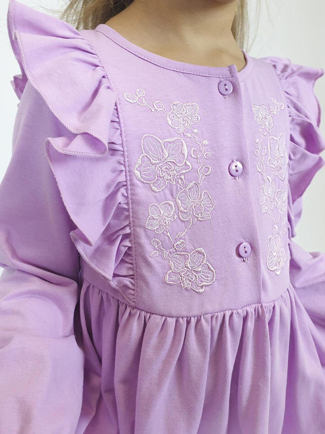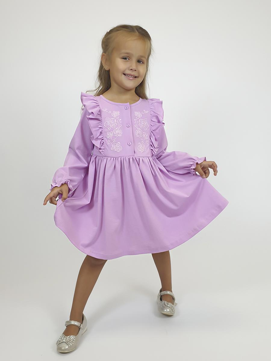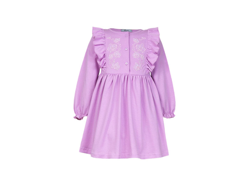 Кулирное полотно:100% х/б. Платье-полуприлегающего силуэта,длинный рукав с резинкой "венгерка" внизу.Отрезная юбка со сборкой.рельефы с рюшей.Вышивка на переде.Горловина окантована.застежка центральная на пуговицы.