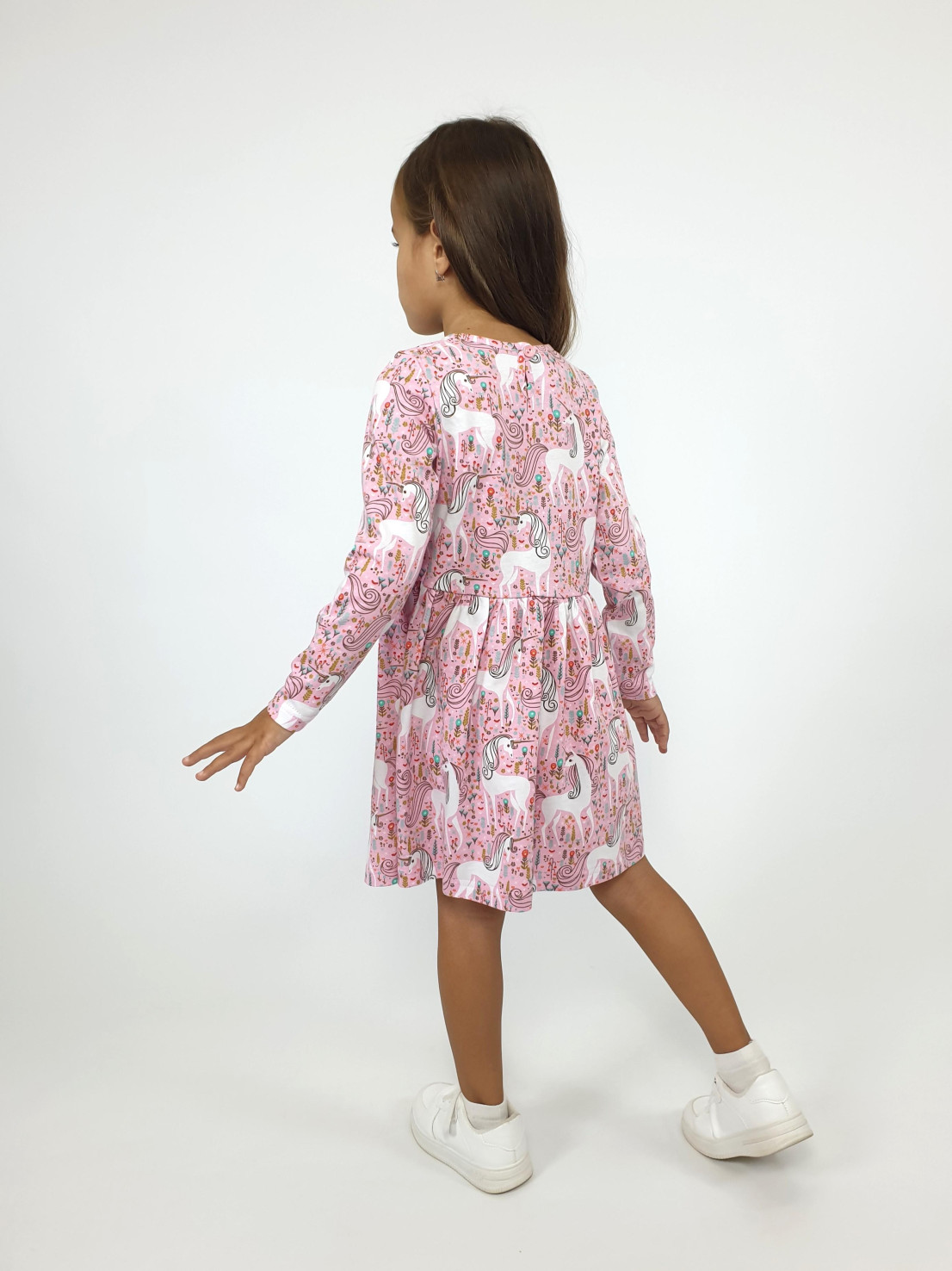 Кулирное полотно (набивка):100% х/б. Платье-полуприлегающего силуэта,отрезная юбка со сборкой.Втачной,длинный рукав.Застежка на спинке капля с пуговицей,горловина окантована.