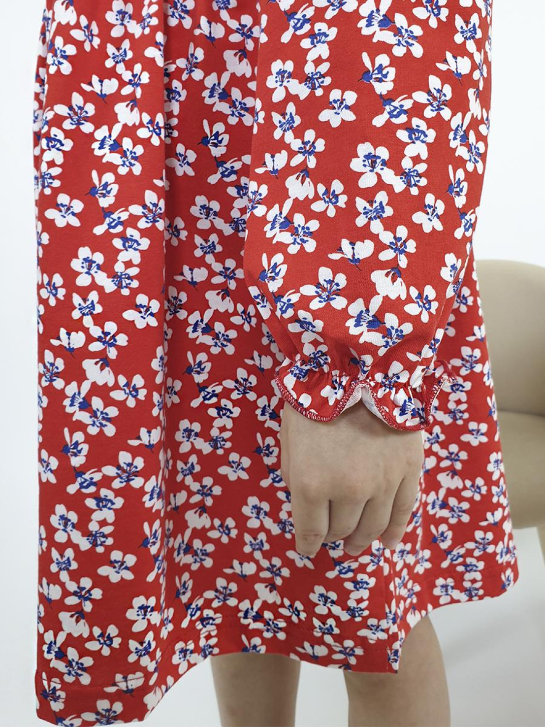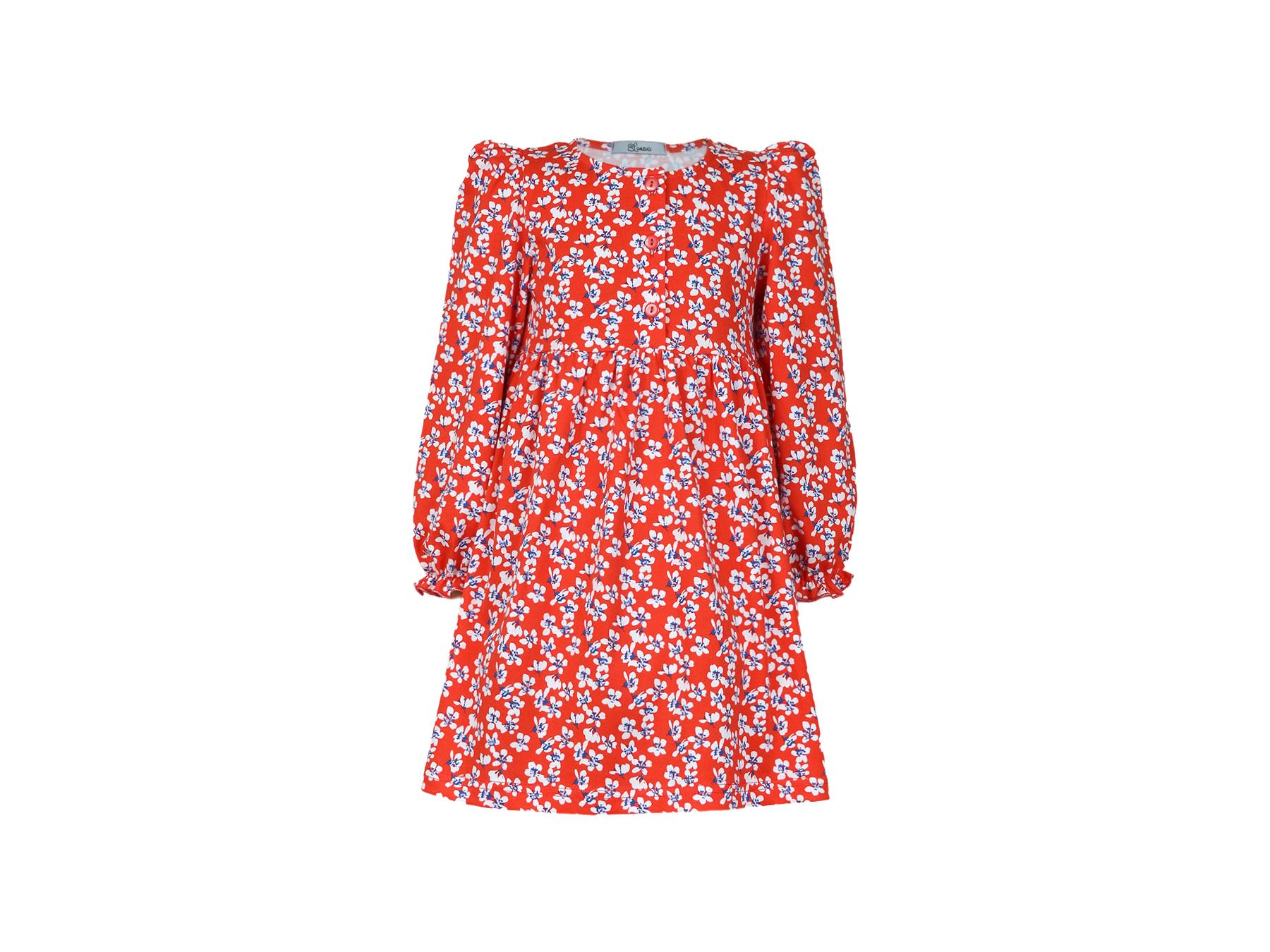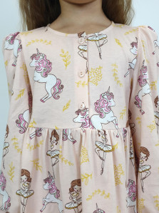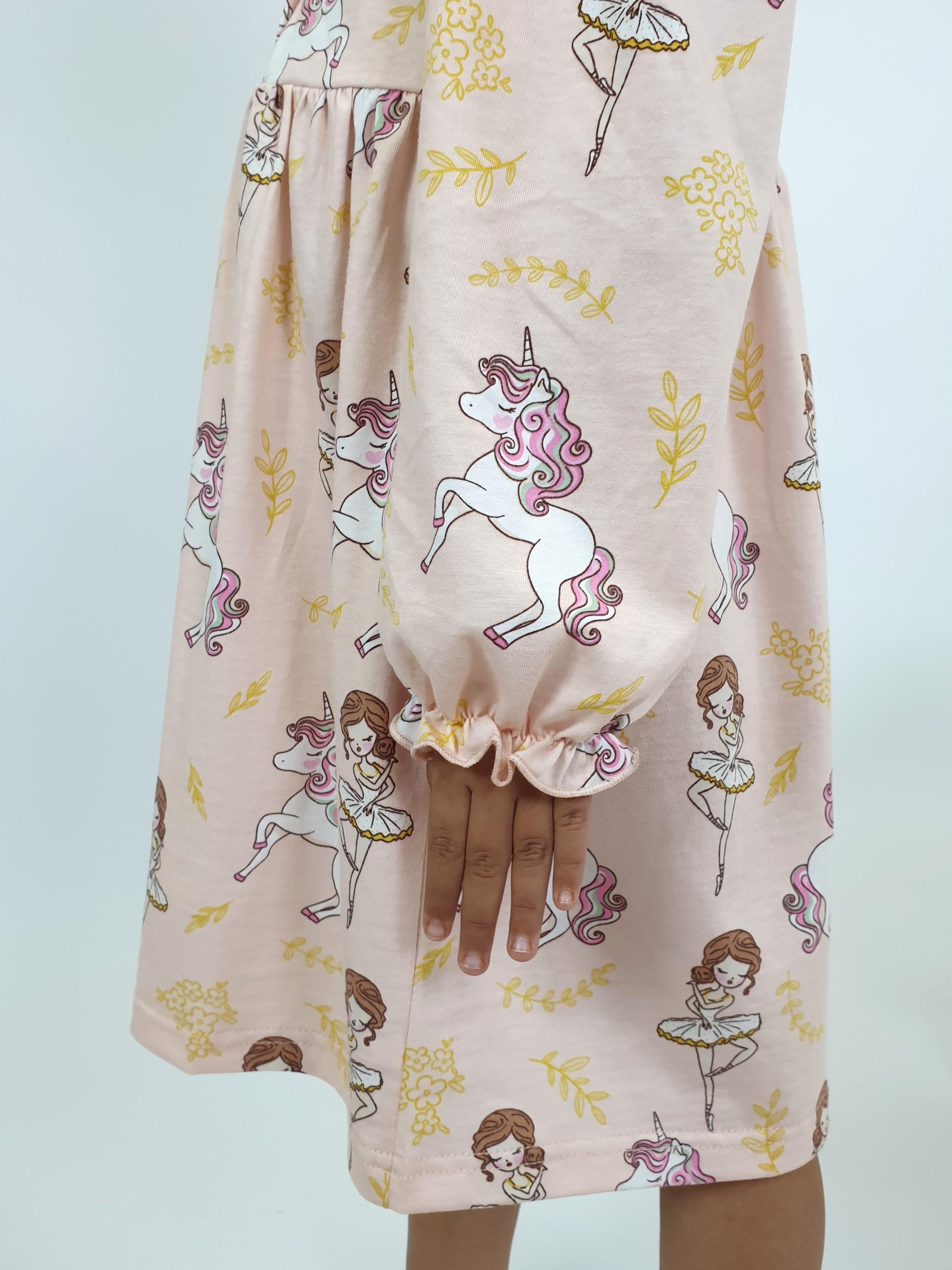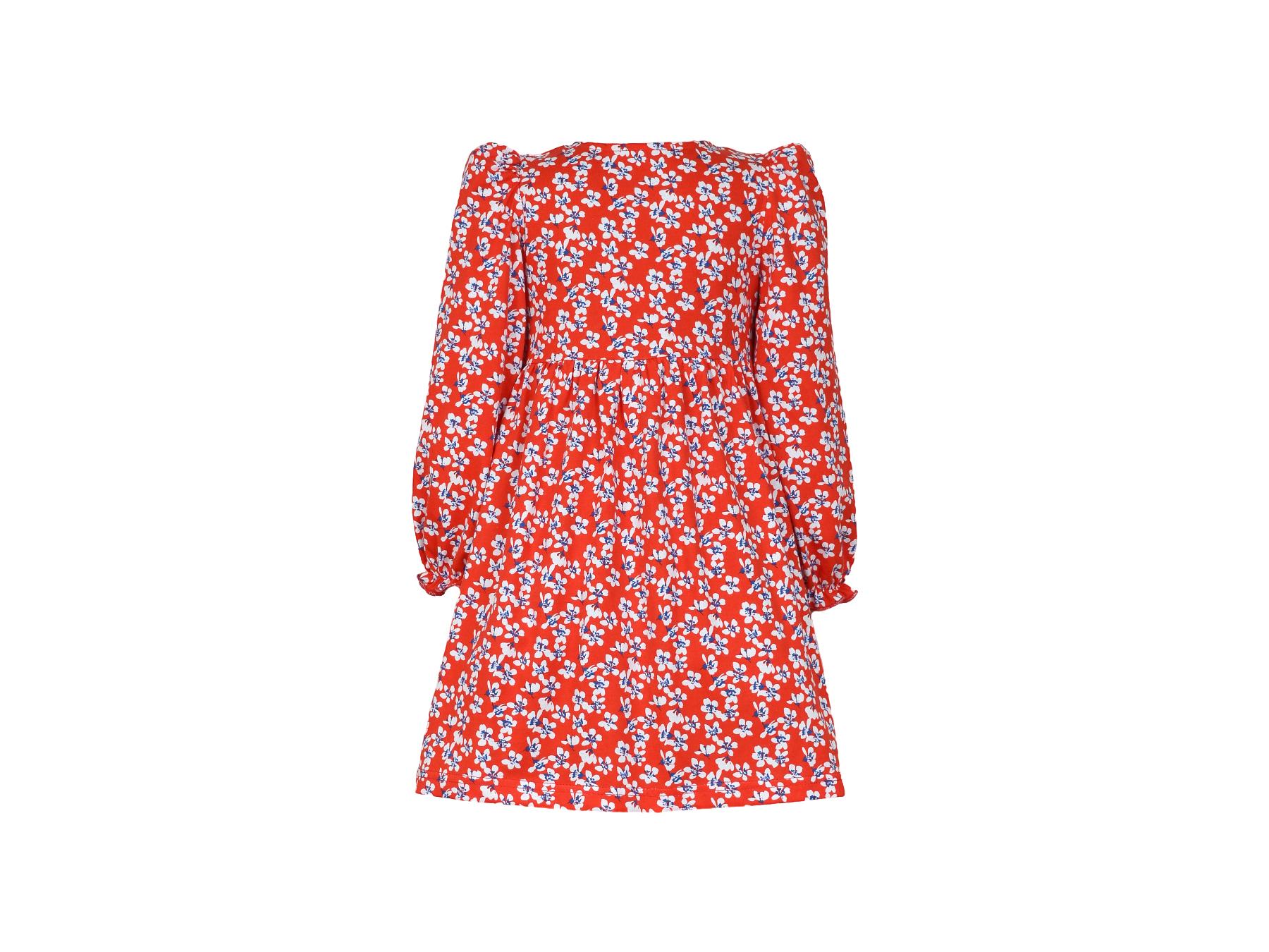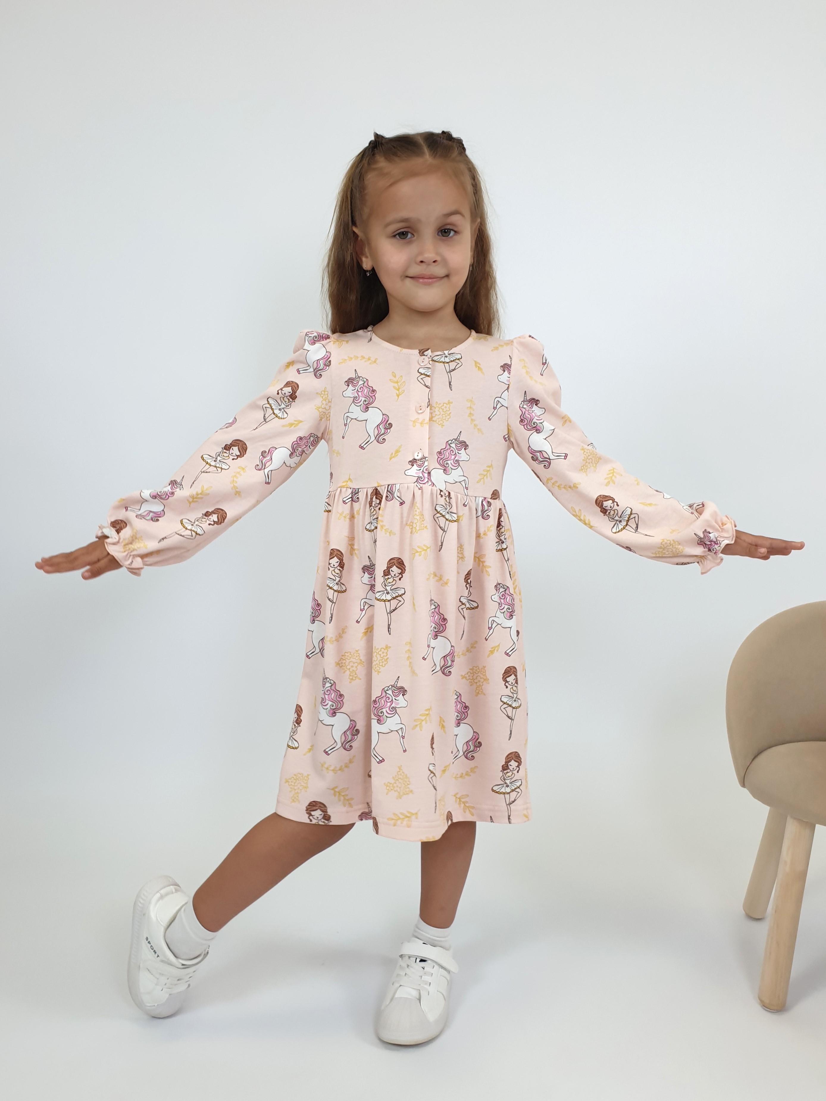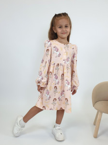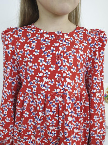 Кулирное полотно:100%х/б. Платье-силуэт трапеция,длинный рукав с резинкой "венгерка"внизу.сборка по окату.Отрезная юбка в сборку.Горловина окантована и подшита,застежка центральная на пуговицы.