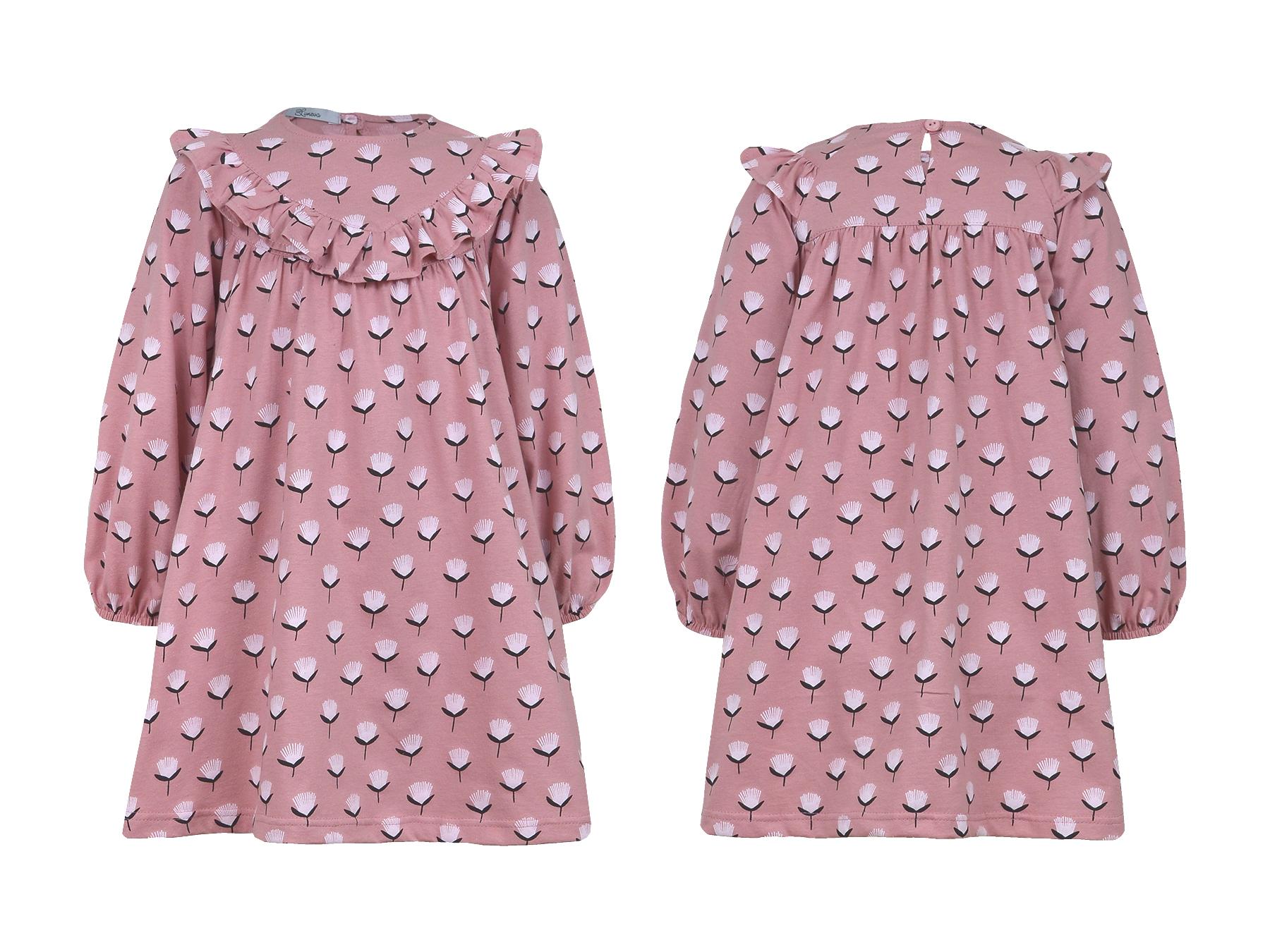 Кулирное полотно:100%х/б. Платье-силуэт трапеция,длинный рукав с резинкой внизу,сборка по окату.Отрезная кокетка на переде по плечу.Отрезная кокетка спинки.Горловина окантована и подшита,застежка по спинке на пуговицу.Юбка переда и спинки со сборкой.