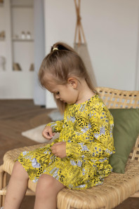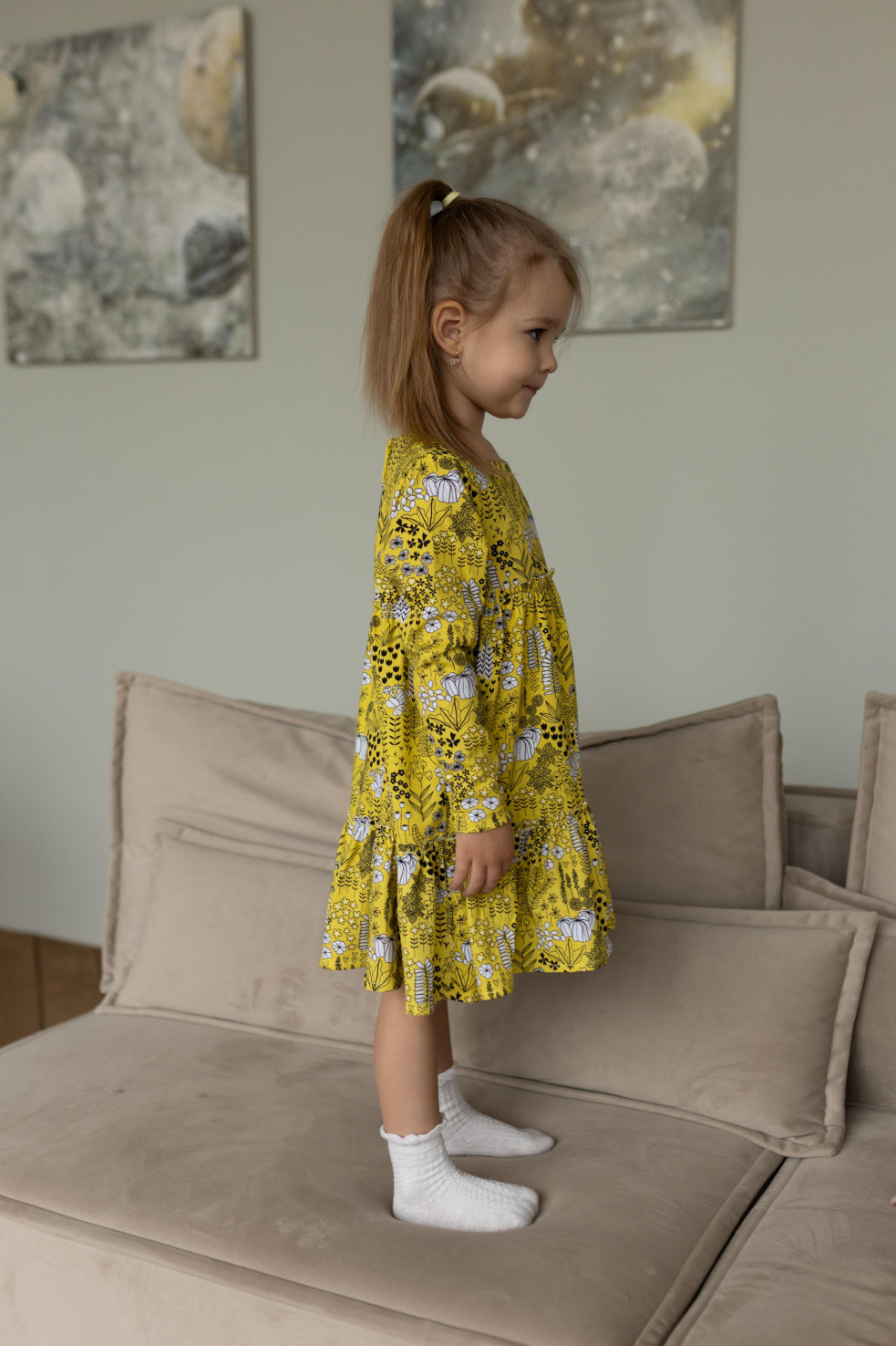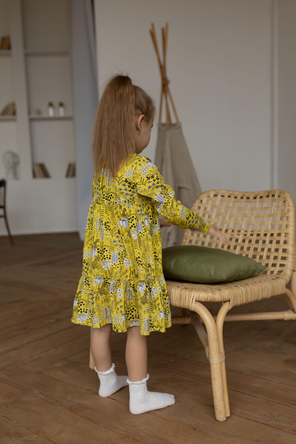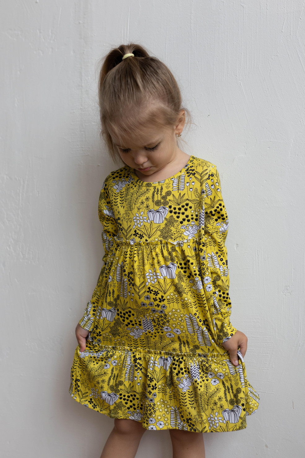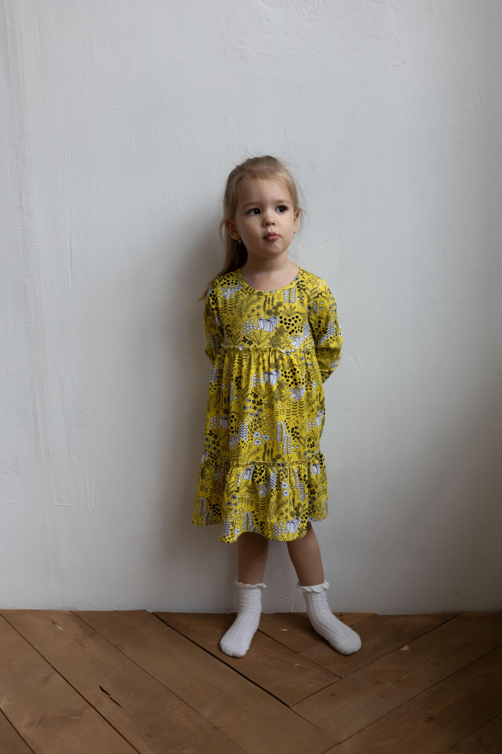 Кулирное полотно:100%х/б. Платье-силуэт трапеция,длинный втачной рукав.Завышена линия талии,отрезная юбка переда и спинки из двух воланов.Горловина окантована.Застежка по спинке на пуговицы.