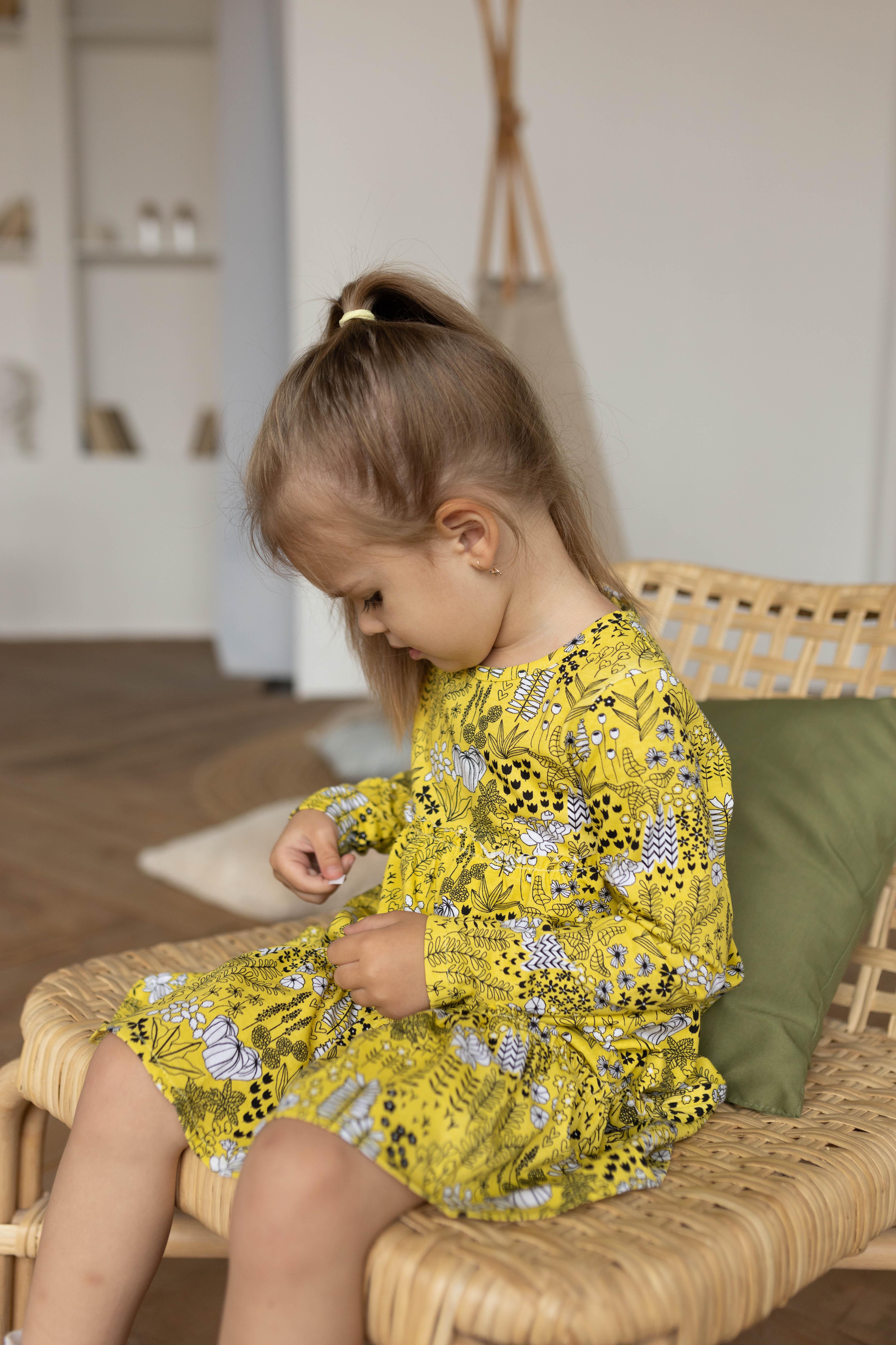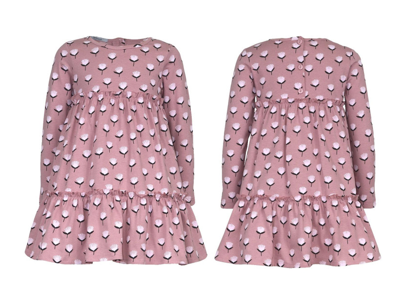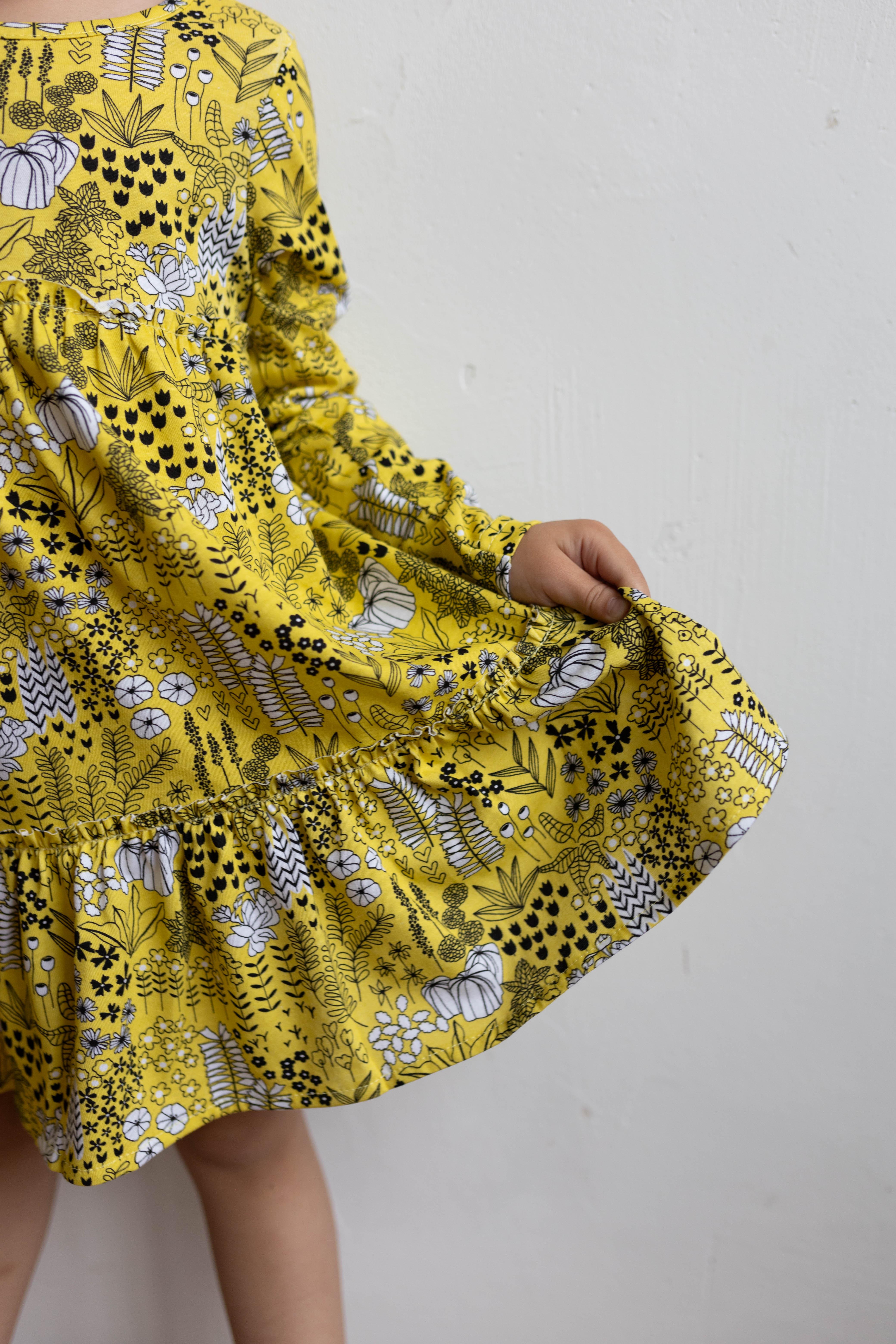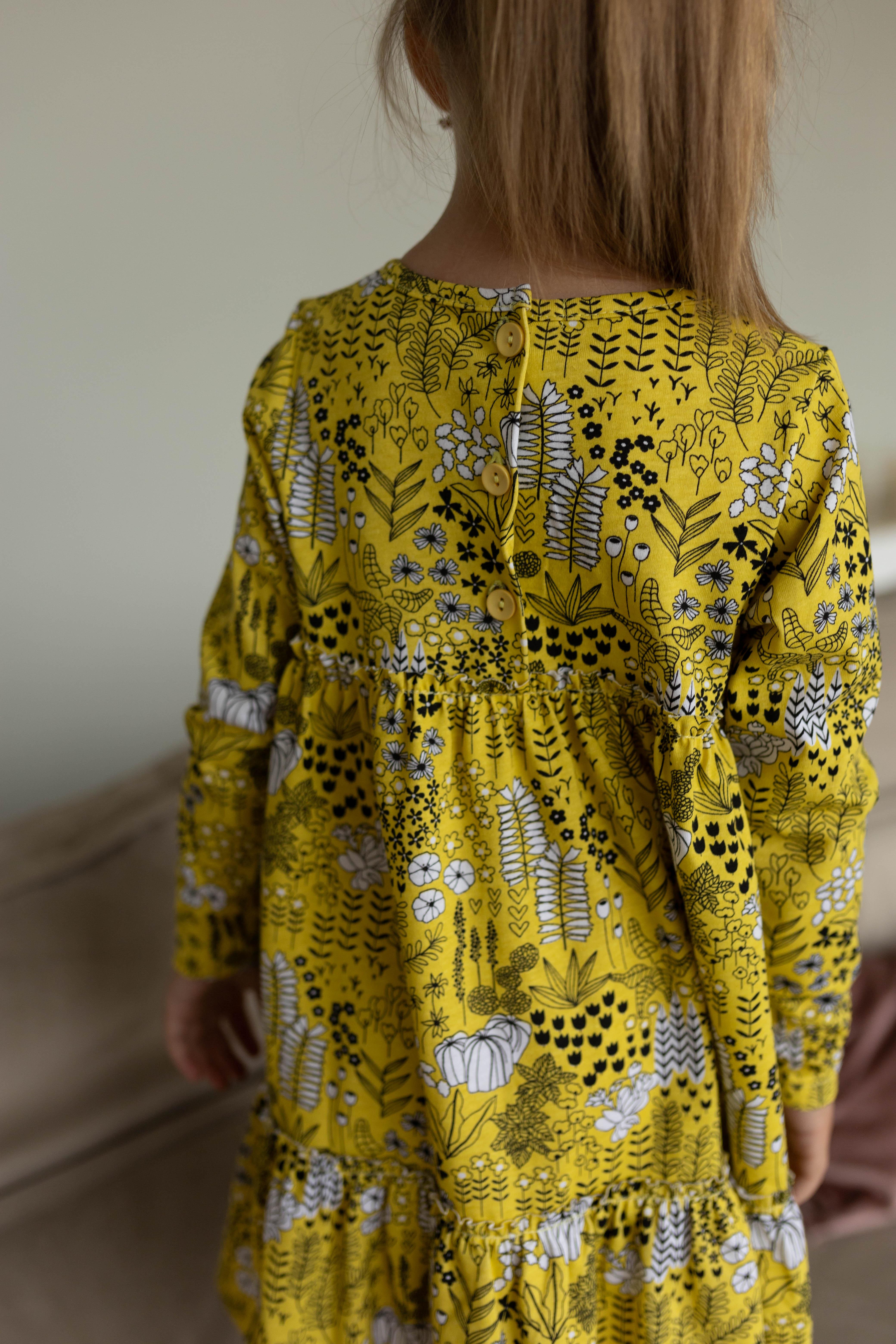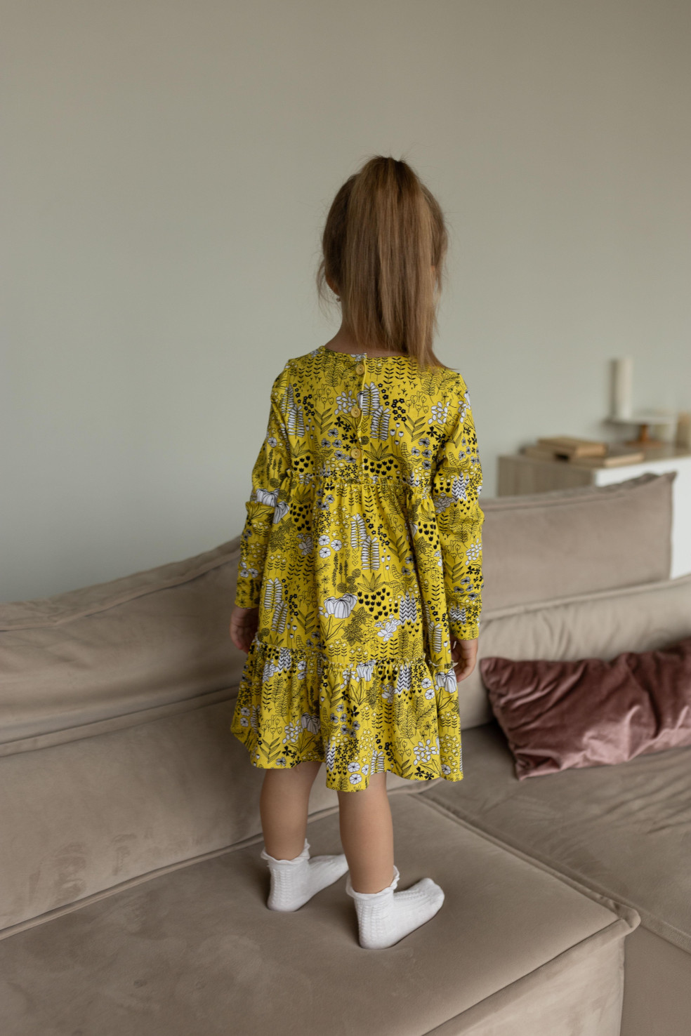 Кулирное полотно:100%х/б. Платье-силуэт трапеция,длинный втачной рукав.Завышена линия талии,отрезная юбка переда и спинки из двух воланов.Горловина окантована.Застежка по спинке на пуговицы.