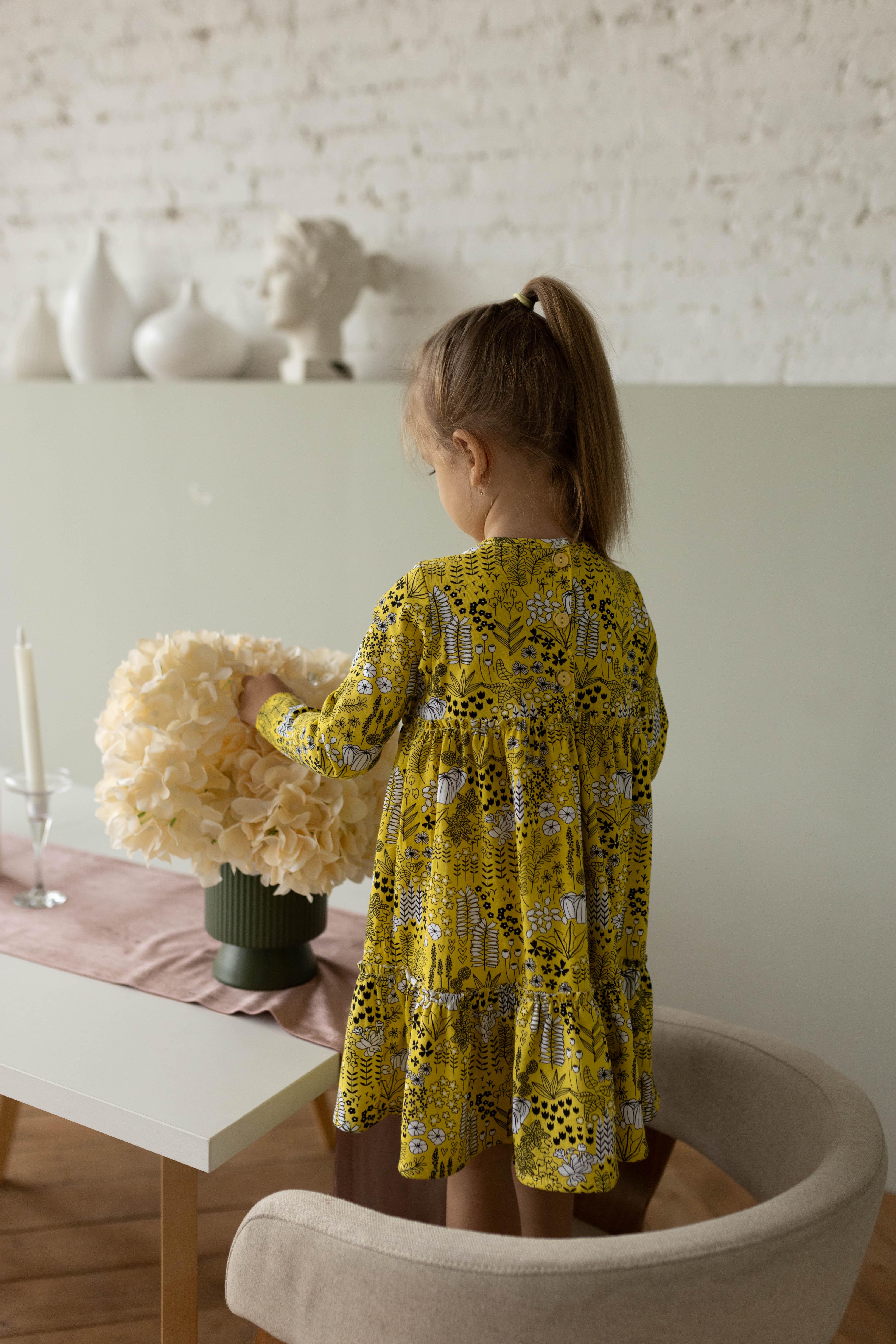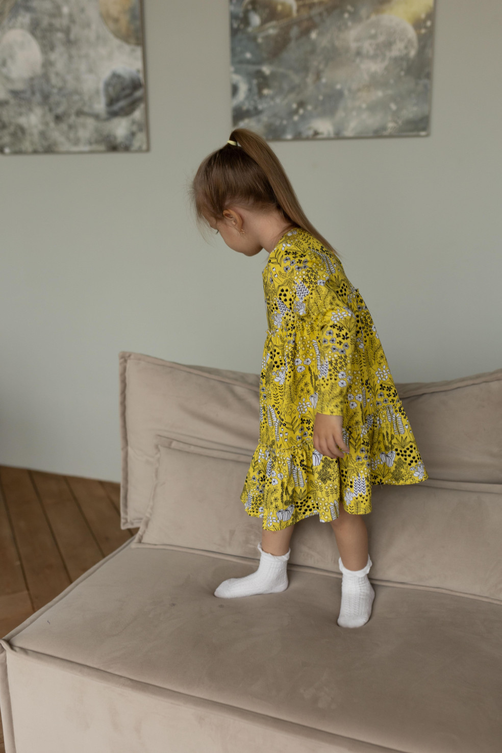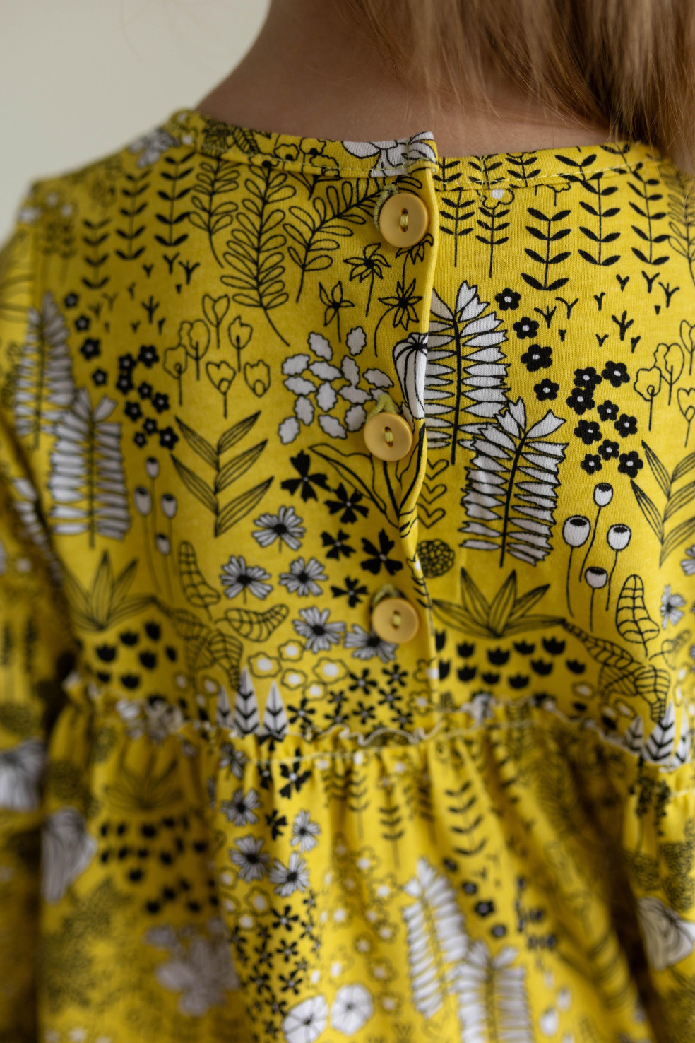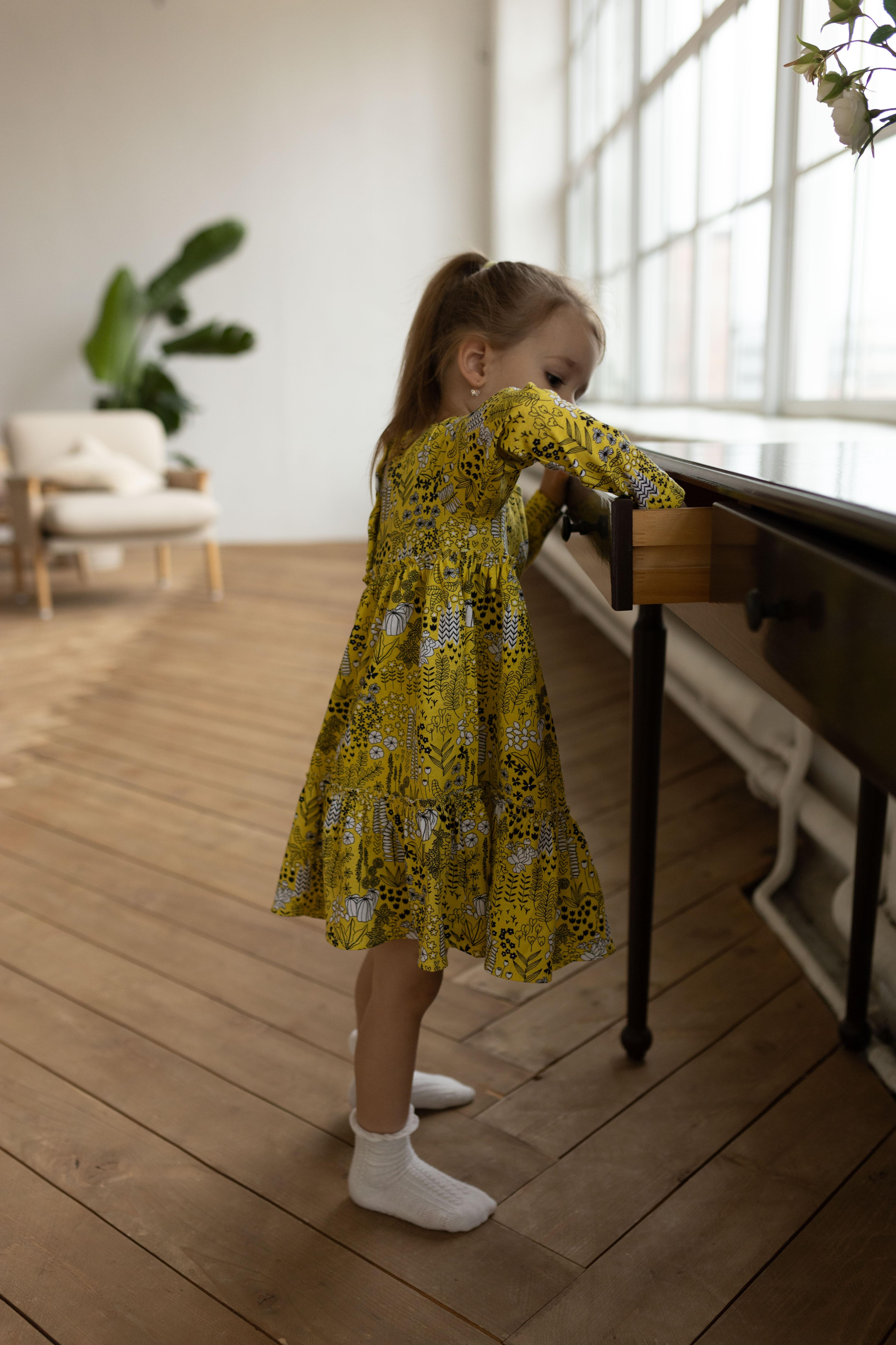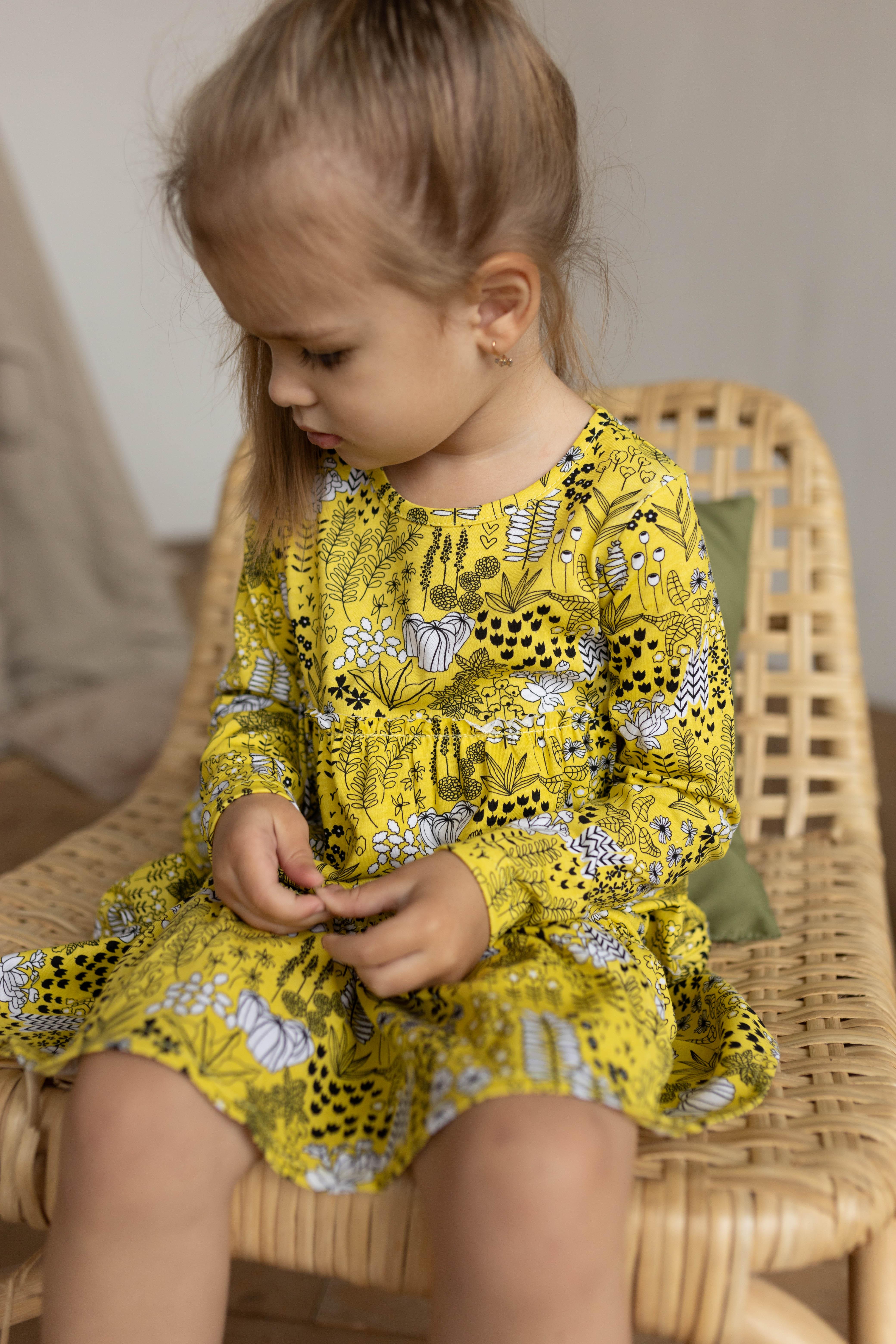 Кулирное полотно:100%х/б. Платье-силуэт трапеция,длинный втачной рукав.Завышена линия талии,отрезная юбка переда и спинки из двух воланов.Горловина окантована.Застежка по спинке на пуговицы.