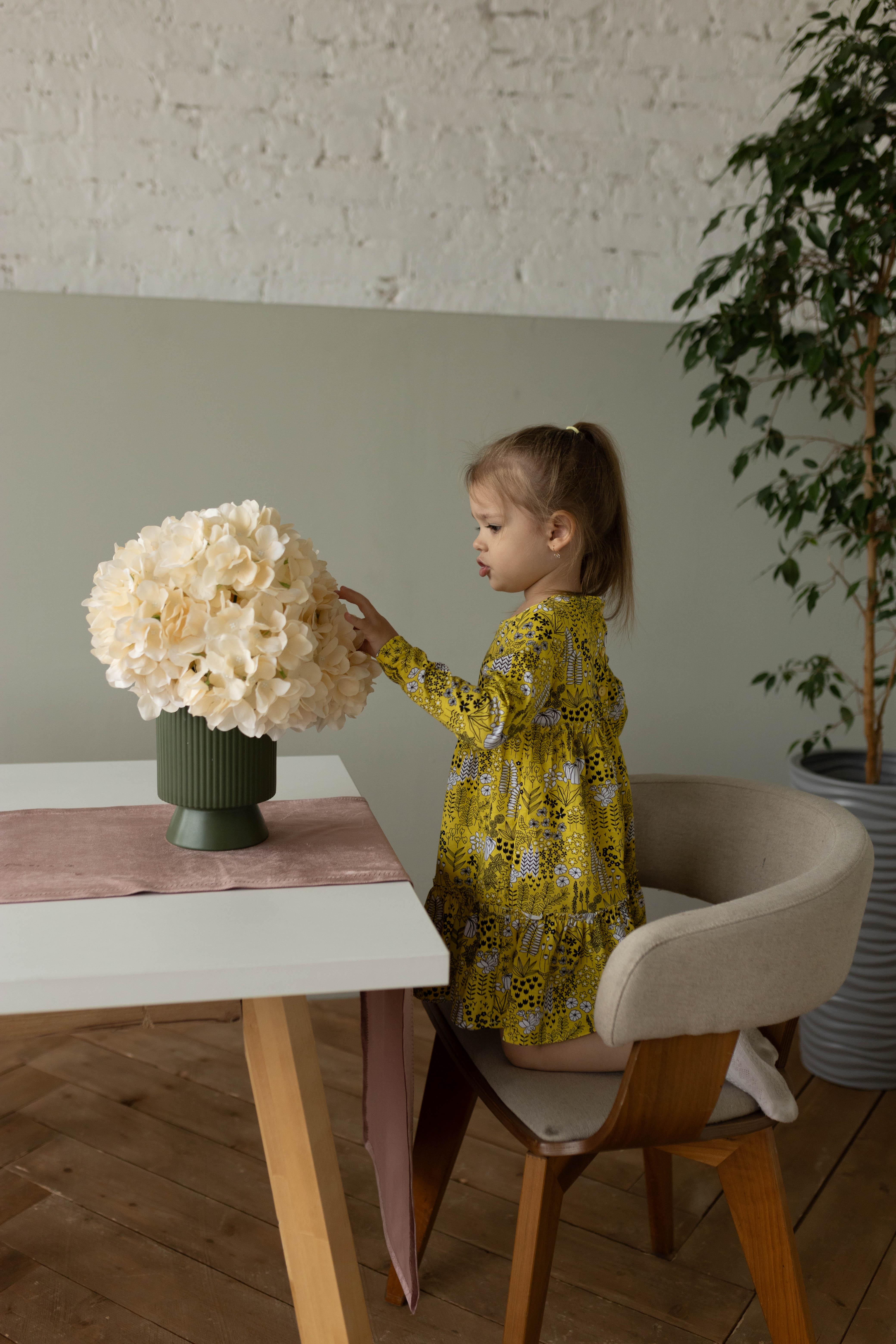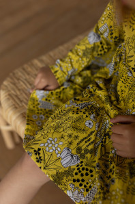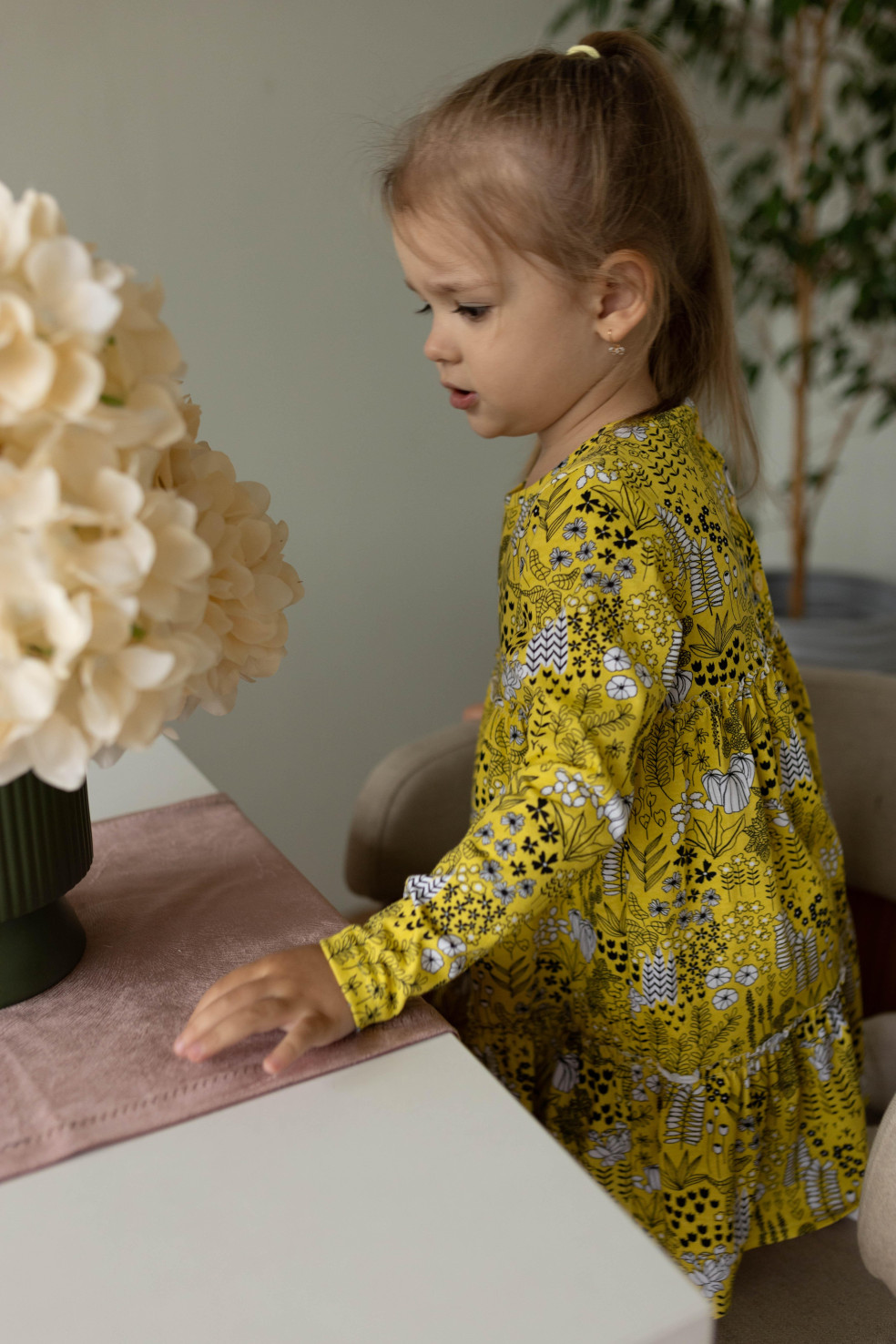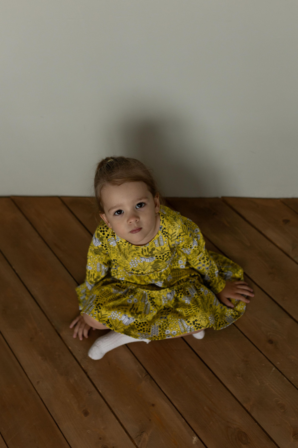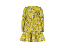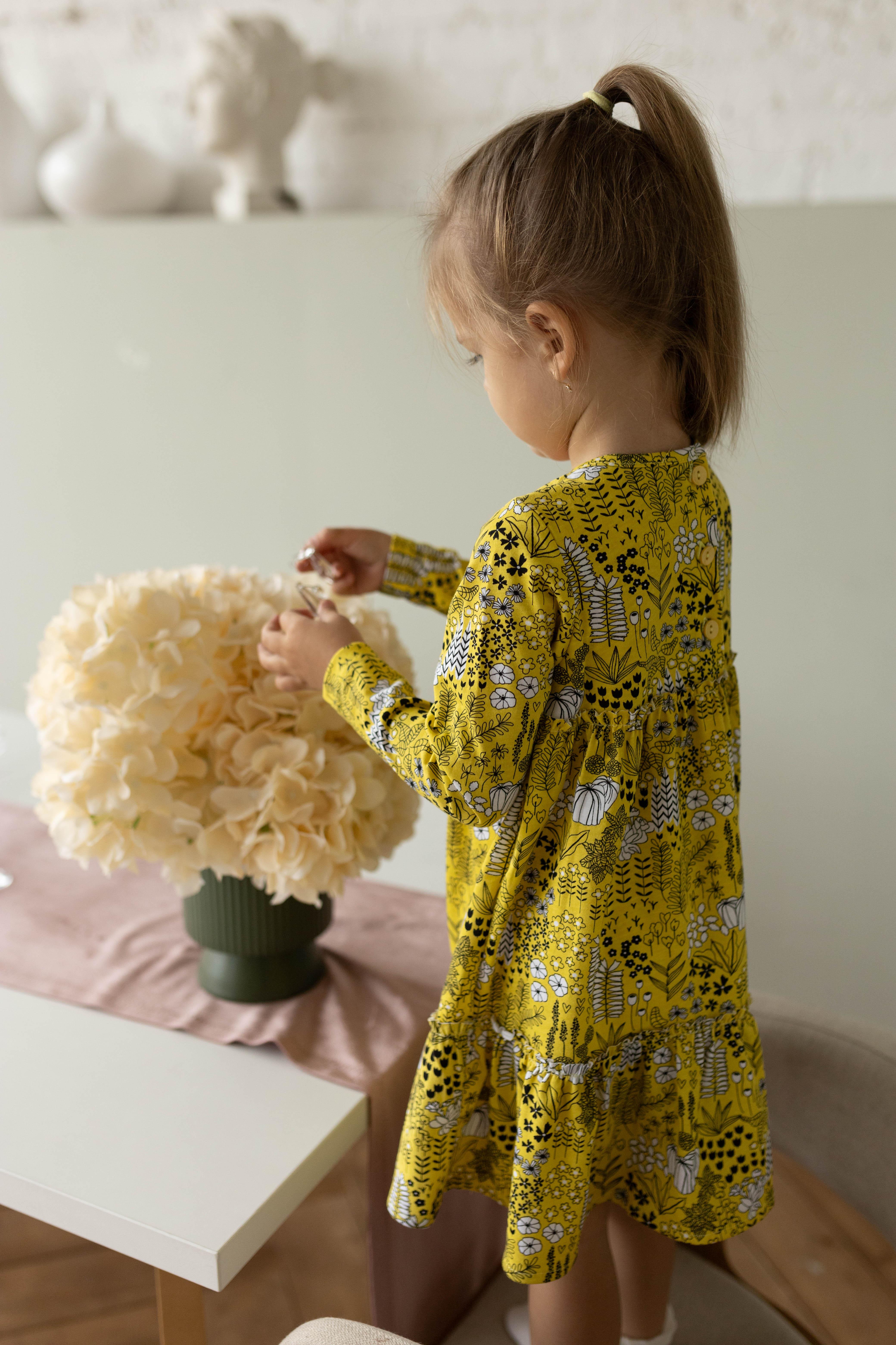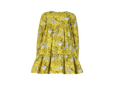 Кулирное полотно:100%х/б. Платье-силуэт трапеция,длинный втачной рукав.Завышена линия талии,отрезная юбка переда и спинки из двух воланов.Горловина окантована.Застежка по спинке на пуговицы.