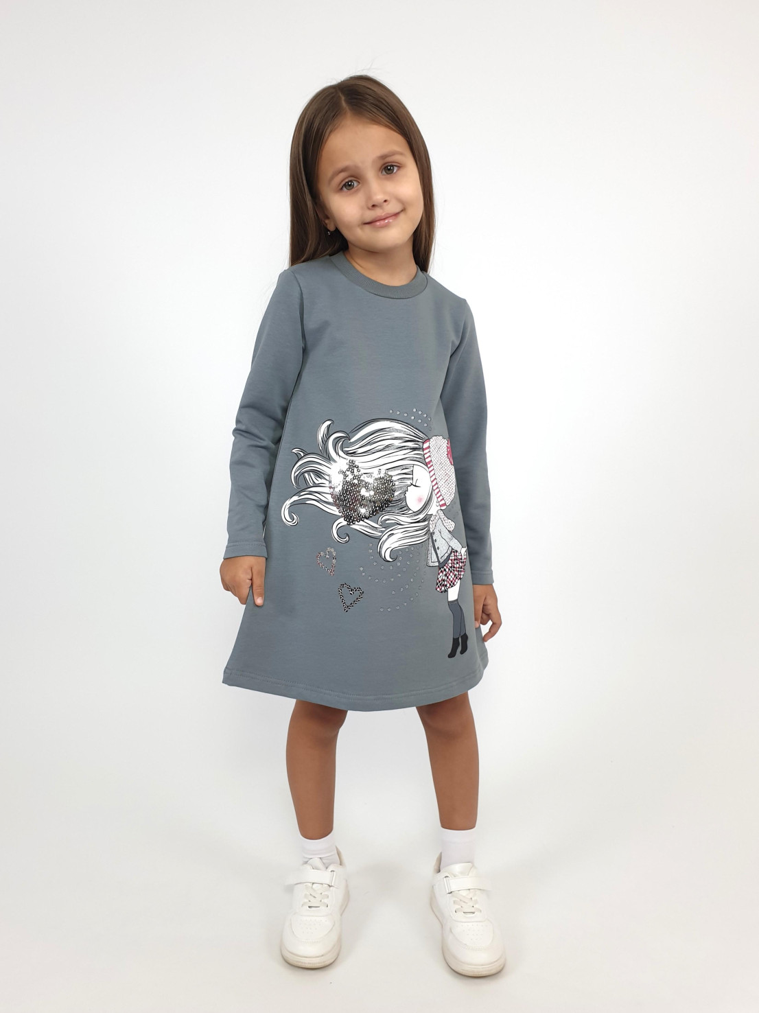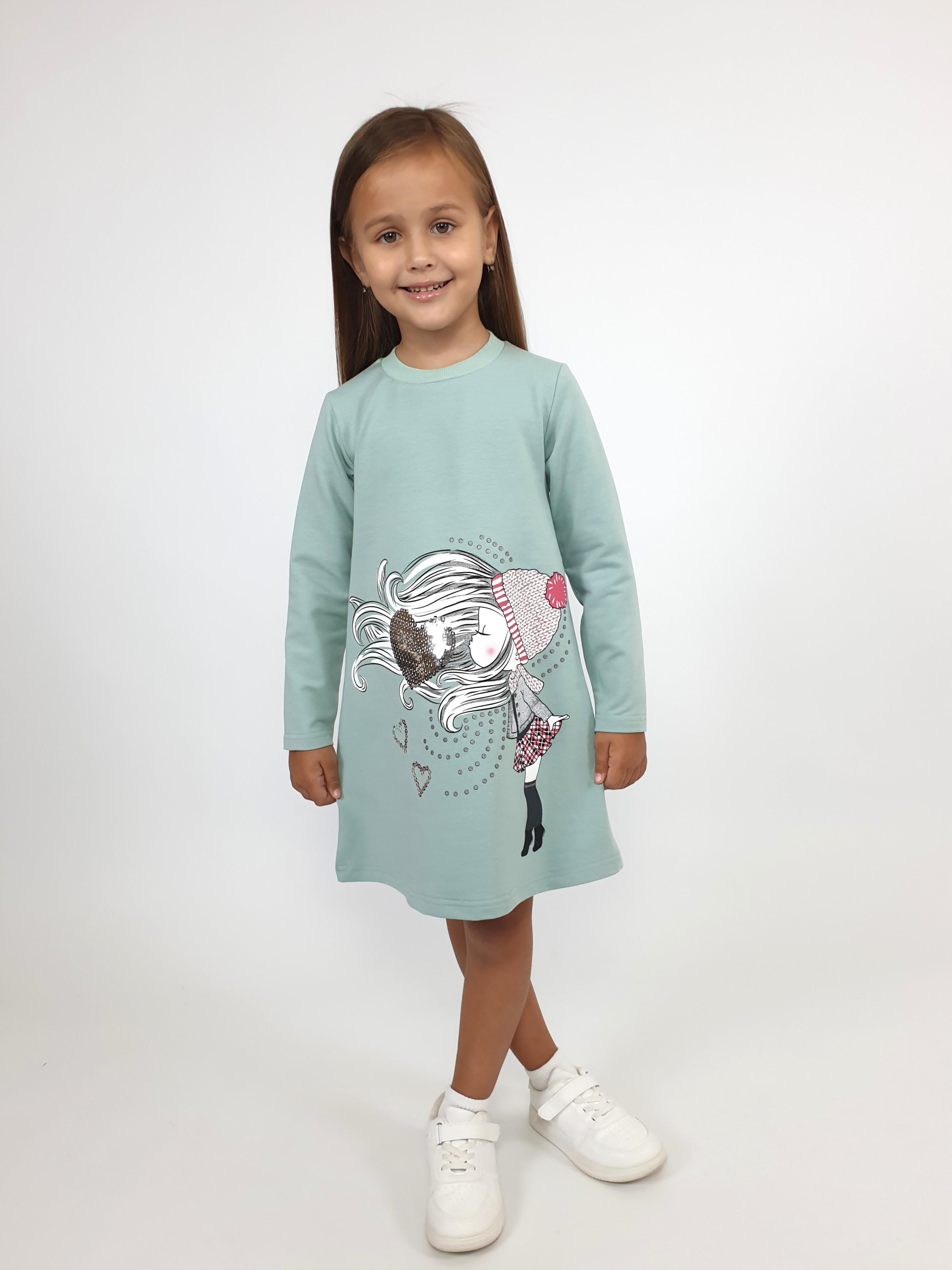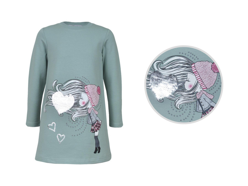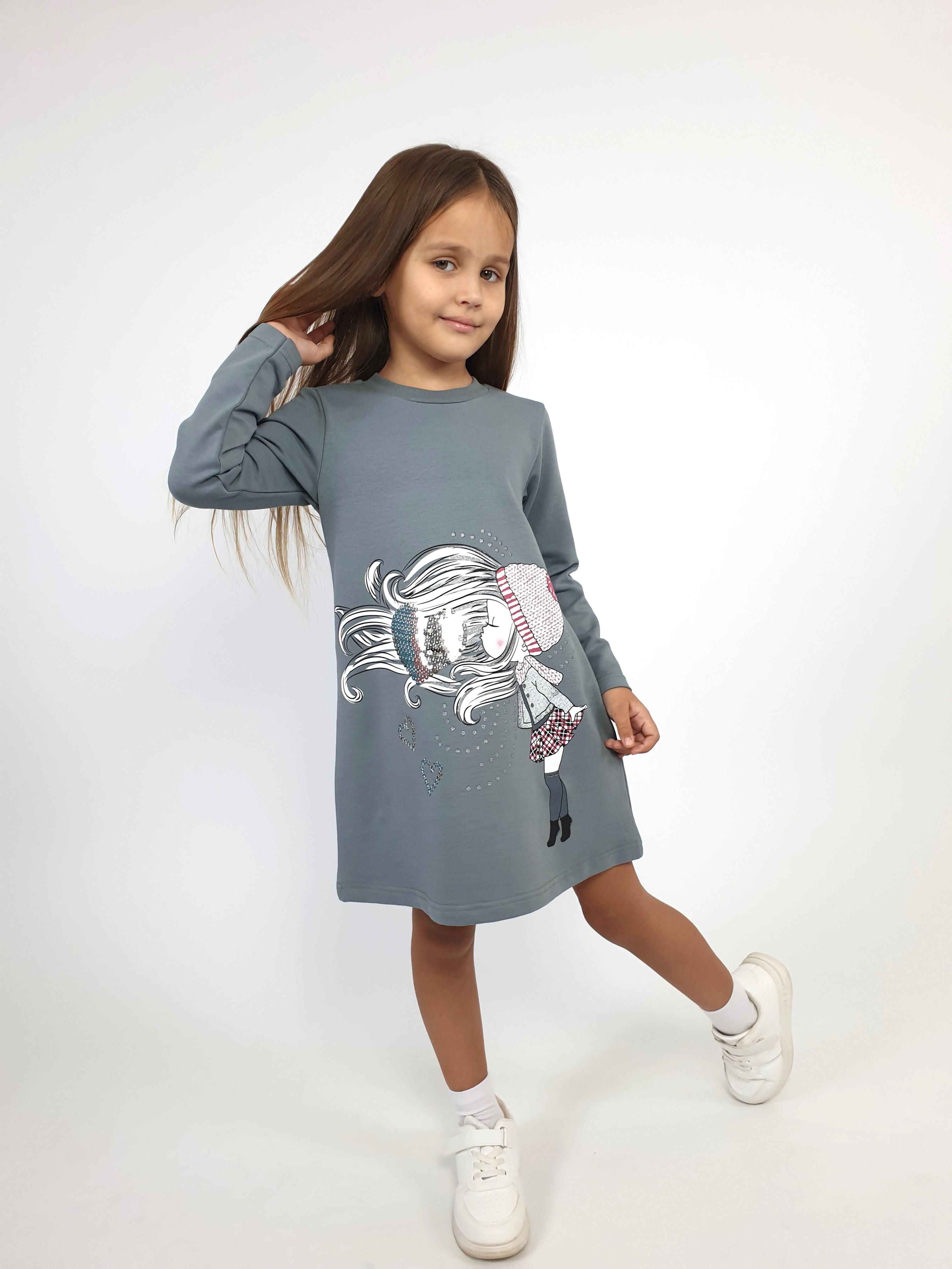 Футер двухнитка:95% х/б,5% лайкра. Платье-силуэт трапеция,рукав втачной,длинный. Печать по переду и вышивка пайетки,горловина обработана ластиком.