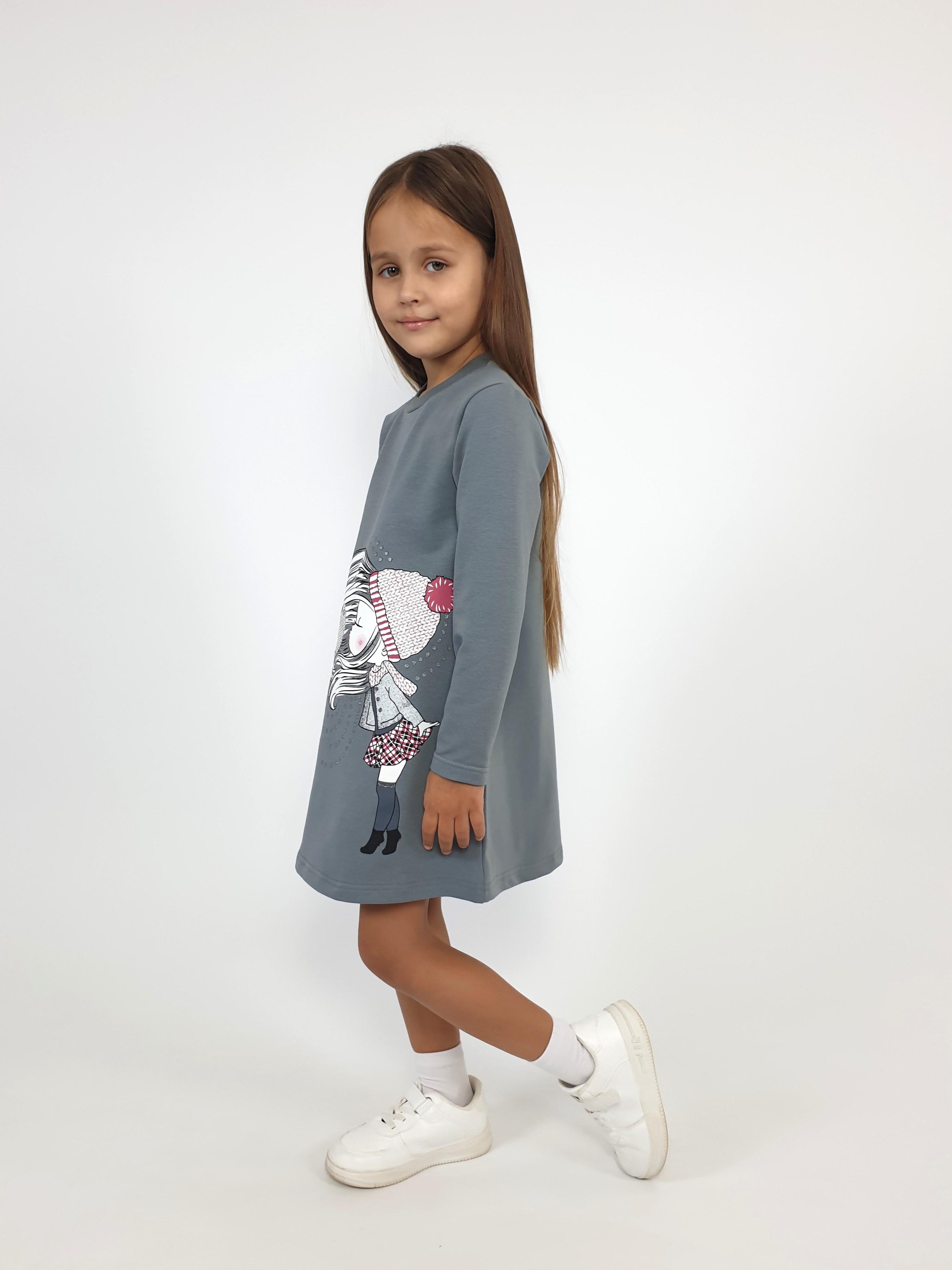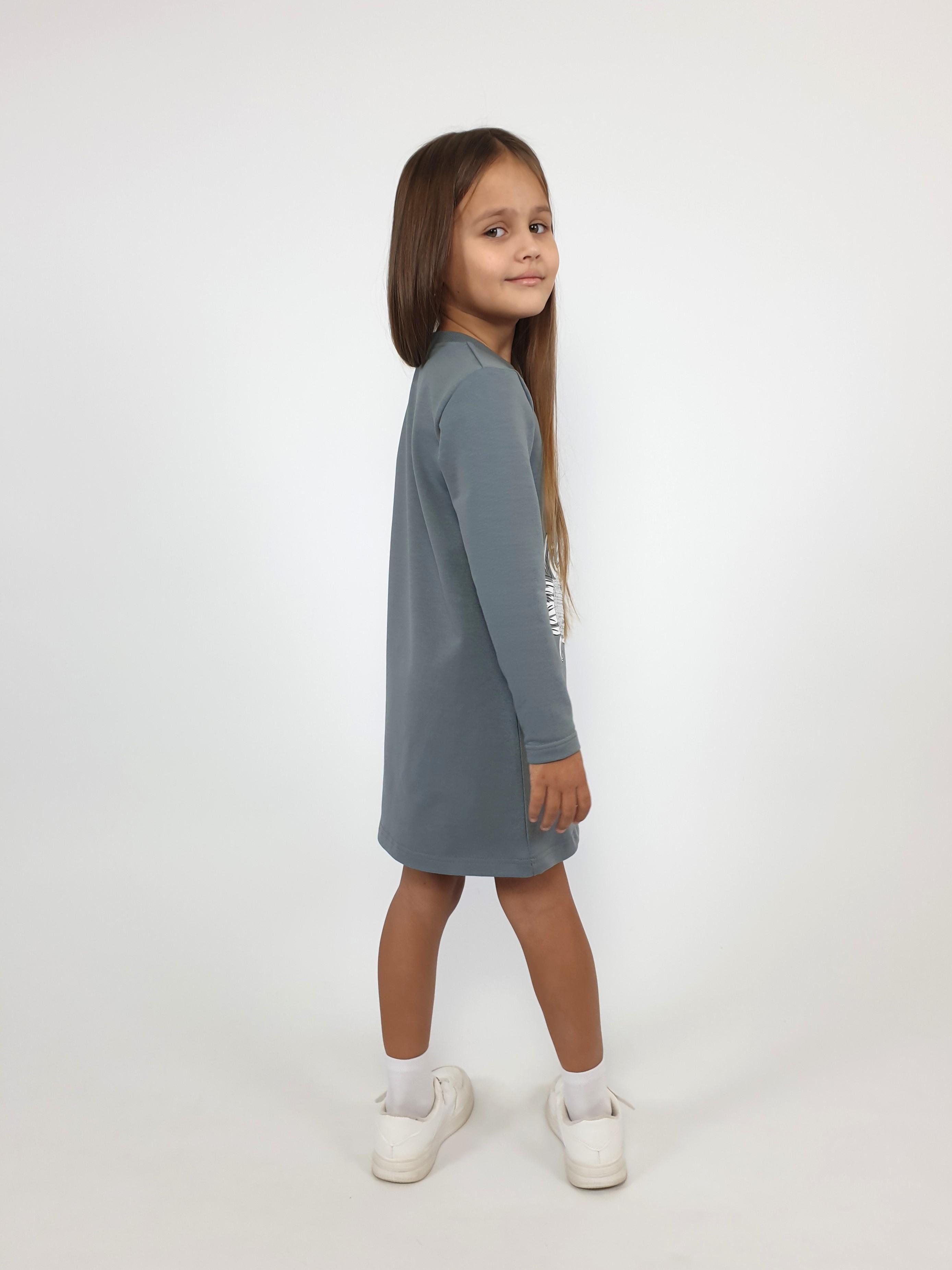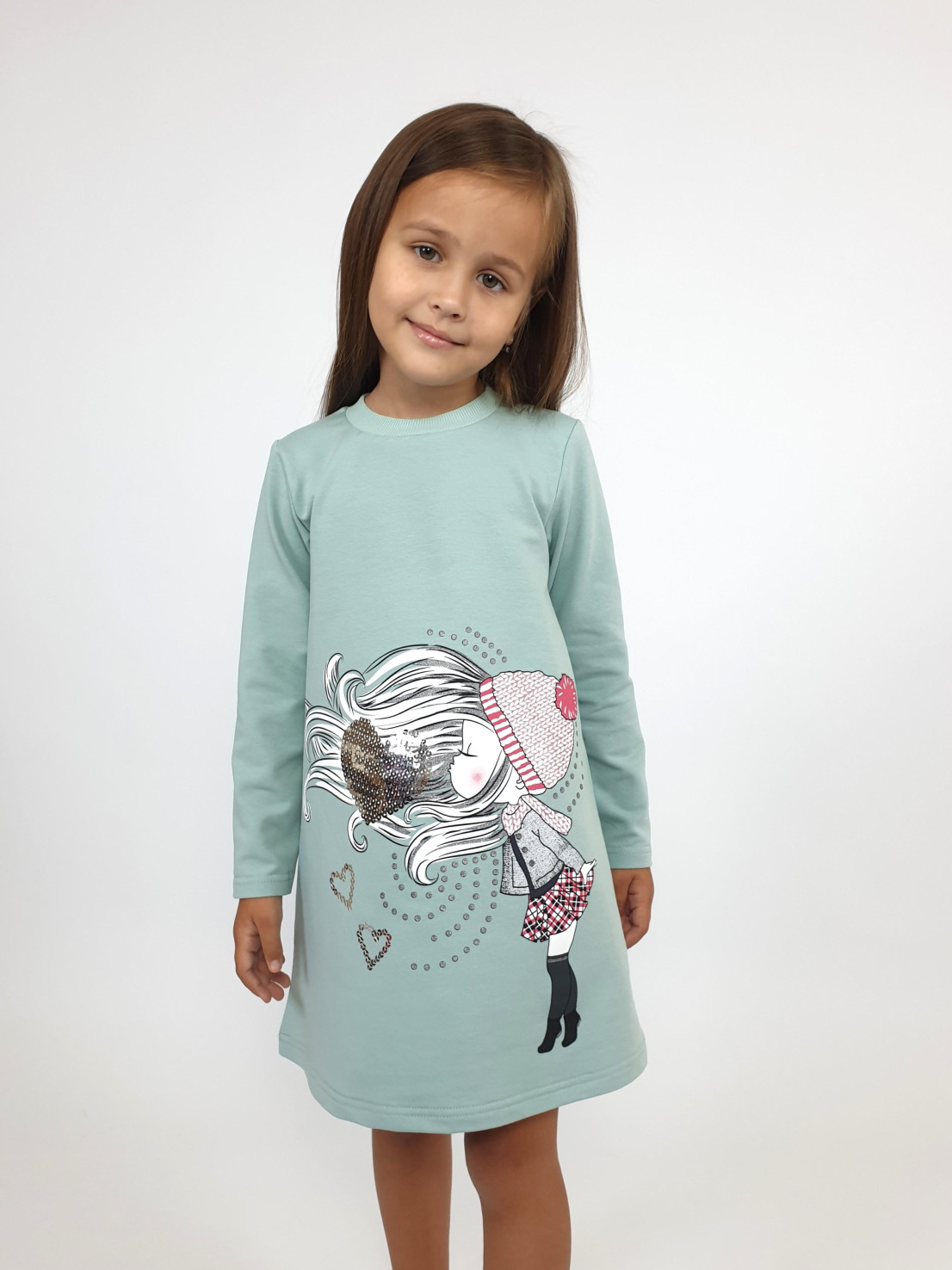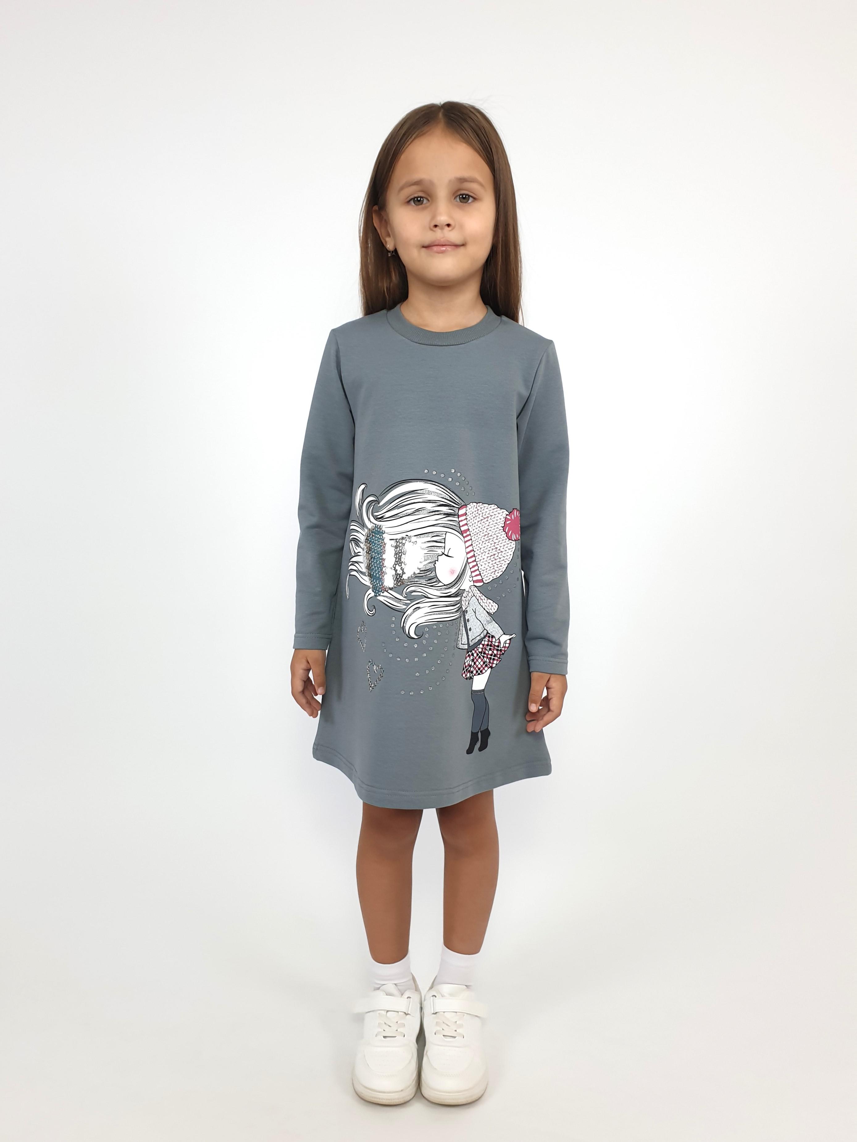 Футер двухнитка:95% х/б,5% лайкра. Платье-силуэт трапеция,рукав втачной,длинный. Печать по переду и вышивка пайетки,горловина обработана ластиком.