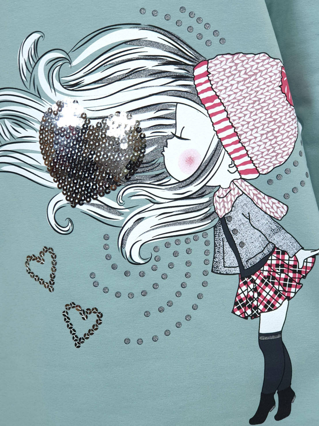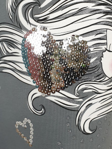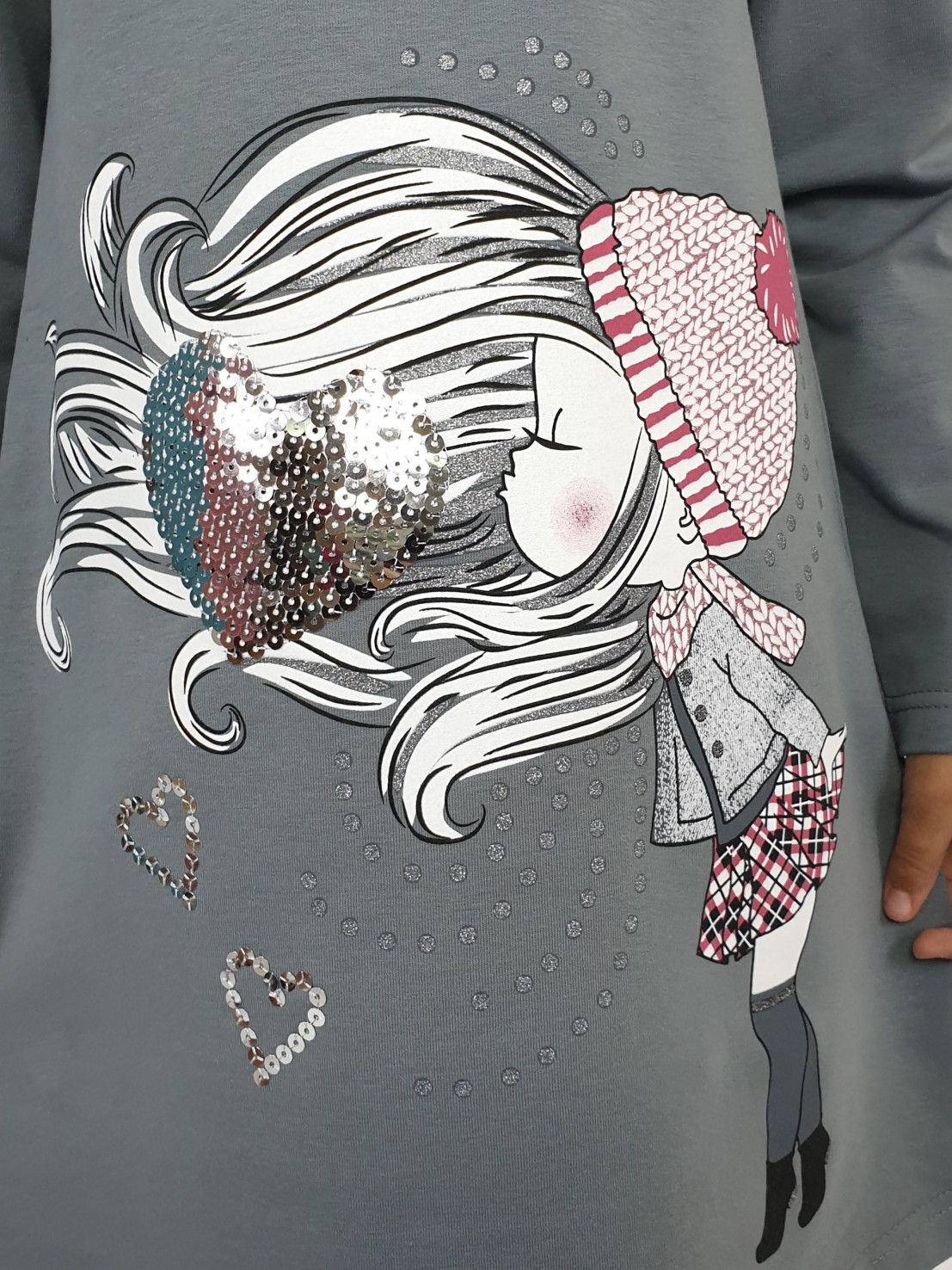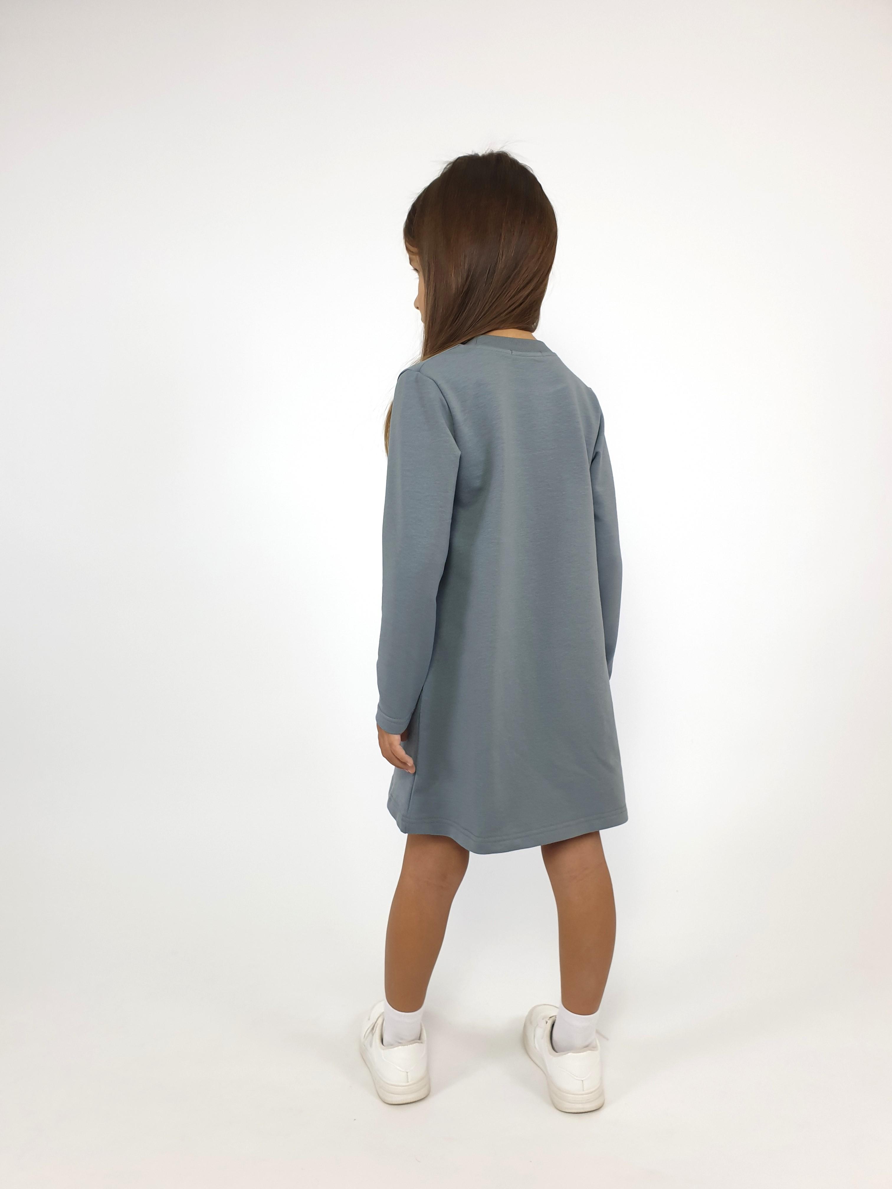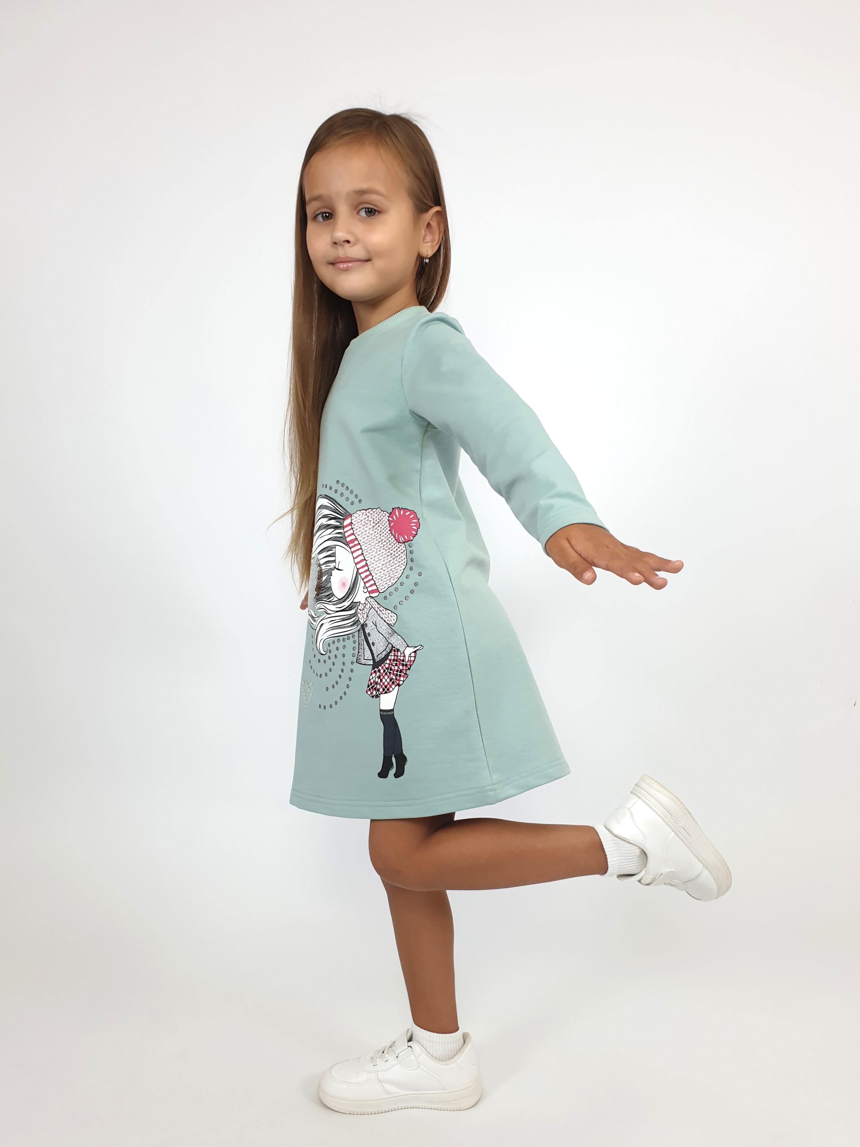 Футер двухнитка:95% х/б,5% лайкра. Платье-силуэт трапеция,рукав втачной,длинный. Печать по переду и вышивка пайетки,горловина обработана ластиком.