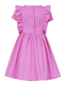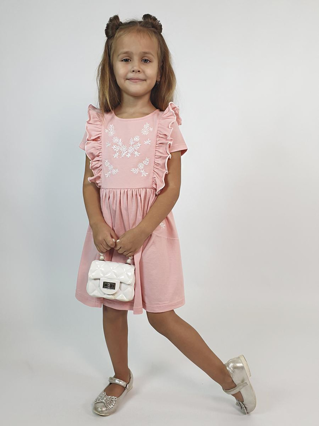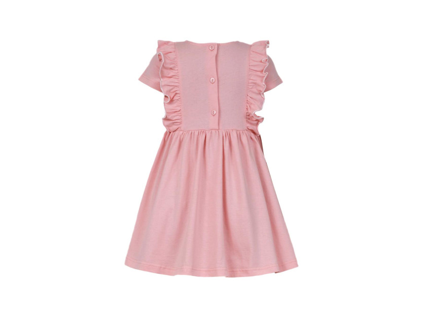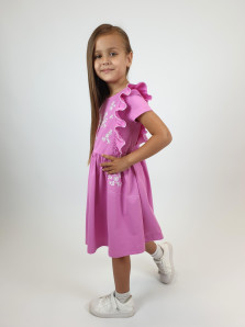 Кулирное полотно:100% х/б. Платье-полуприлегающего силуэта,короткий рукав.Отрезная юбка со сборкой рельефами.Лиф с рельефами и рюшей.Вышивка на боковых клиньях юбки и центральной вставке переда.Горловина окантована и подшита,застежка сзади на пуговицы.