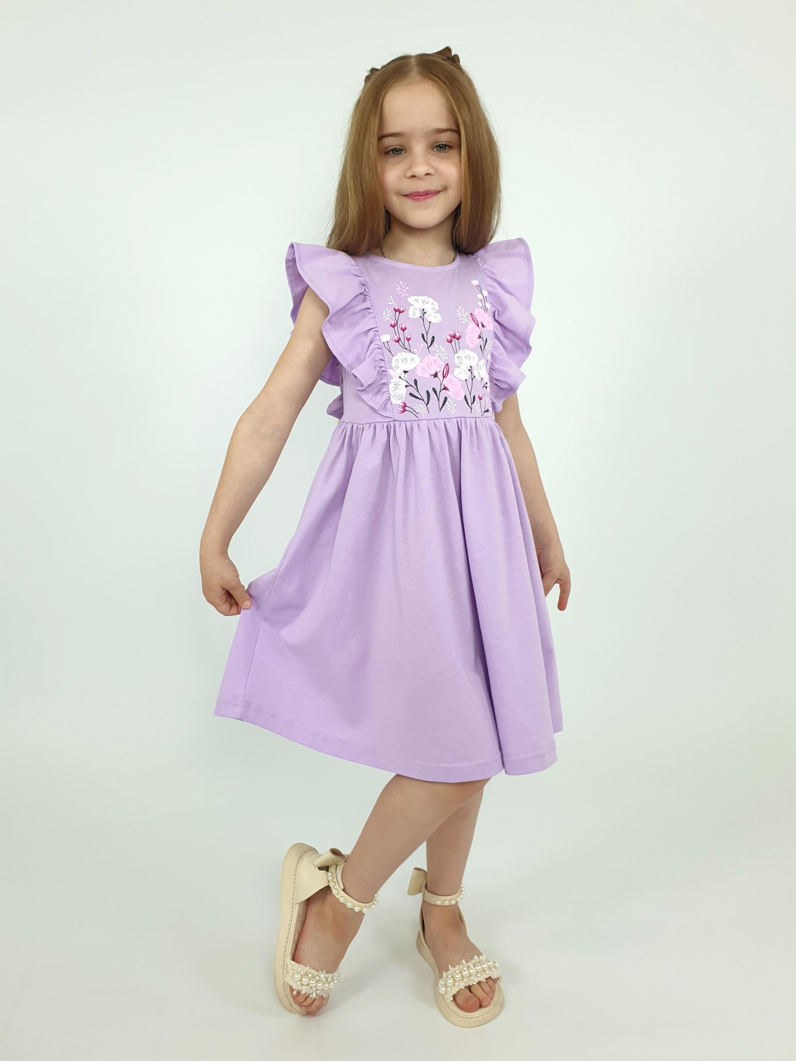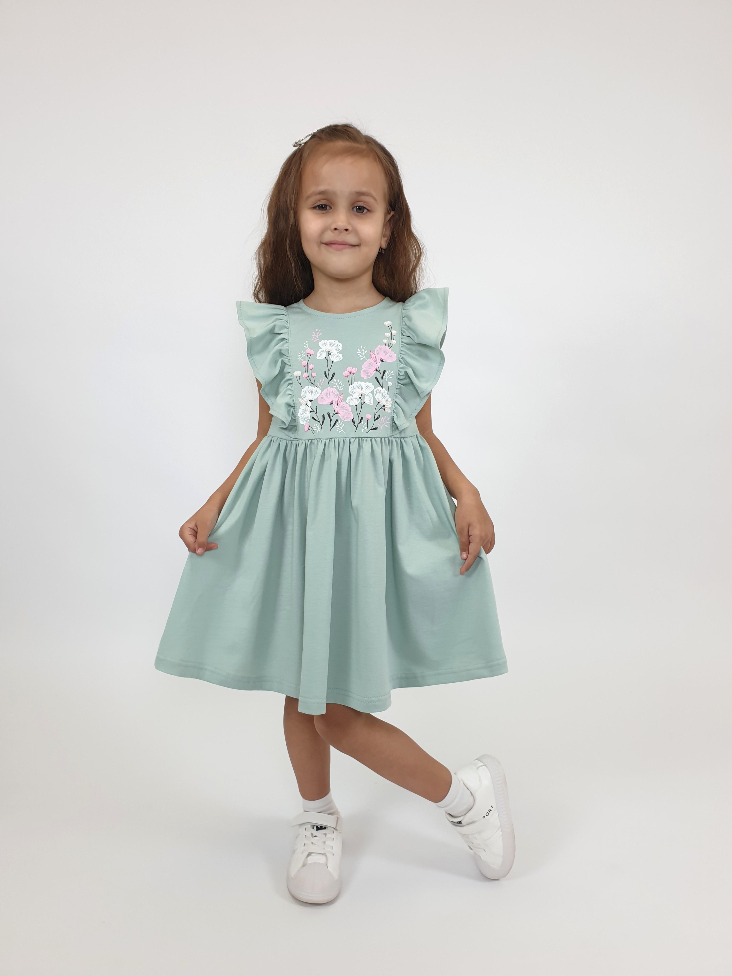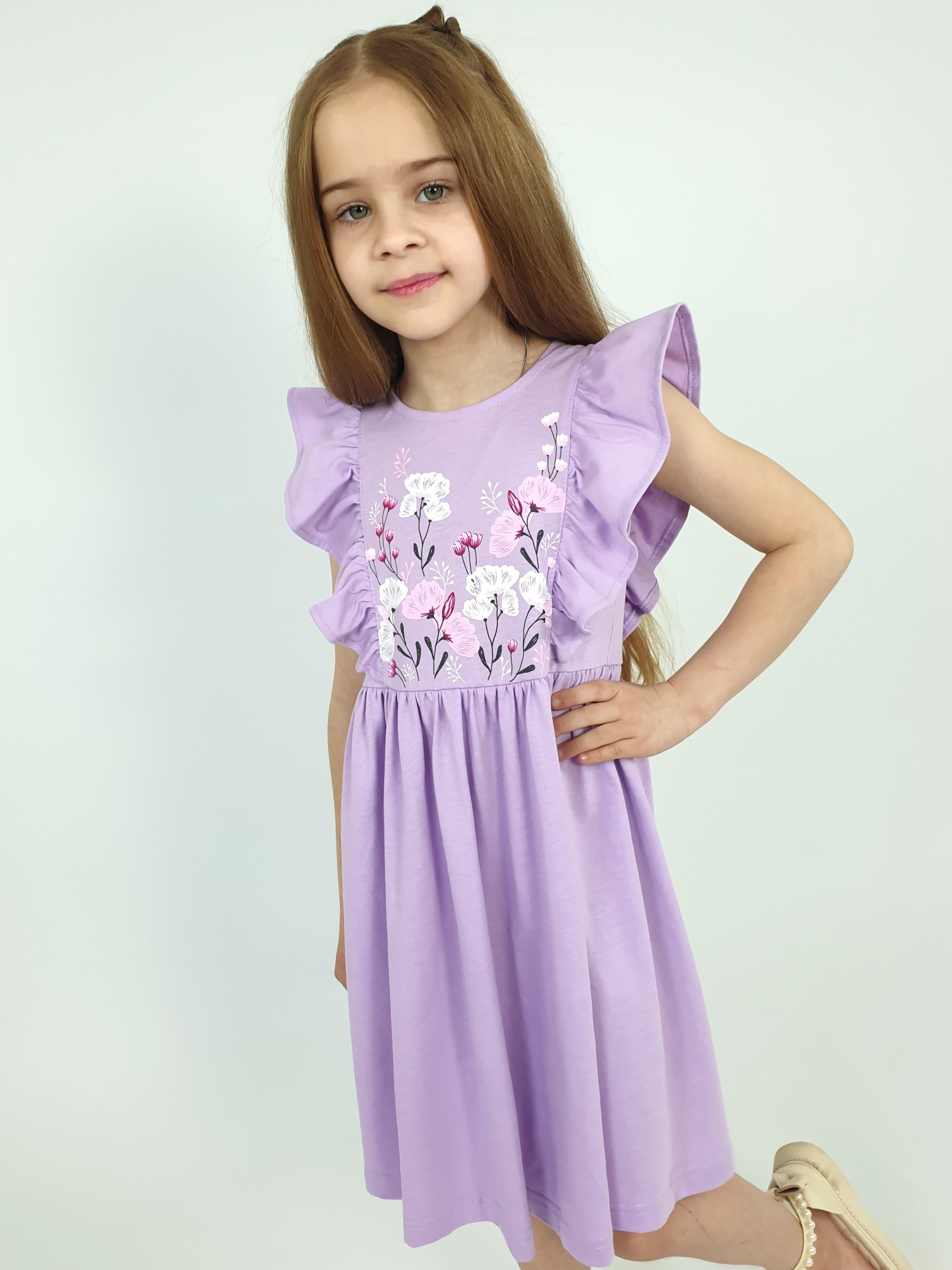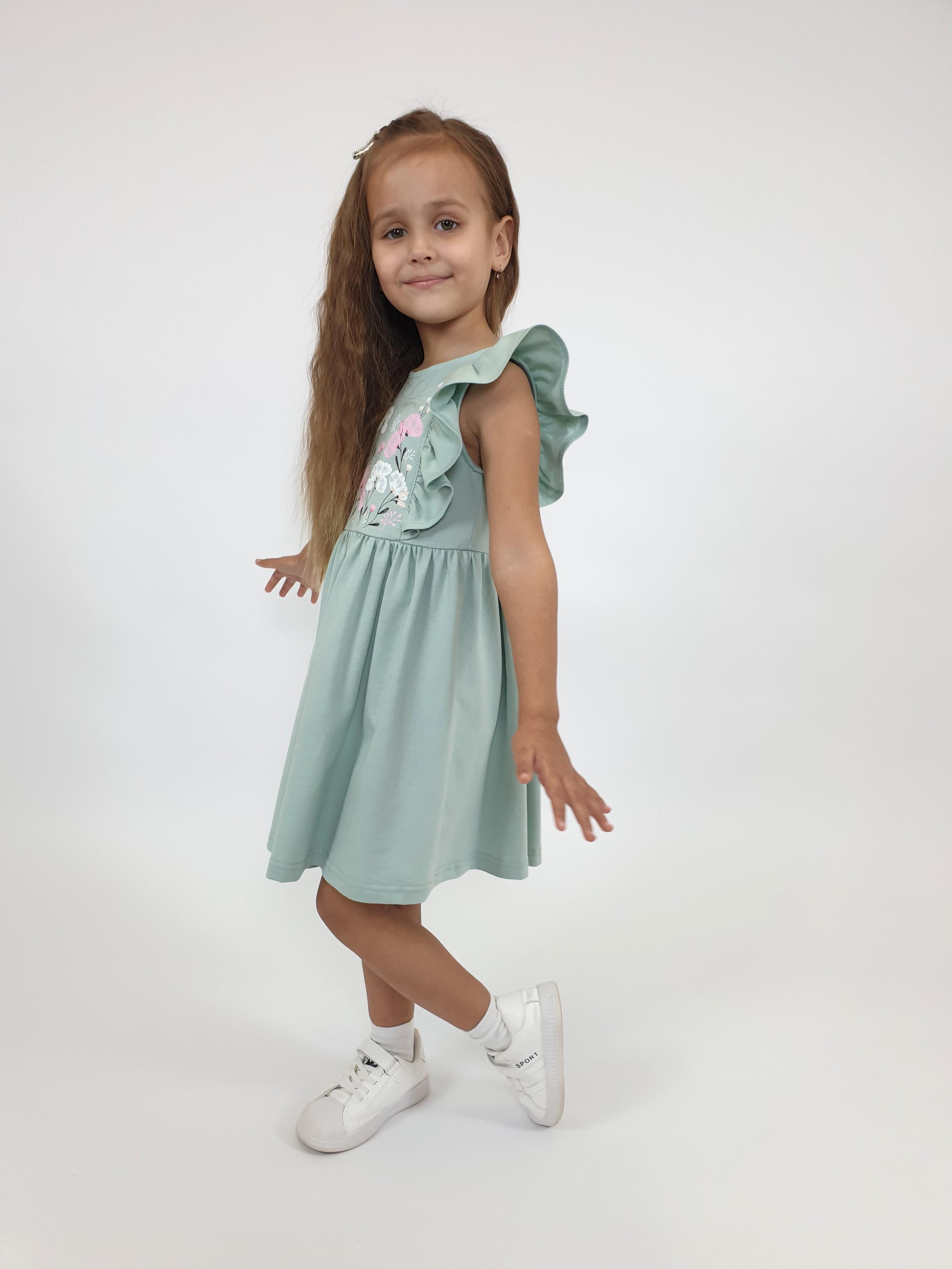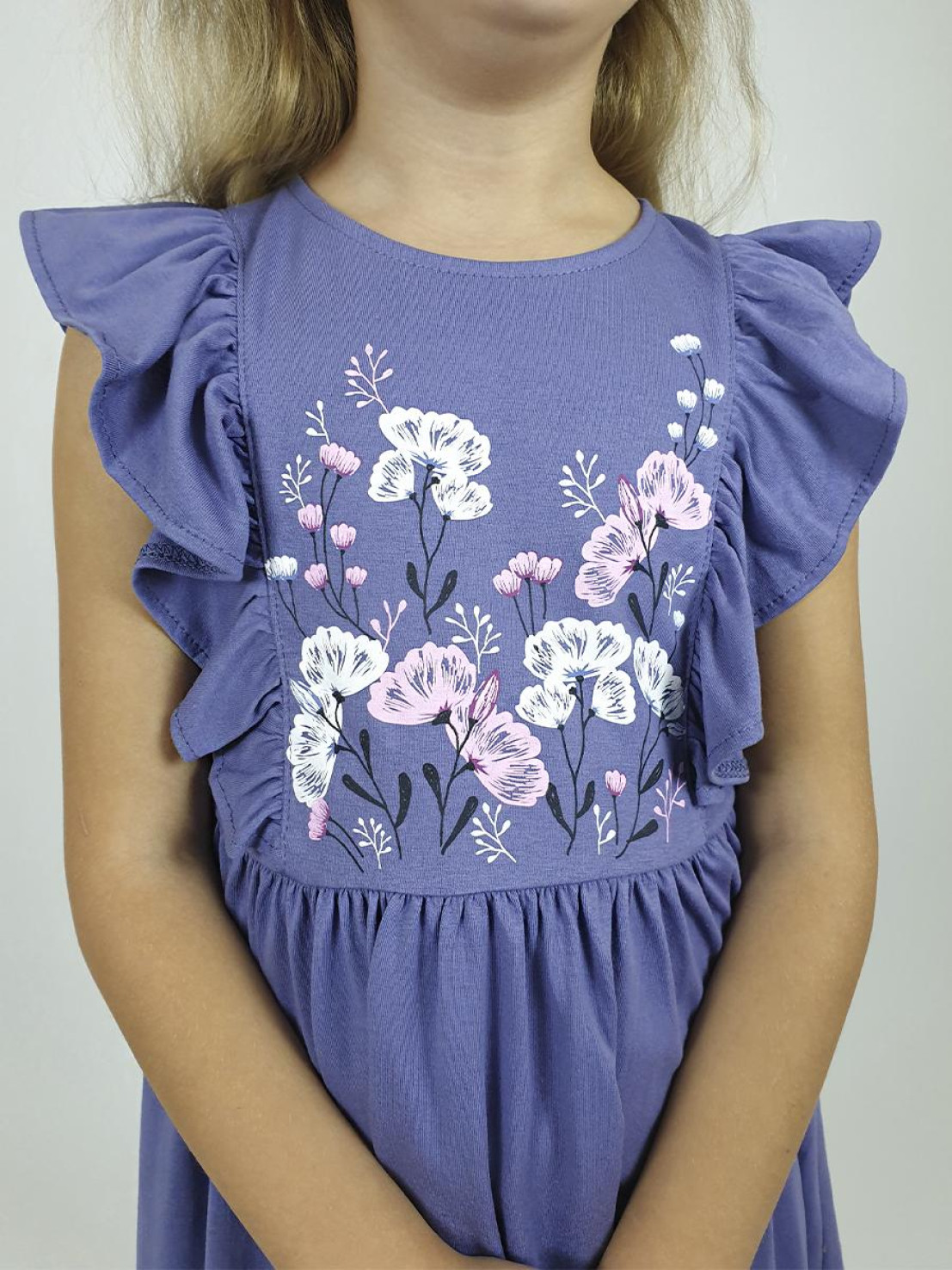 Летнее платье для девочки выполнено из качественного кулирного полотна (100% хлопок). Модель полуприлегающего силуэта ,декорирована цветочным принтом с рюшами .Удобная застёжка по спинке на пуговицы .Такое платье идеально подойдёт как на каждый день, так и при особых случаях. Материал легкий, приятный на ощупь, устойчивый к частым стиркам.