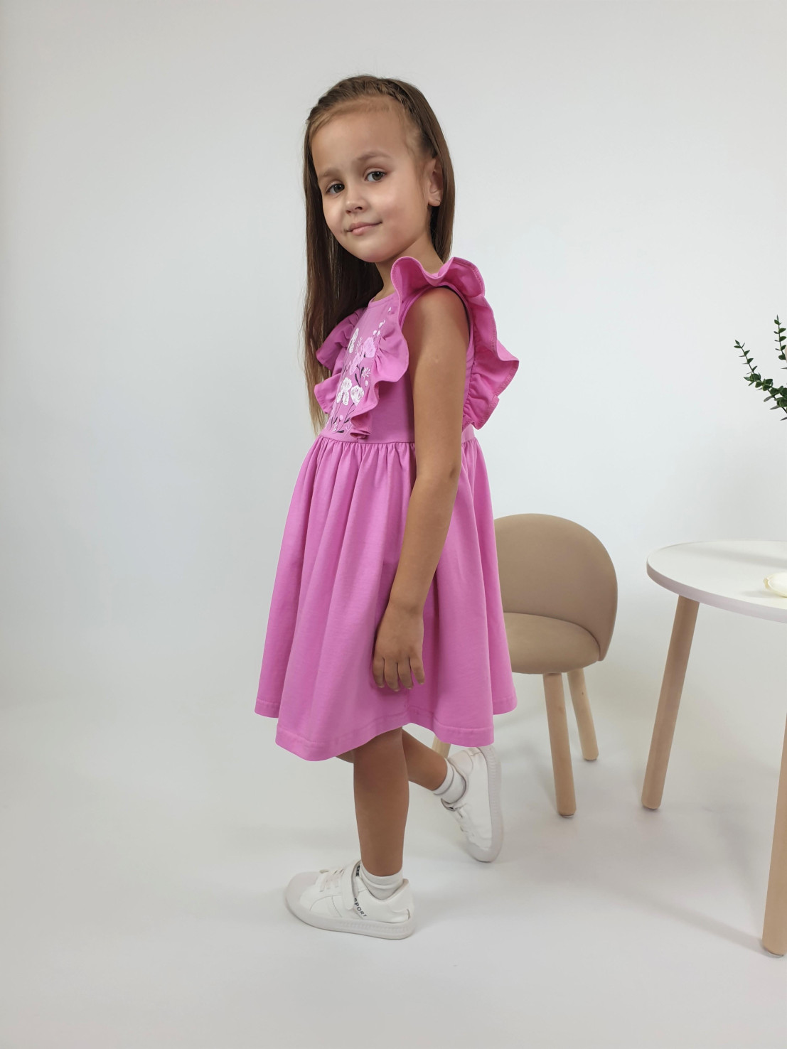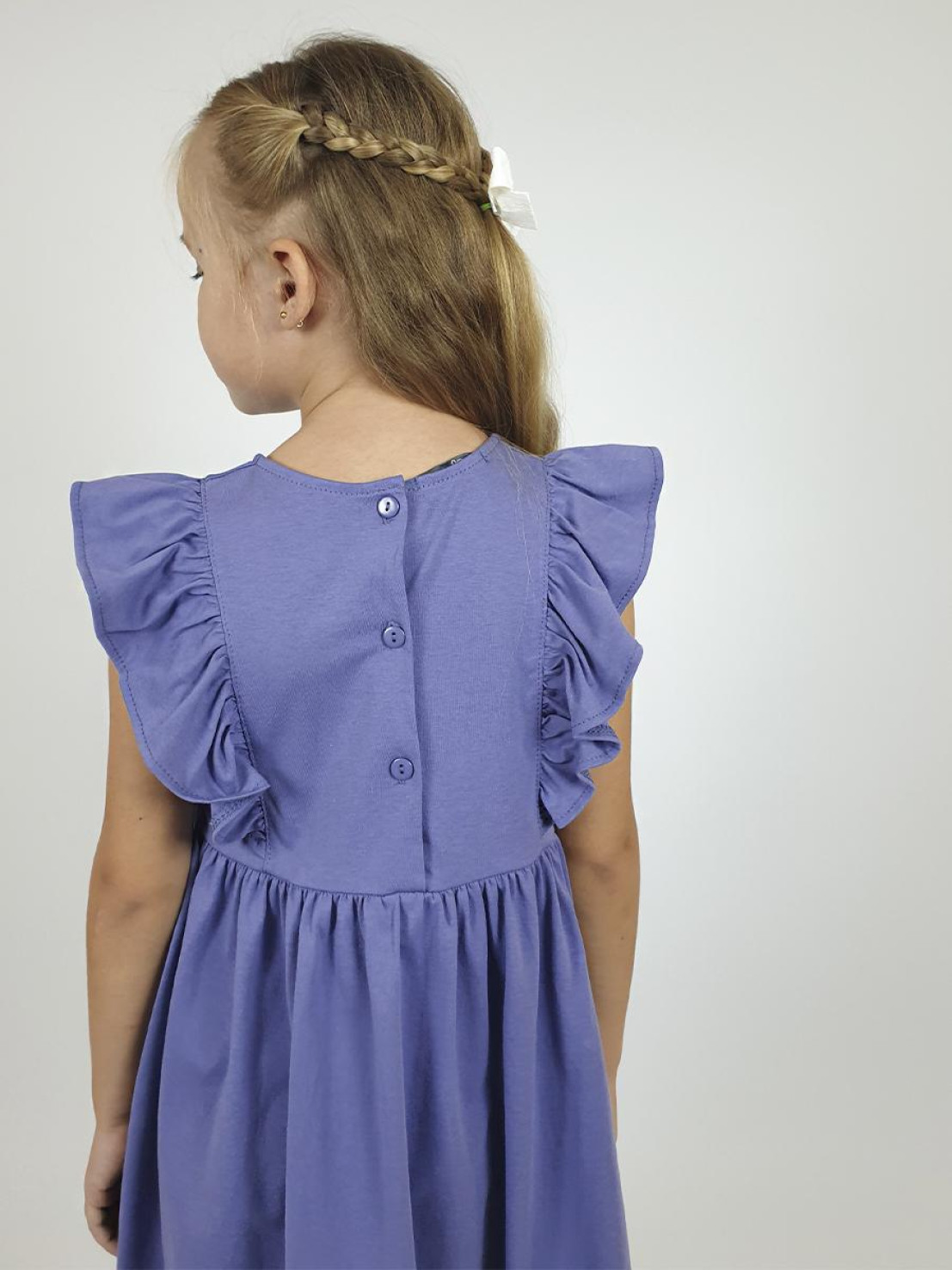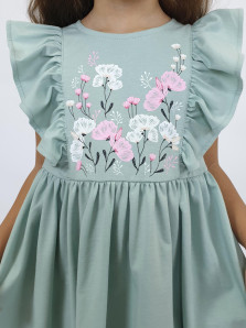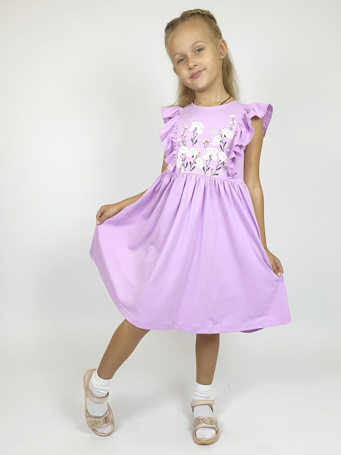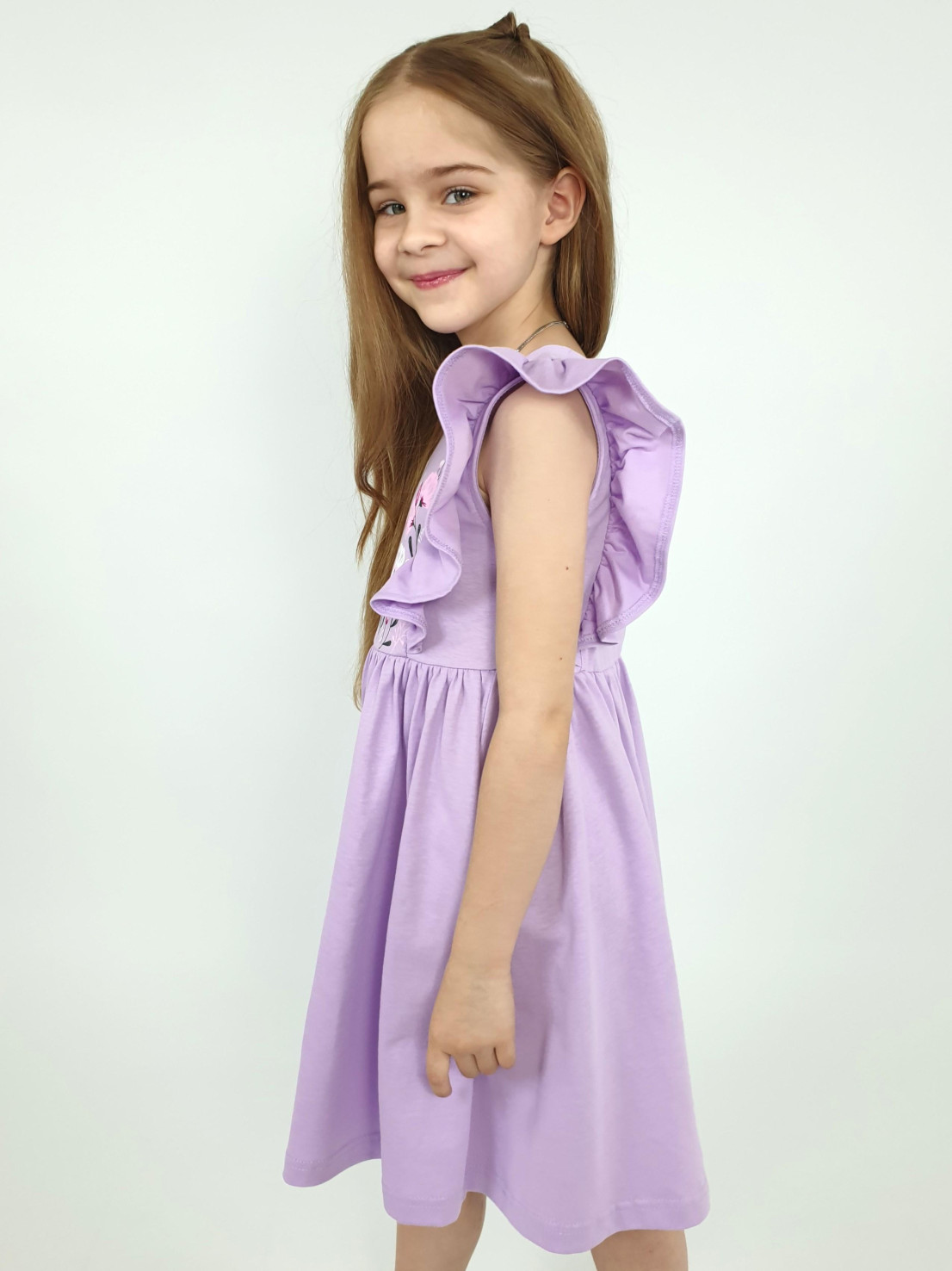 Летнее платье для девочки выполнено из качественного кулирного полотна (100% хлопок). Модель полуприлегающего силуэта ,декорирована цветочным принтом с рюшами .Удобная застёжка по спинке на пуговицы .Такое платье идеально подойдёт как на каждый день, так и при особых случаях. Материал легкий, приятный на ощупь, устойчивый к частым стиркам.