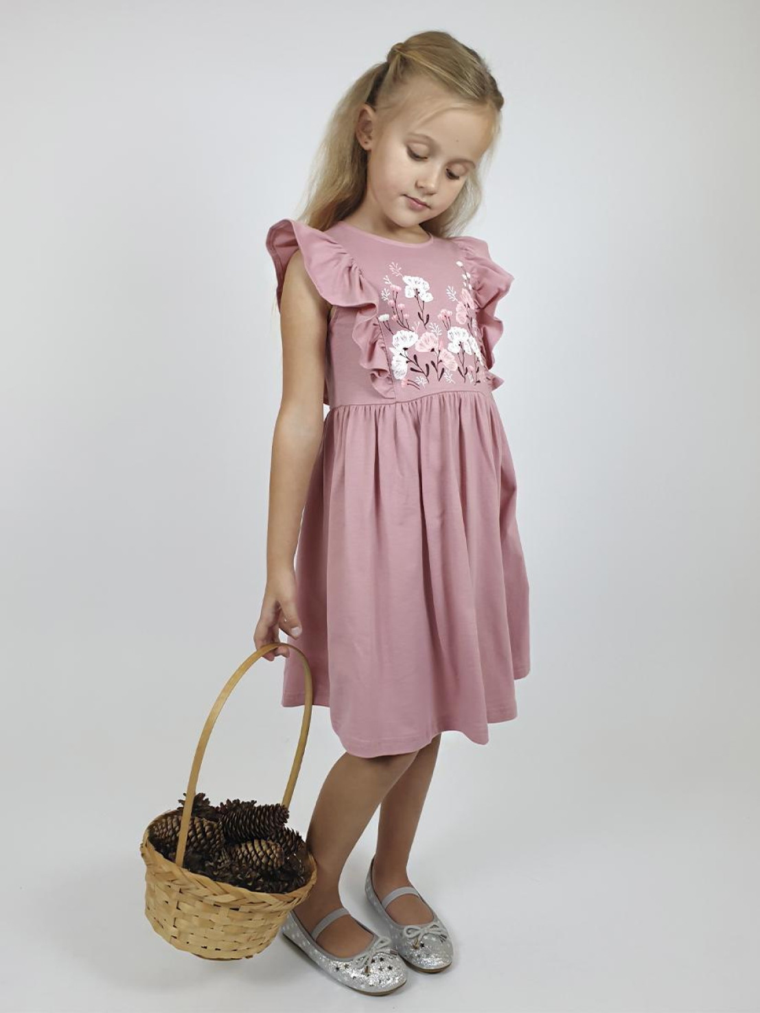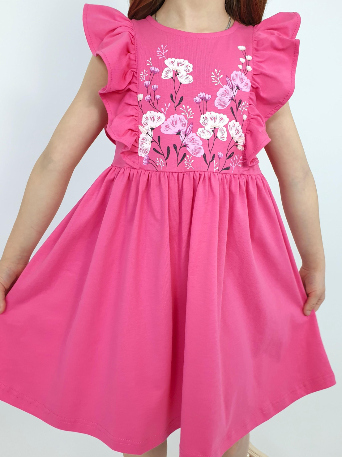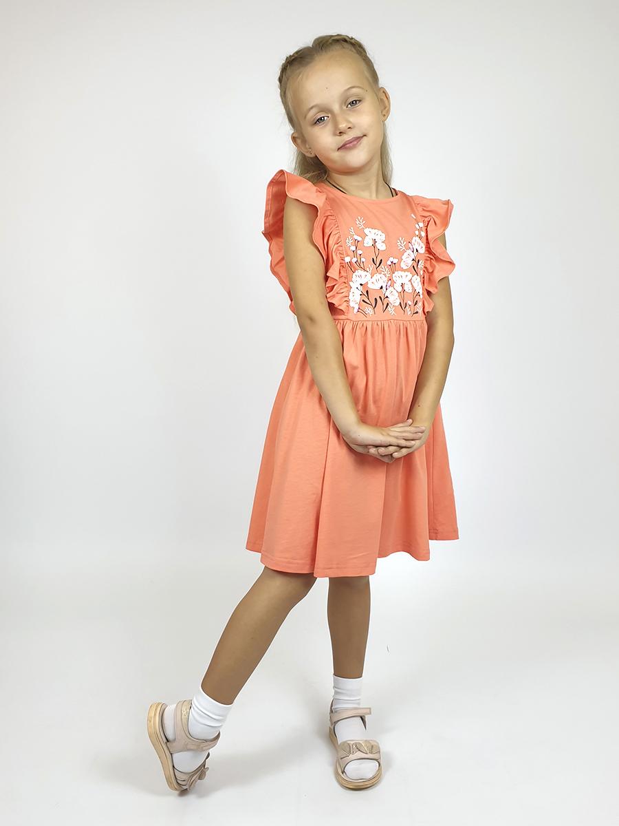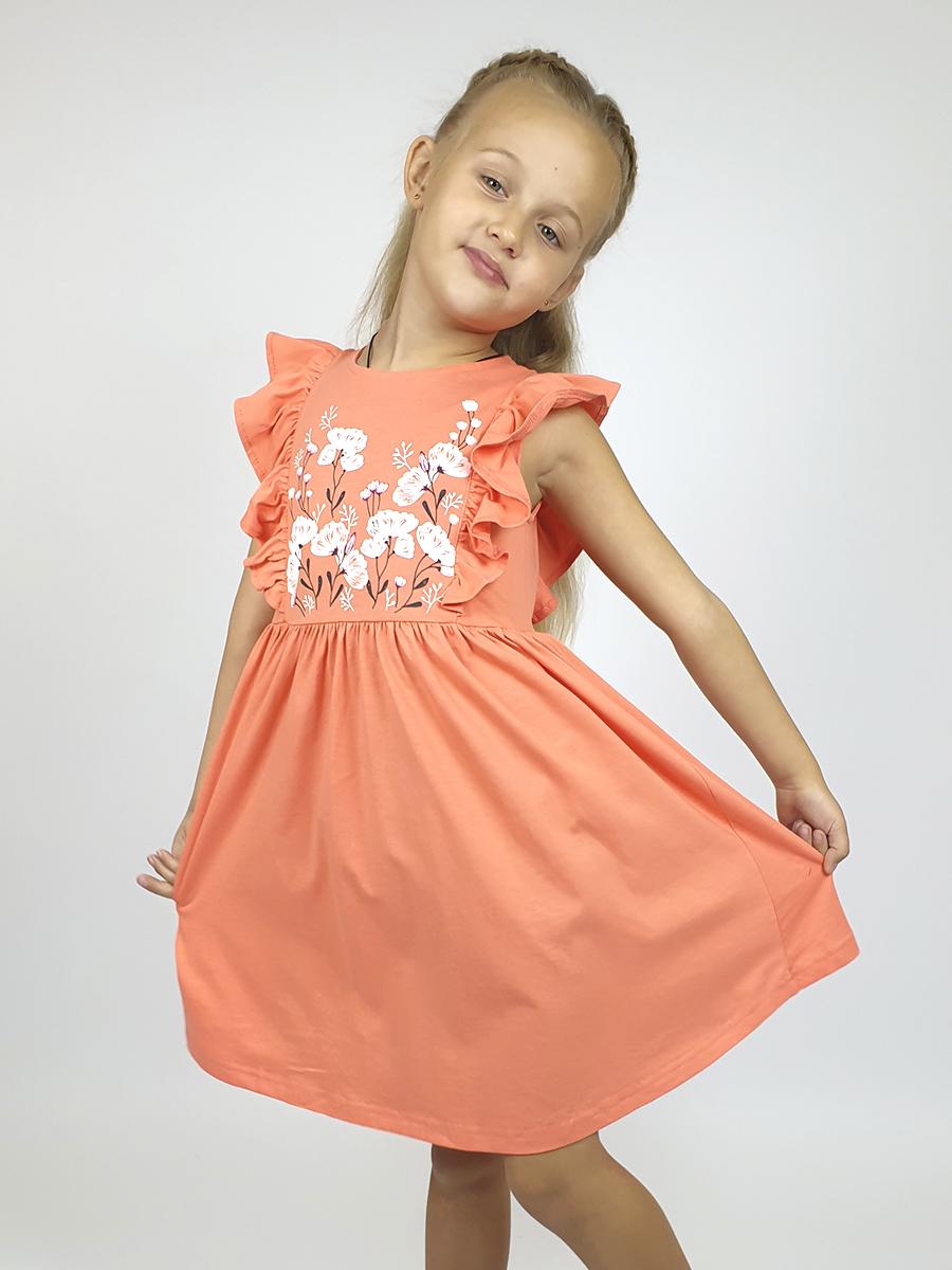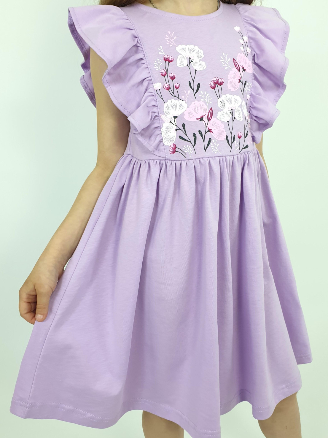 Летнее платье для девочки выполнено из качественного кулирного полотна (100% хлопок). Модель полуприлегающего силуэта ,декорирована цветочным принтом с рюшами .Удобная застёжка по спинке на пуговицы .Такое платье идеально подойдёт как на каждый день, так и при особых случаях. Материал легкий, приятный на ощупь, устойчивый к частым стиркам.