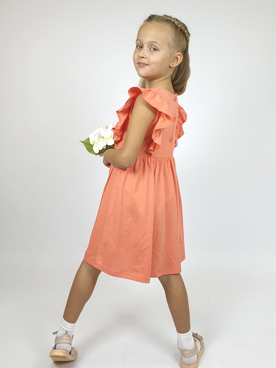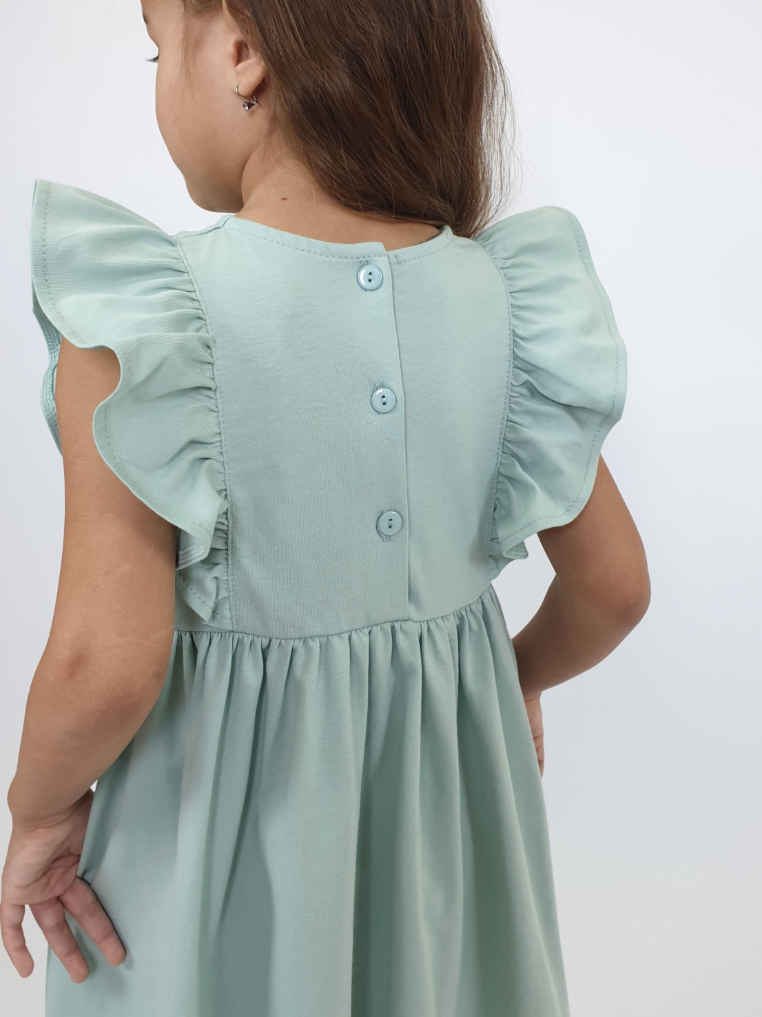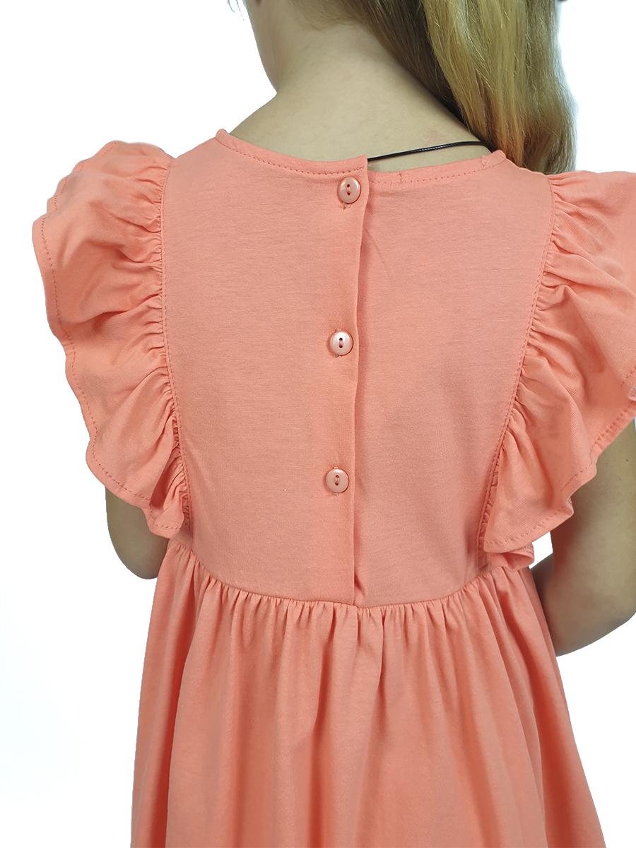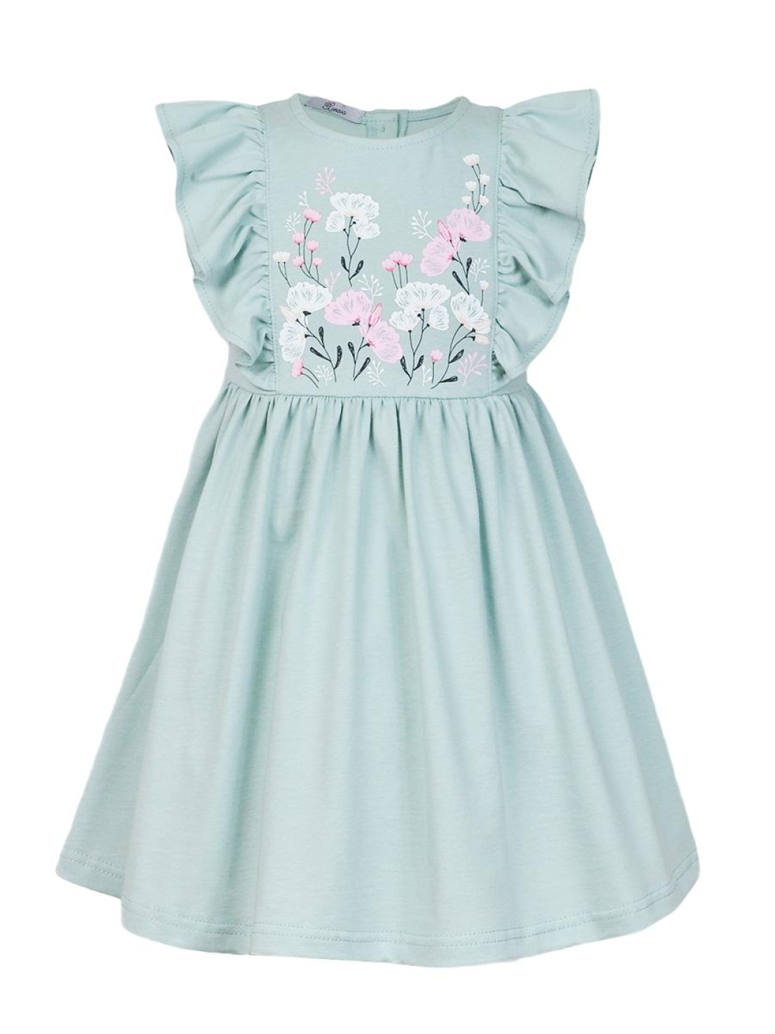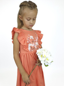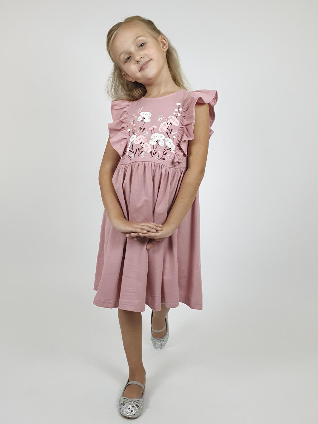 Летнее платье для девочки выполнено из качественного кулирного полотна (100% хлопок). Модель полуприлегающего силуэта ,декорирована цветочным принтом с рюшами .Удобная застёжка по спинке на пуговицы .Такое платье идеально подойдёт как на каждый день, так и при особых случаях. Материал легкий, приятный на ощупь, устойчивый к частым стиркам.