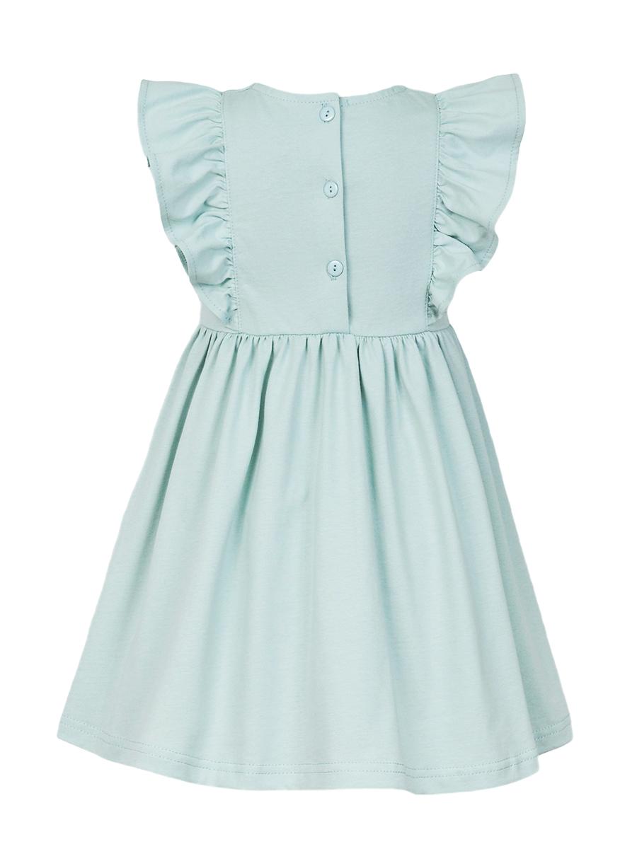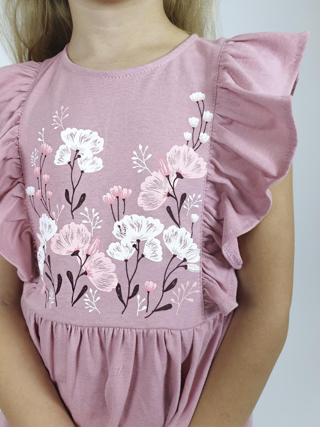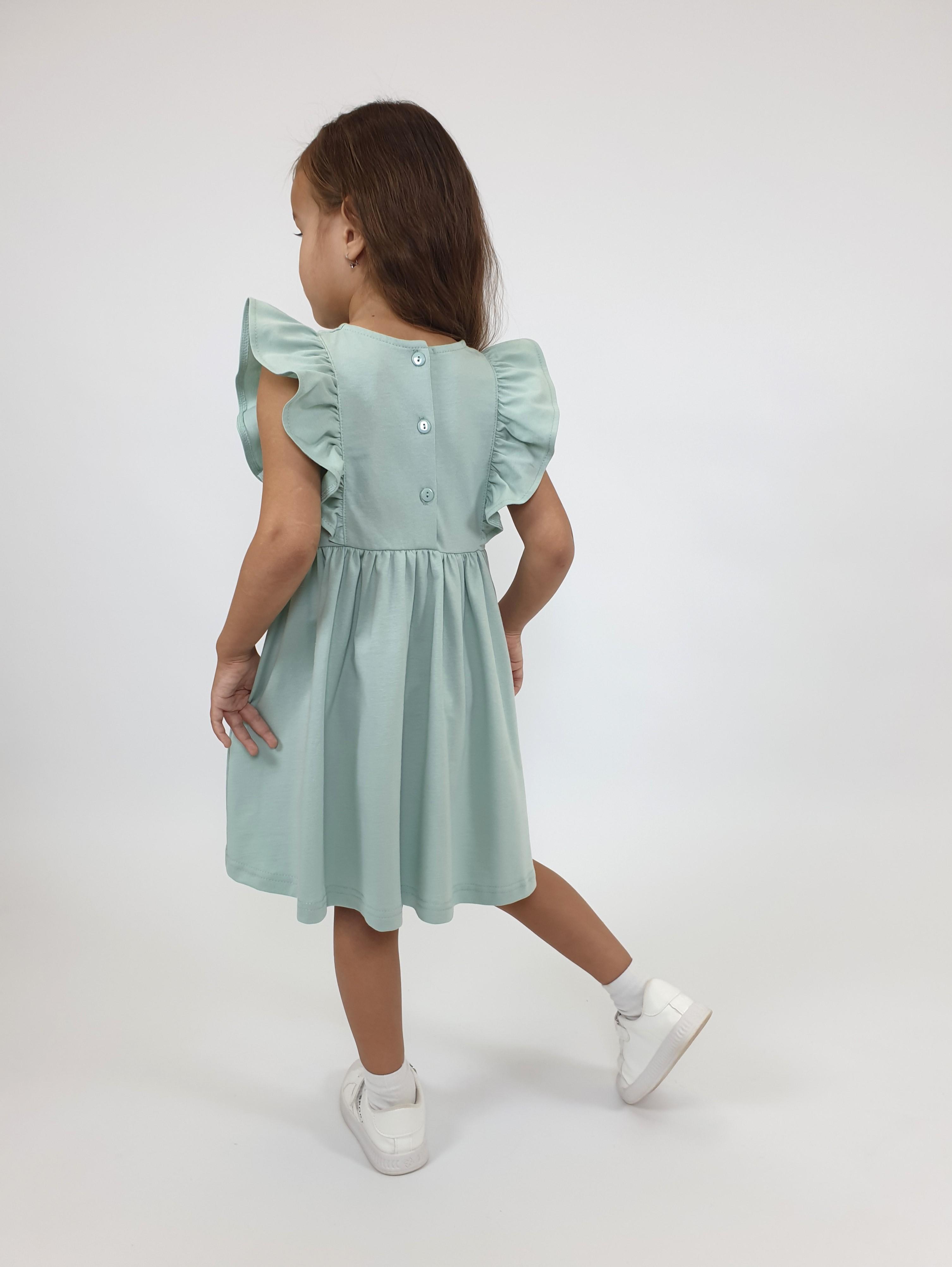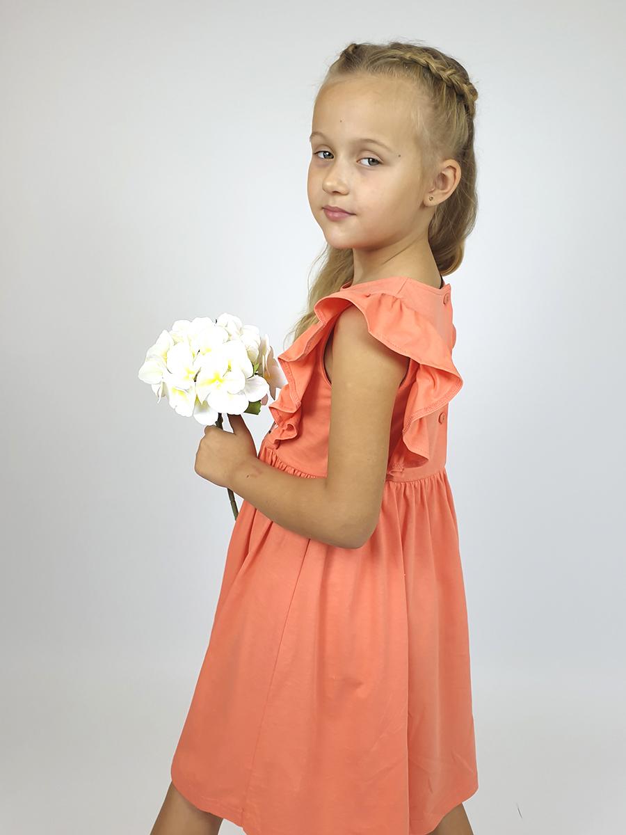 Летнее платье для девочки выполнено из качественного кулирного полотна (100% хлопок). Модель полуприлегающего силуэта ,декорирована цветочным принтом с рюшами .Удобная застёжка по спинке на пуговицы .Такое платье идеально подойдёт как на каждый день, так и при особых случаях. Материал легкий, приятный на ощупь, устойчивый к частым стиркам.